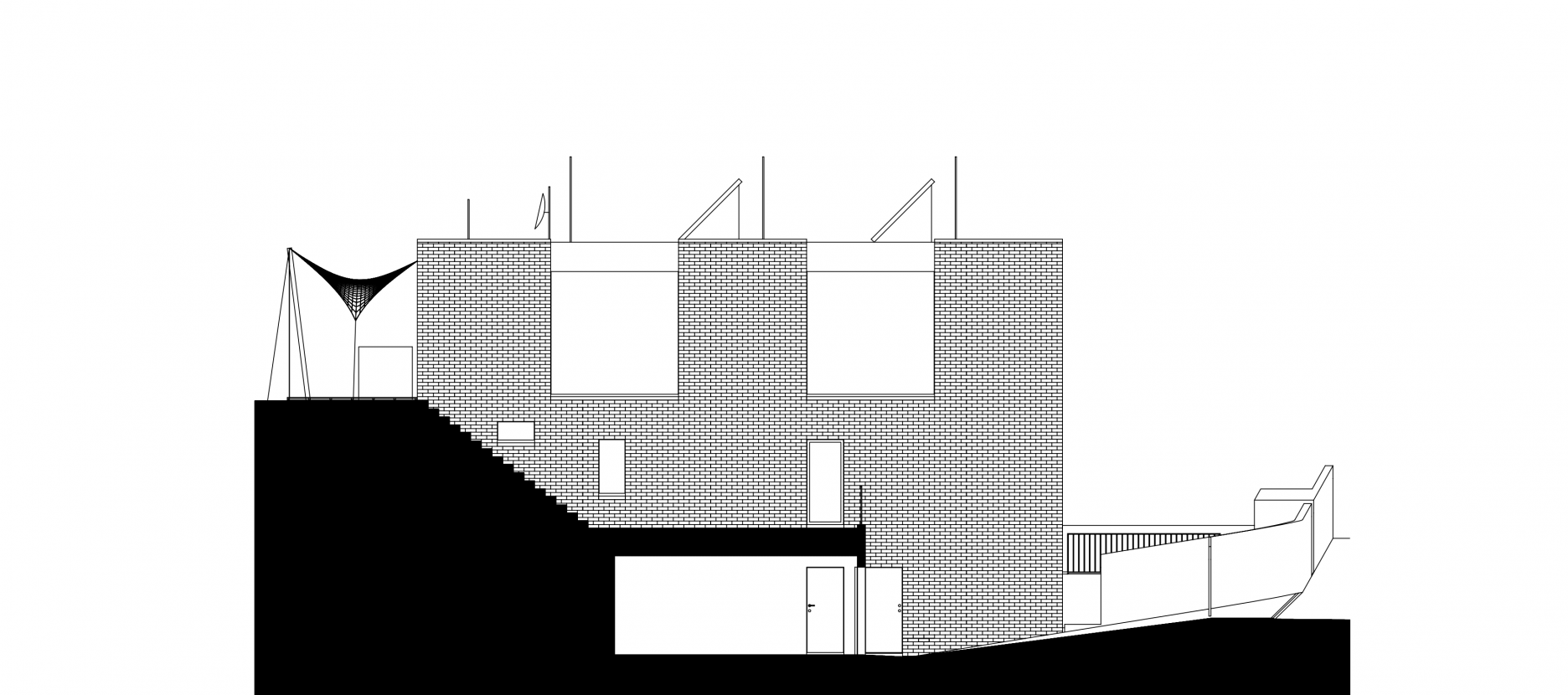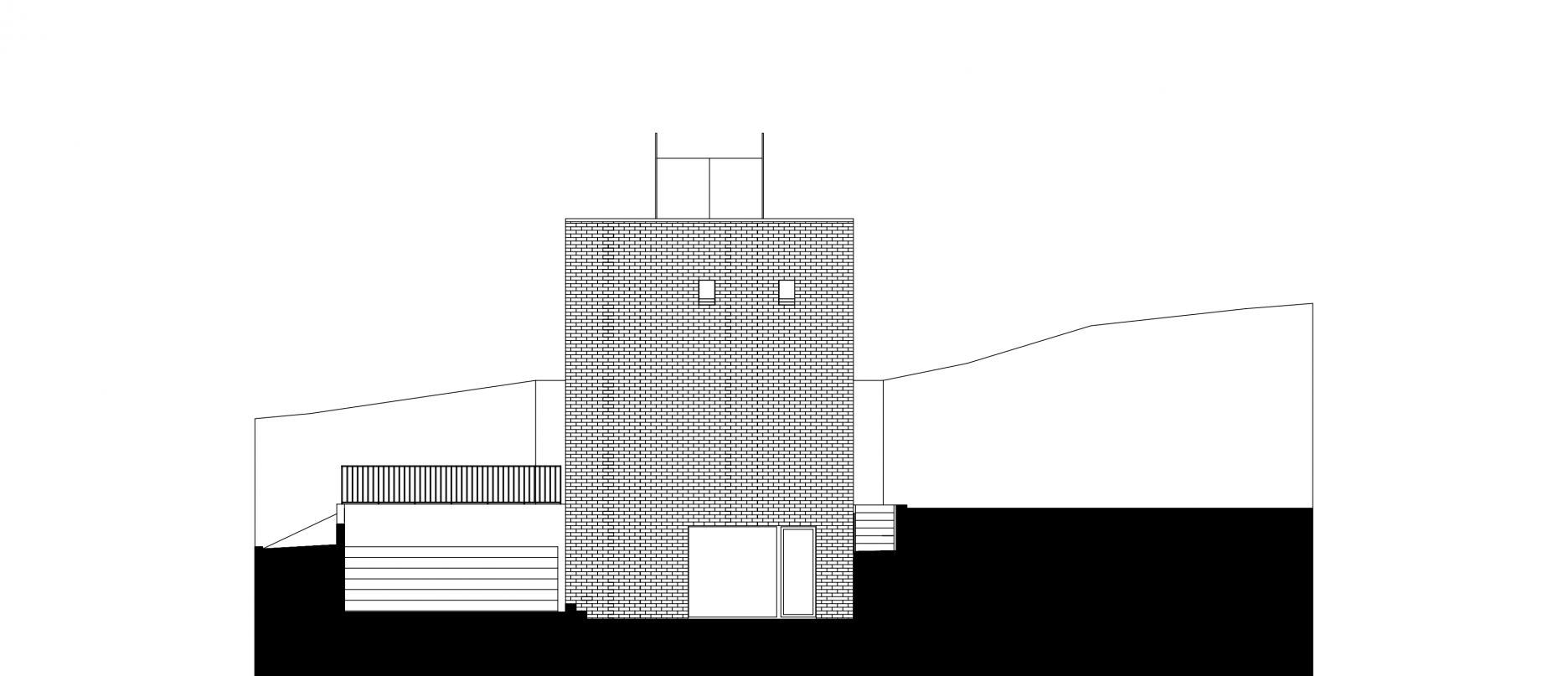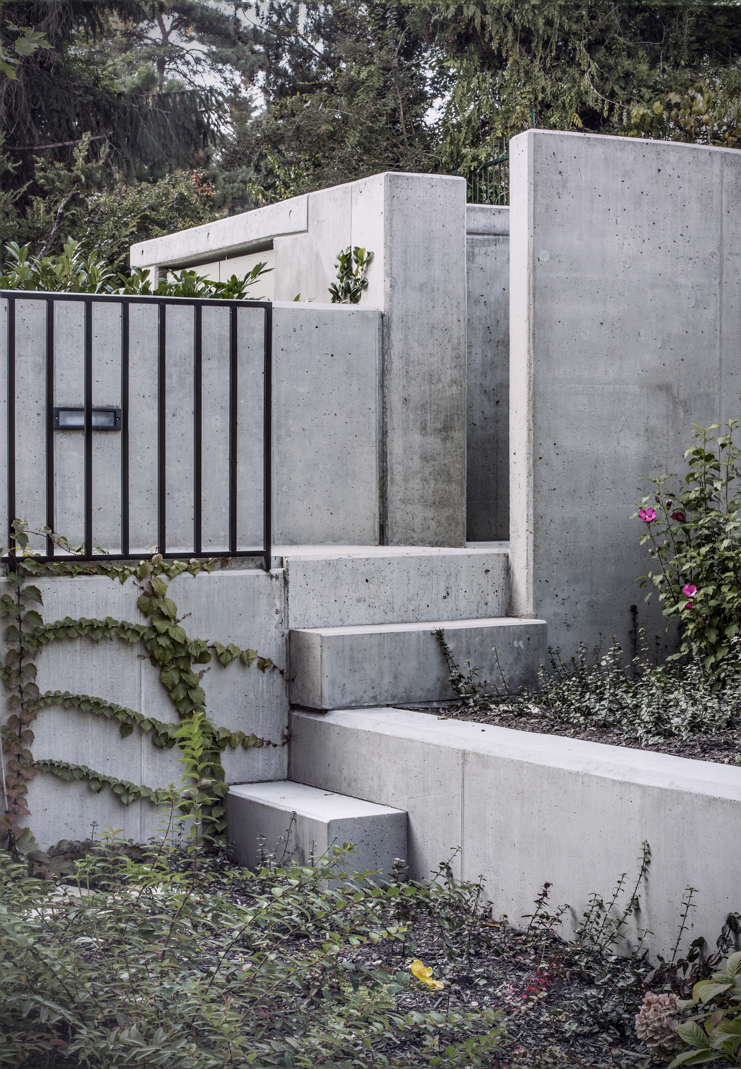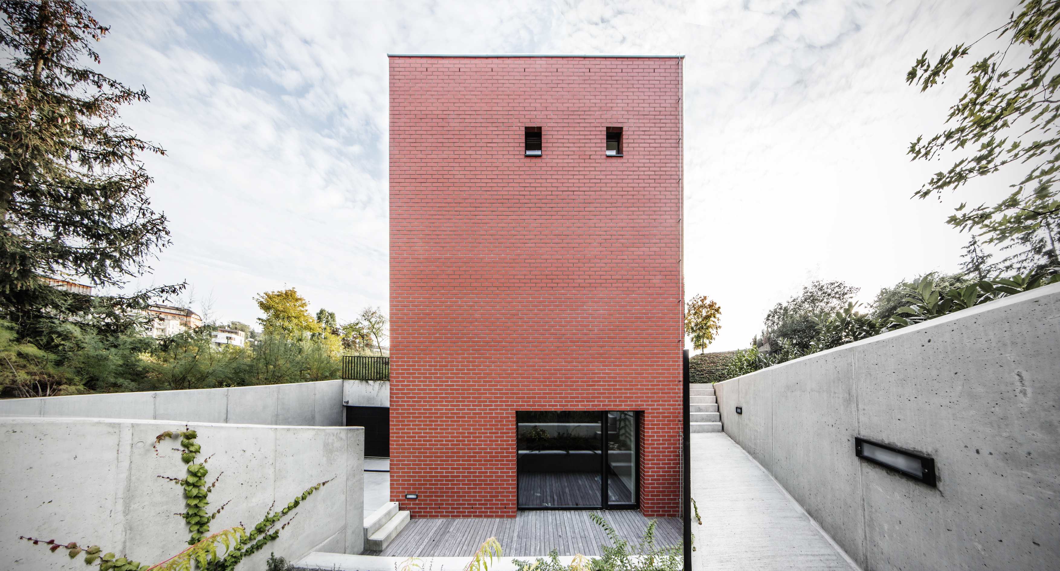 Obvodový plášť domu tvoria lícové tehly v prírodnej farebnosti. Oporné múry a steny garáže sú z pohľadového betónu. Okná, dvere a pevné presklené časti sú vsadené do čiernych hliníkových rámov. Rovnakú farbu majú tiež garážové brány, oplechovanie a ostatné kovové detaily. Väčšina presklených plôch je vybavená vonkajším tienením.