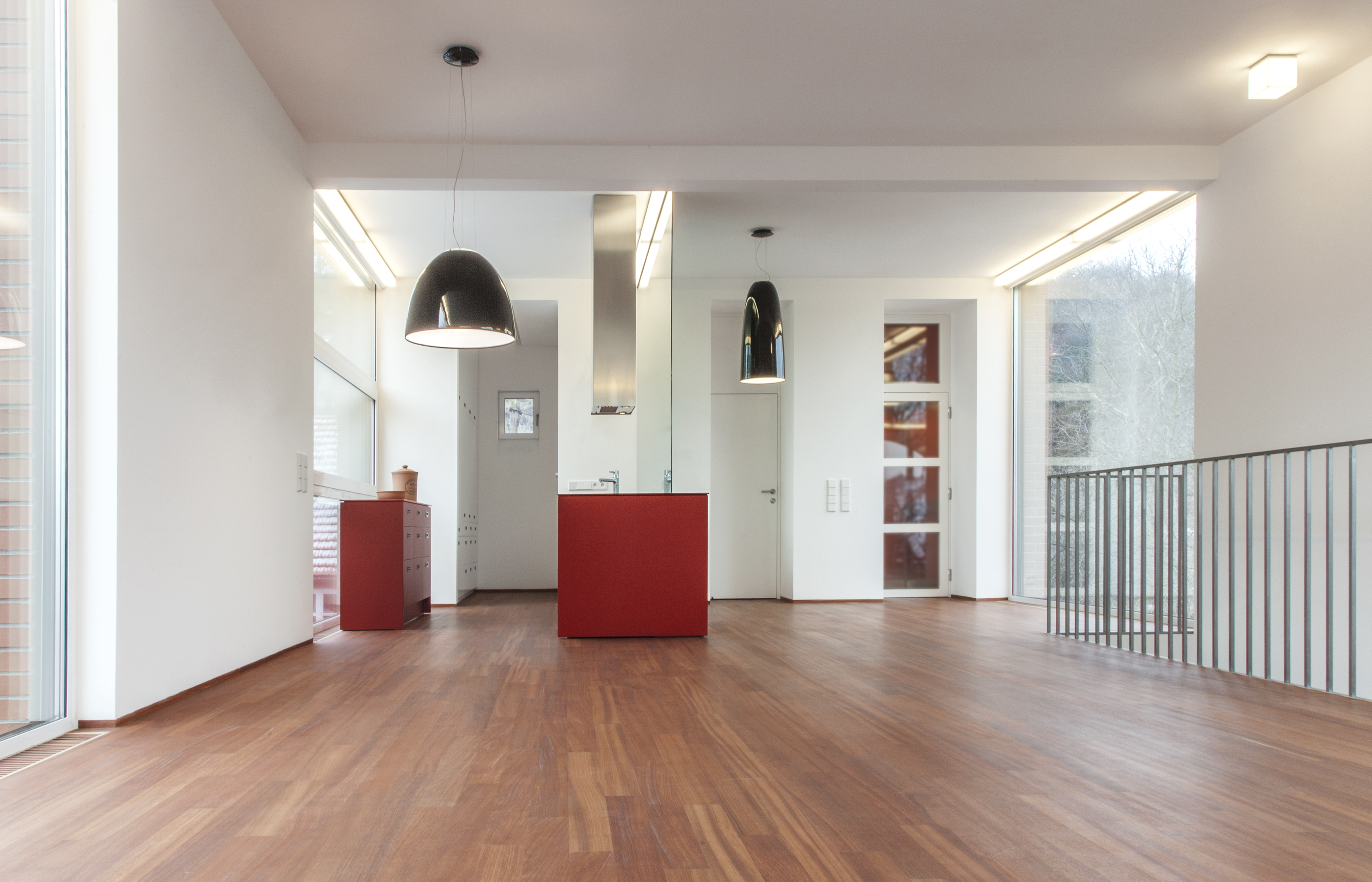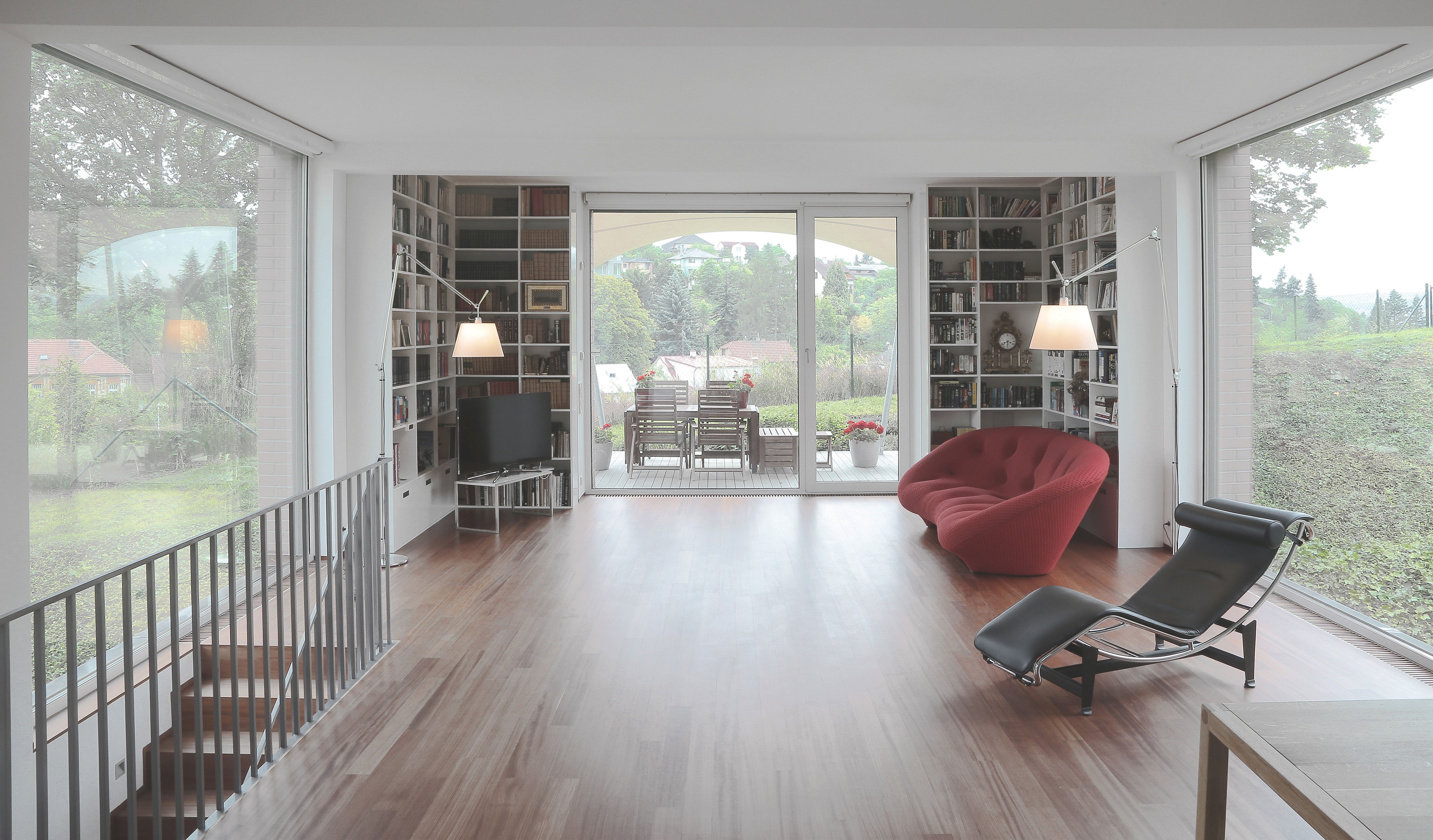 Tretie - najvyššie podlažie podlažie necháva naplno rozvinúť svoj spoločenský charakter. Otvorená dispozícia s veľkými presklenými plochami prepája obývaciu izba s kuchyňou a jedálňou. Miestnosť plná svetla je priamo prepojená s južnou terasou a ponúka výhľady na tri svetové strany.