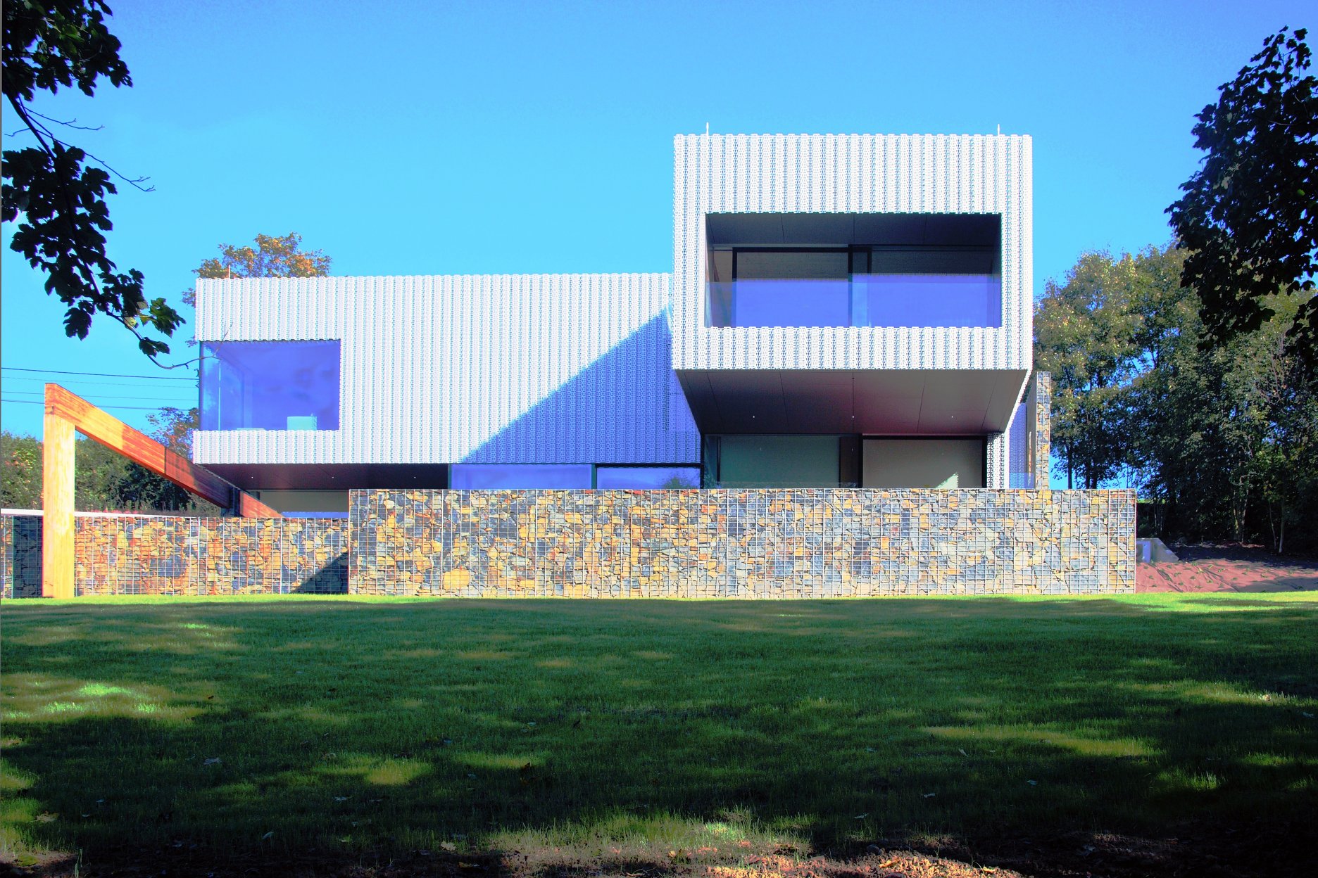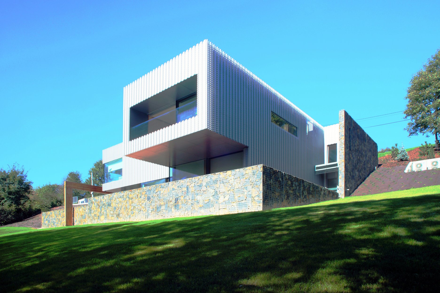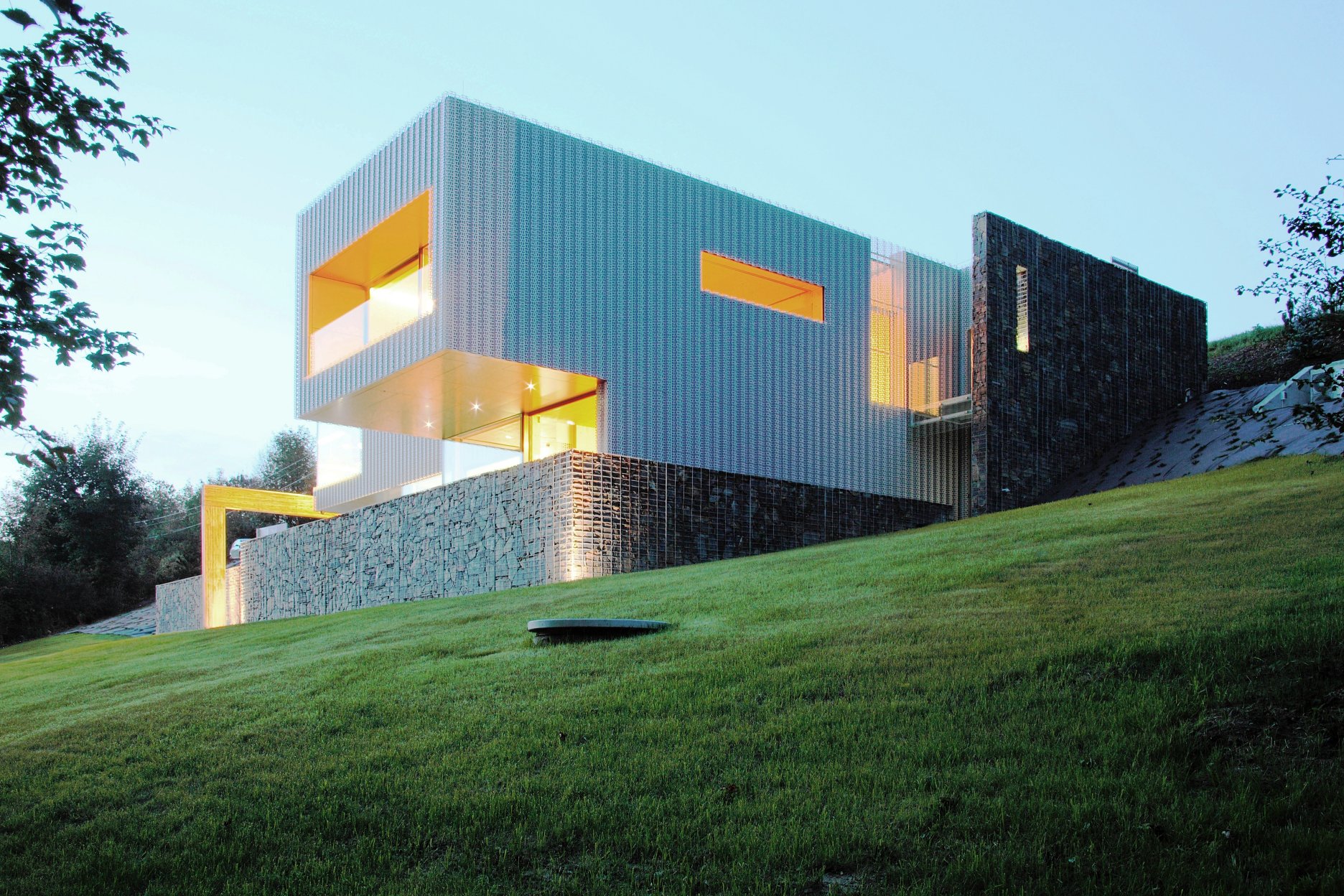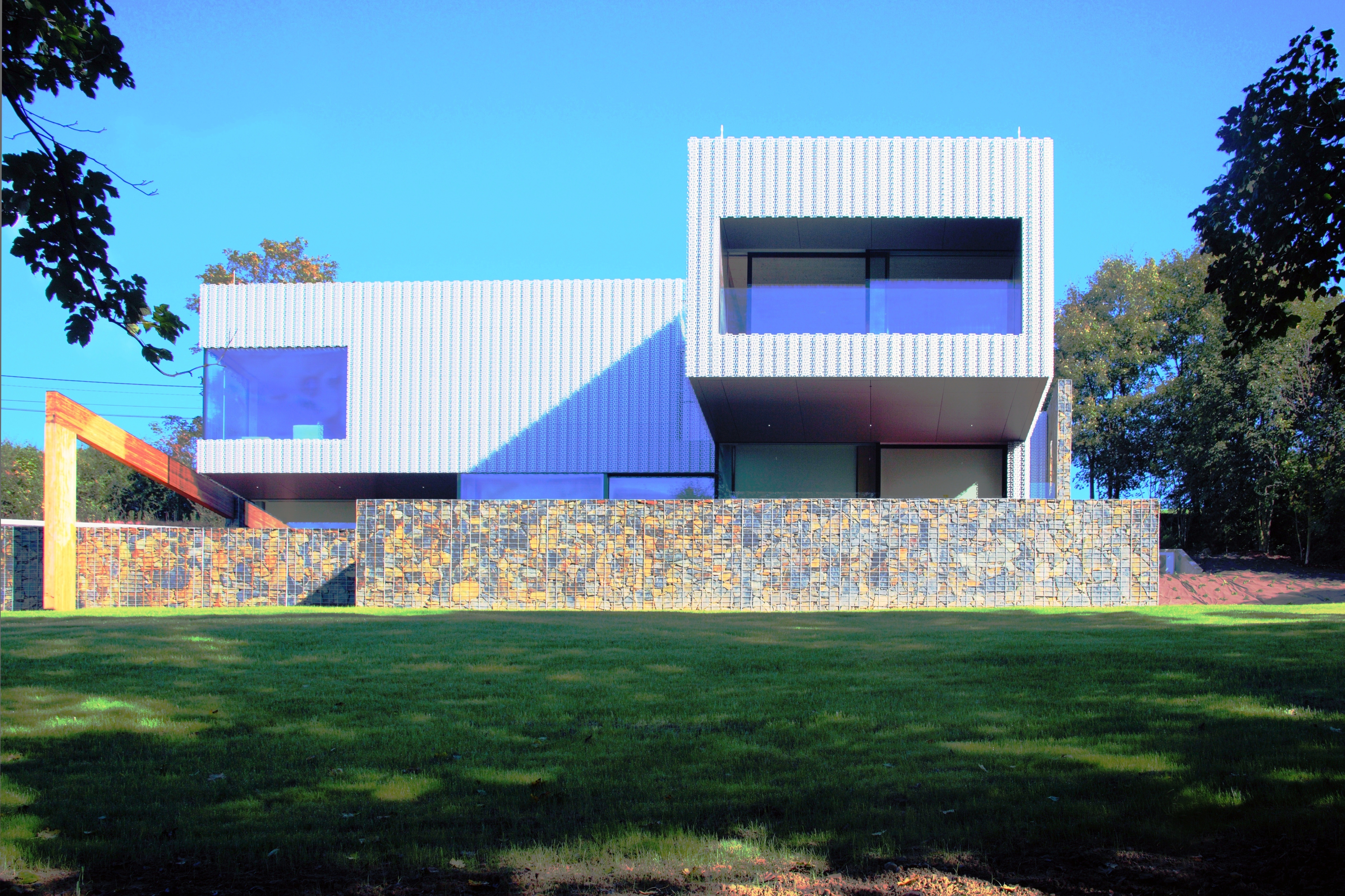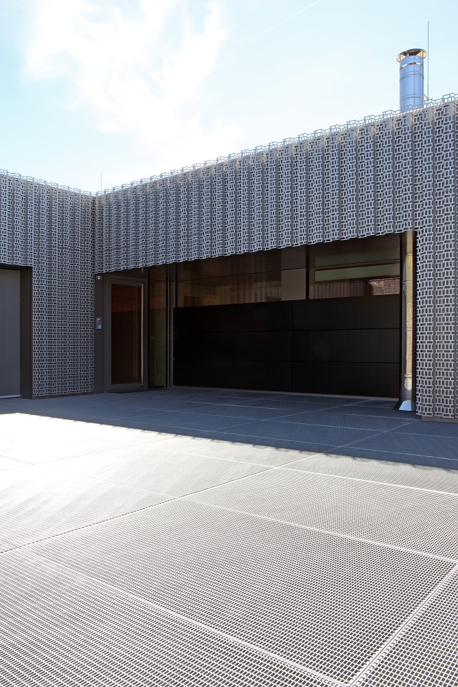 To však ťažko tušiť pri pohľade z ulice alebo zo záhrady. Fasáda z ohýbeného perforovaneho plechu pripomína čipkársku tradíciu regiónu. Tento prvok však nie je samoúčelný a neslúži iba na efekt. Profilovaný hliníkový plech - druhá koža objektu - slúži ako slnolam a chráni pred prehriatím poslednú obkladovú vrstvu z alucobondu. Zároveň funguje ako vetrolam. Bezúdržbový exteriér dopĺňajú gabionové koše naplnené miestnym kameňom.