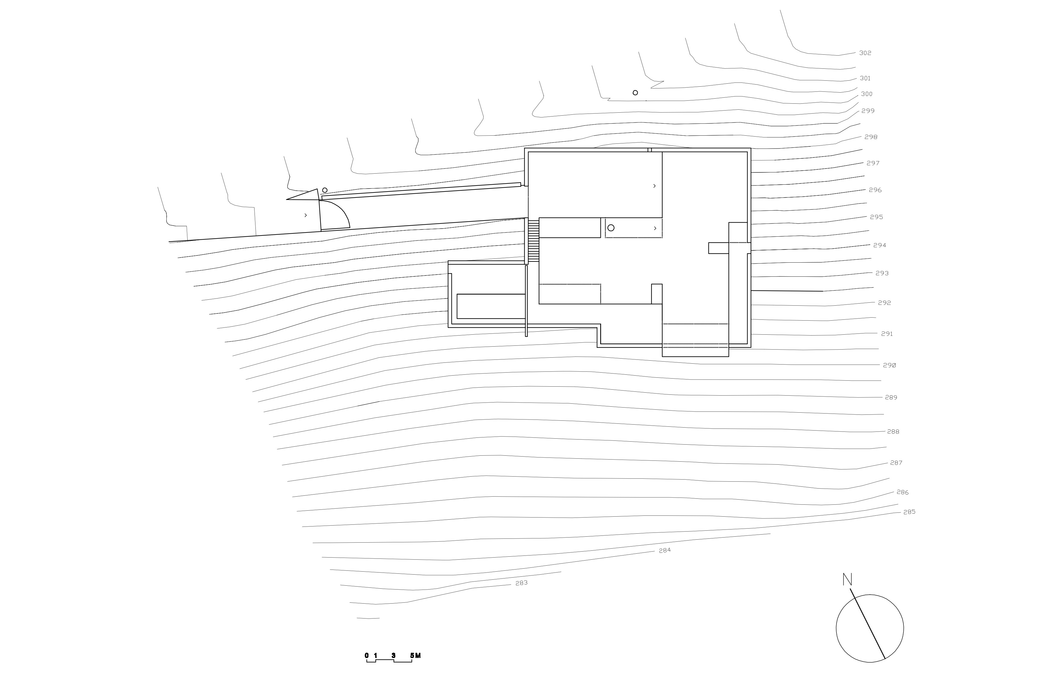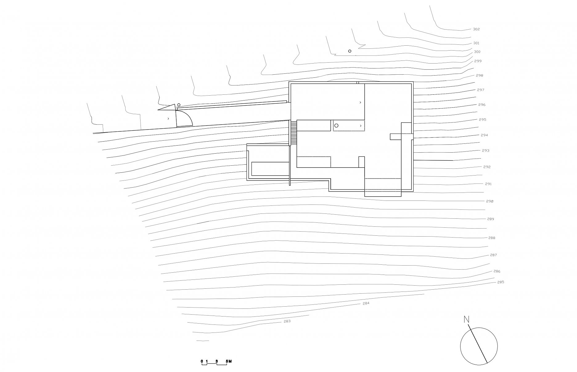 Vila stojí na hranici južne sa zvažujúceho pozemku s rozlohou viac ako šesťtisíc metrov štvorcových. Parcela ukončená v spodnej časti vzrastlým lesom je súčasťou svahu, ktorý klesá k neďalekej priehrade. Kľúčové pri tvorbe v takomto prostredí je osadenie, ktoré vo výsledku ovplyvní nielen prevádzku objektu ale aj jeho výslednú energetickú bilanciu. Architekt tiež niesol značnú zodpovednosť, keďže ide o jednu z najväčších stavieb v obci. Hneď po bývalej škole, alebo pamiatke ľudovej architektúry - drevenom evanjelickom kostolíku z roku 1783, ktorý je tiež v priamom vizuálnom kontakte s domom. Osadenie stavby v najvyššej časti pozemku umožňuje jednoduchý prístup a otvára pohľady do krajiny. Vykonzolovaná hmota poschodia prekrýva terasu, ktorá nadväzuje na svahovitú záhradu.