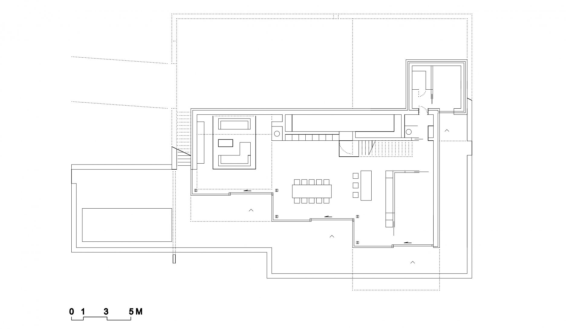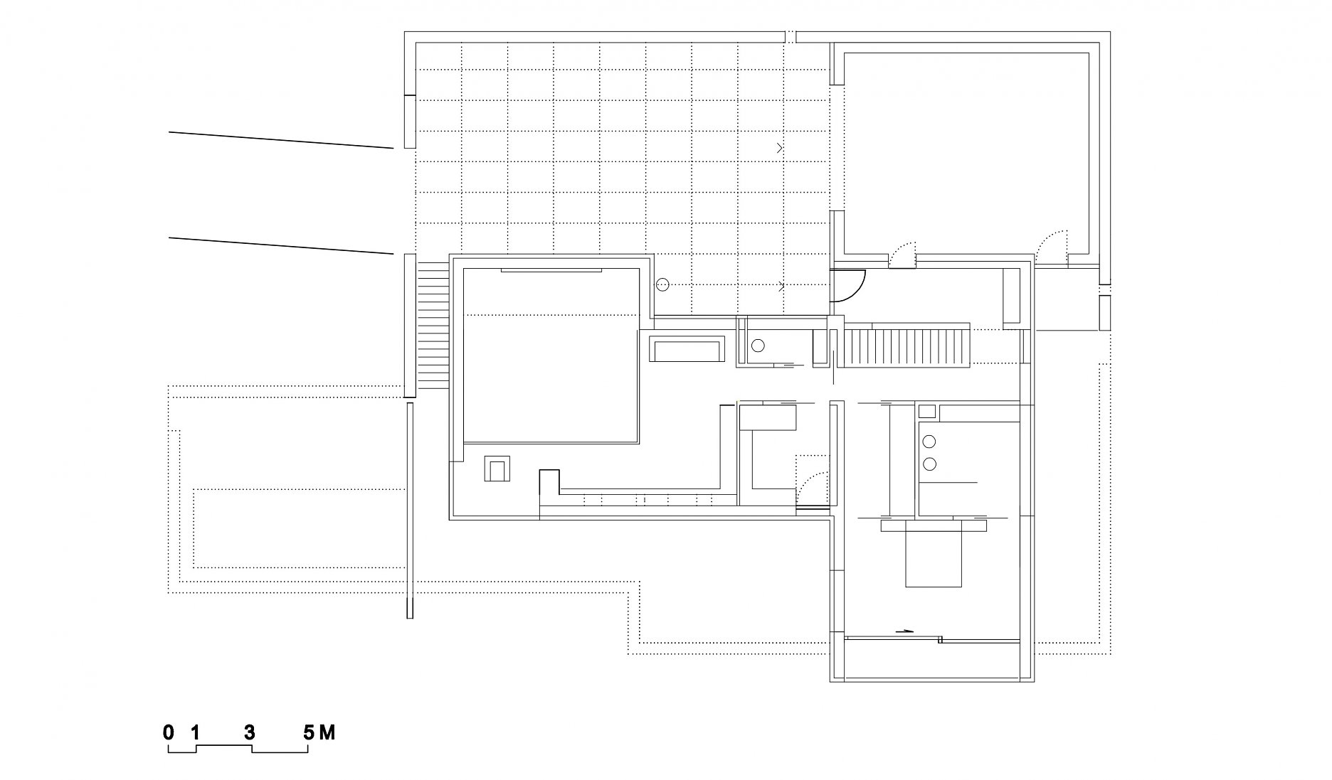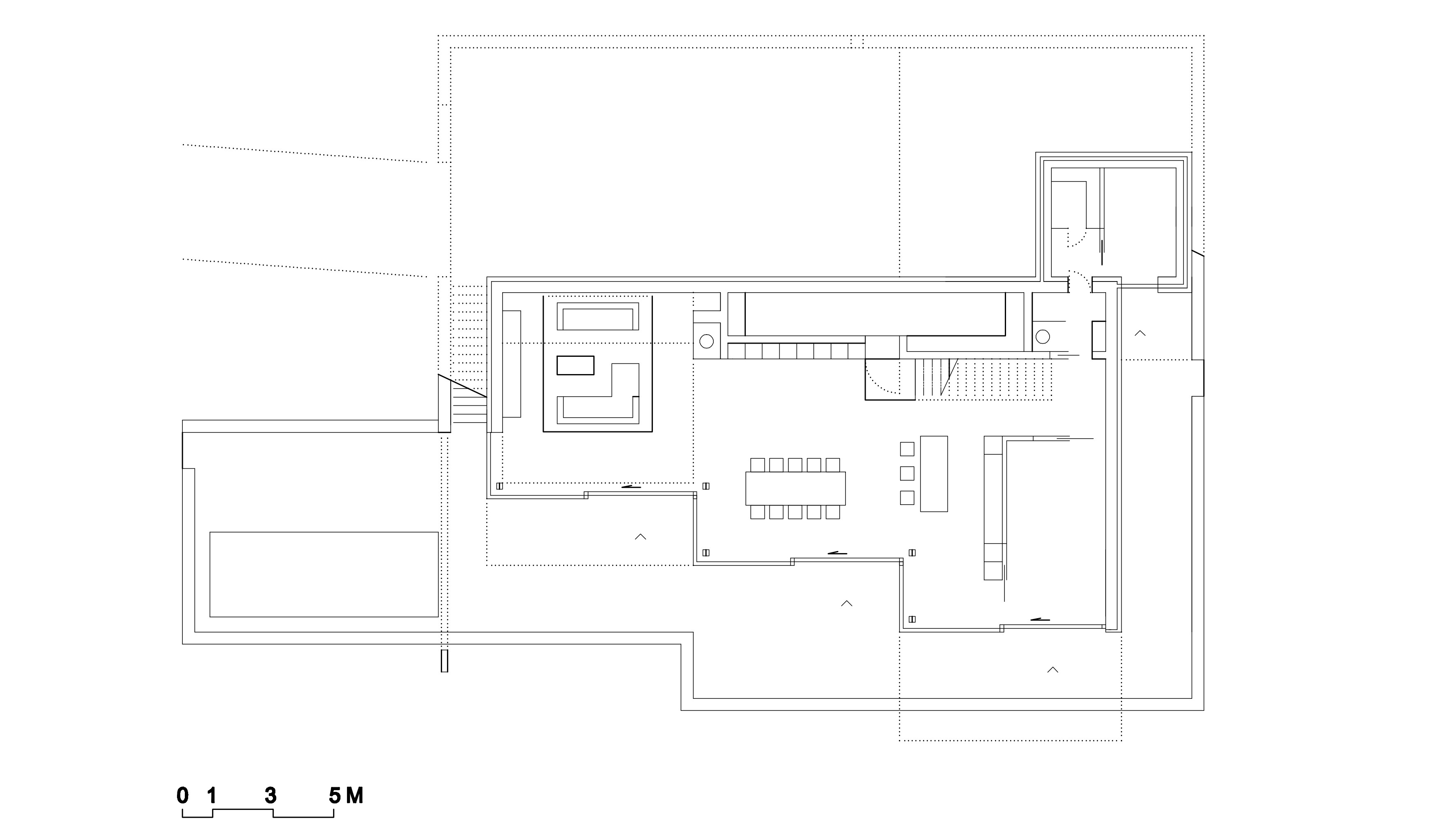 Prevádzka domu je vertikálne členená na dve časti. Nočná zóna je na poschodí a hlavná obytná časť je situovaná o úroveň nižšie. Obytné miestnosti sú orientované na juh, naopak na sever smeruje vstupný dvor, garáž a hospodárske priestory domu. V juhozápadnej časti domu priestorová koncepcia graduje dvojpodlažným obytným priestorom s galériou, knižnicou a rohovým oknom s výhľadom na blízky evanjelický kostolík.