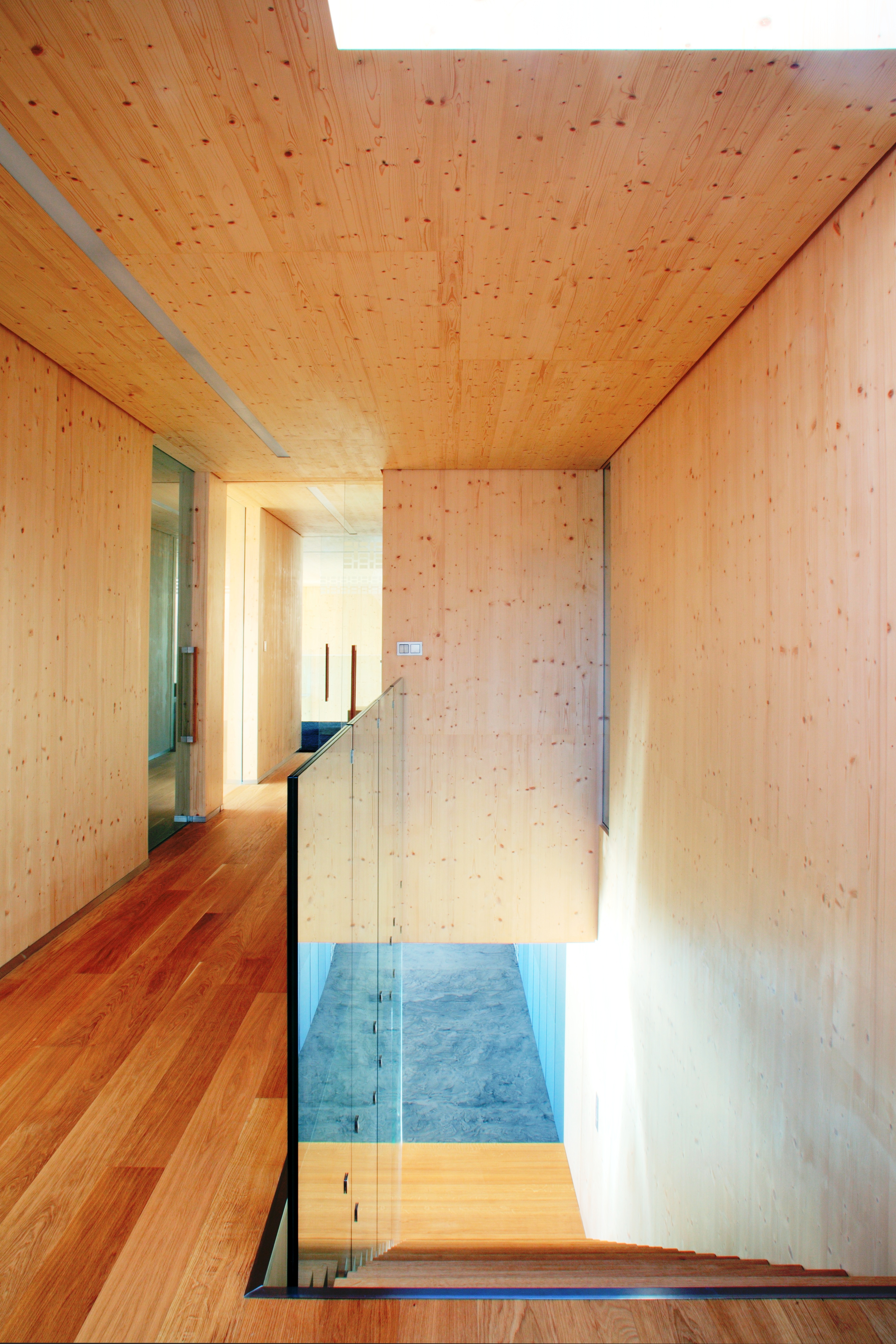Kostru objektu tvorí drevená konštrukcia z krížom laminovaných drevených panelov kombinovaných s oceľovými nosnými prvkami. V súčasnosti čoraz obľúbenejšie riešenie umožnilo architektovi vyložiť nad terasu niekoľkometrovú konzolu s lodžiou a pracovať s variáciou na „plan libre“. Rozmerné zasklenie umožňuje nerušený výhľad do krajiny, ktorý bol jednou z priorít návrhu. Konštrukčná podstata domu je priamo čitateľná v interiéri. Drevená obálka obytných miestností je doplnená drevenou podlahou, schodiskom, či nábytkom s prírodnou kresbou dreva.