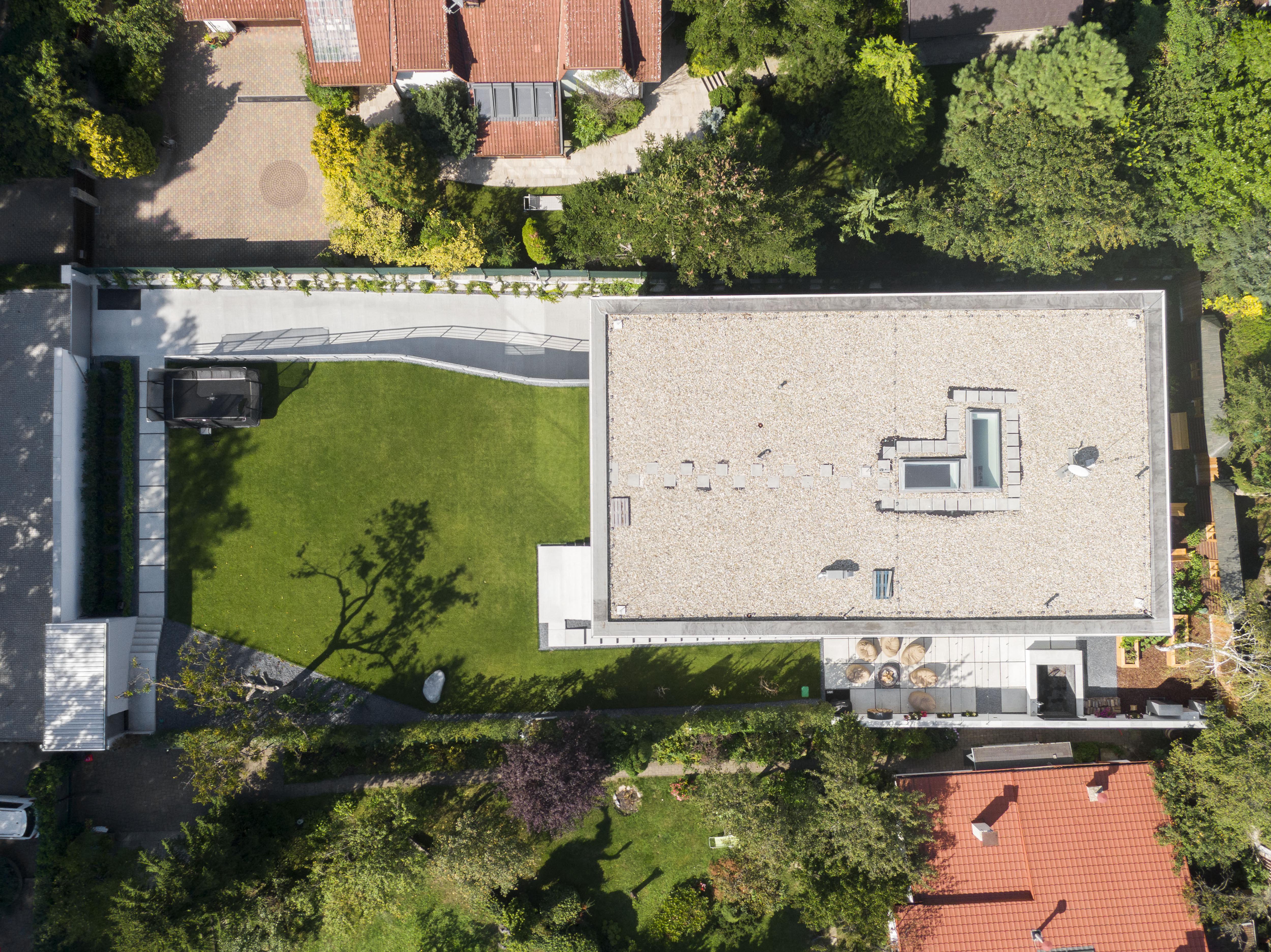 Charakteristickou črtou návrhu je prepojenie exteriéru a interiéru, ktoré sa deje na niekoľkých úrovniach. Hlavný obytný priestor je cez plne presklenú čelnú fasádu prepojený s terasou, záhradou aj s prírodnou kulisou Horského parku.