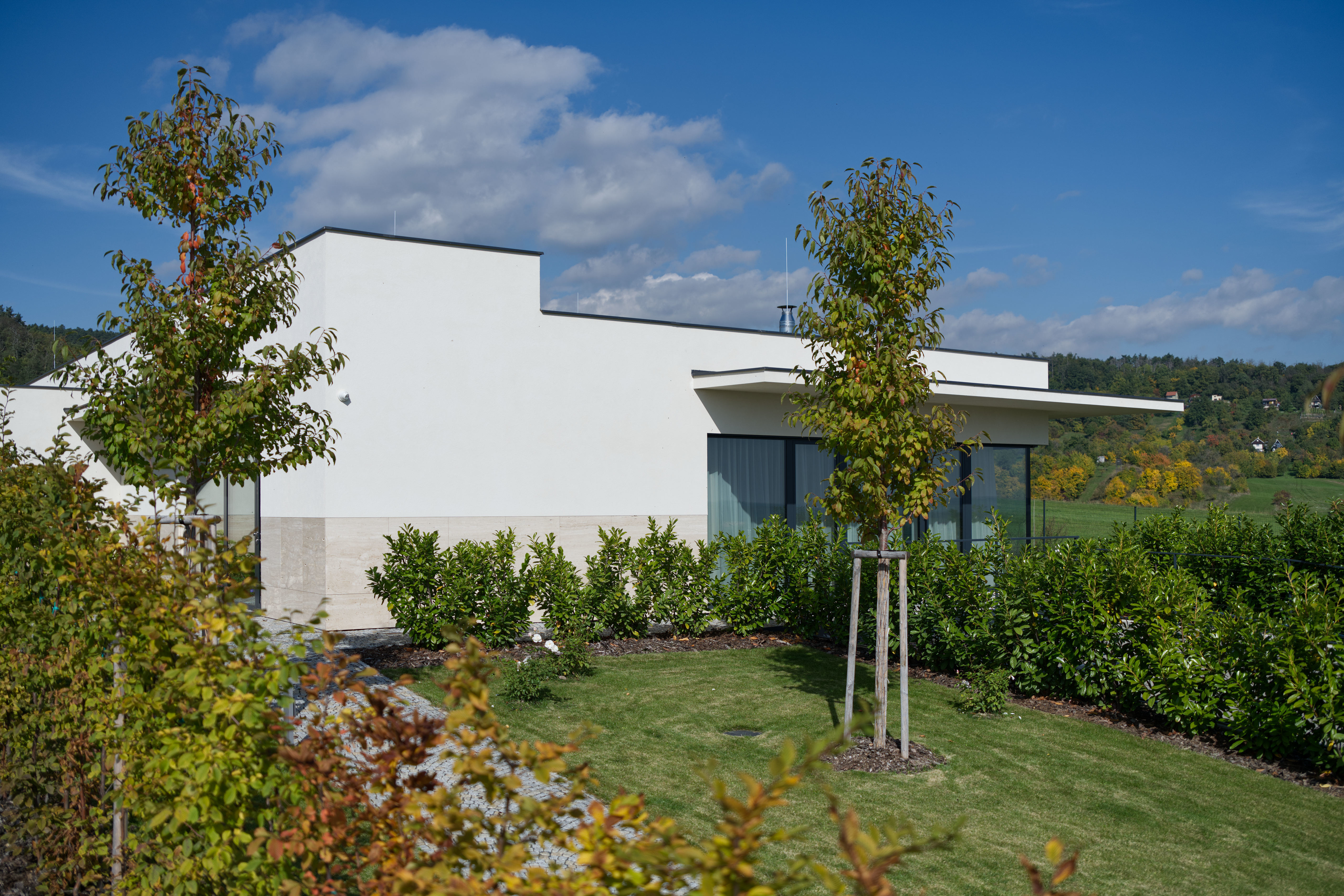 Tektoniku architektonického riešenia podporuje tlmená farebnosť fasád s minerálnou omietkou a výrazné travertínové sokle. Okná s hliníkovými profilmi, majú solídne betónové rímsy.