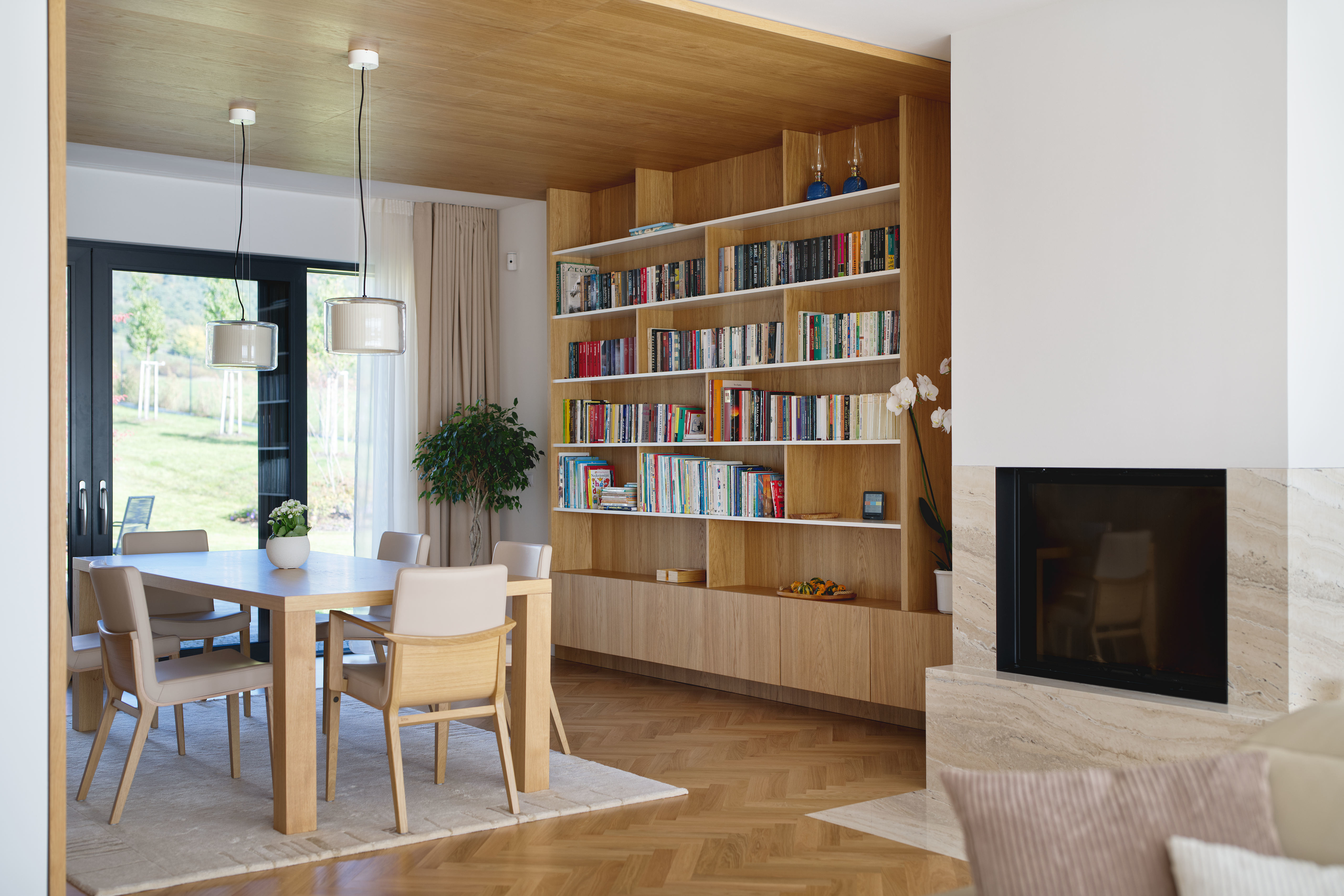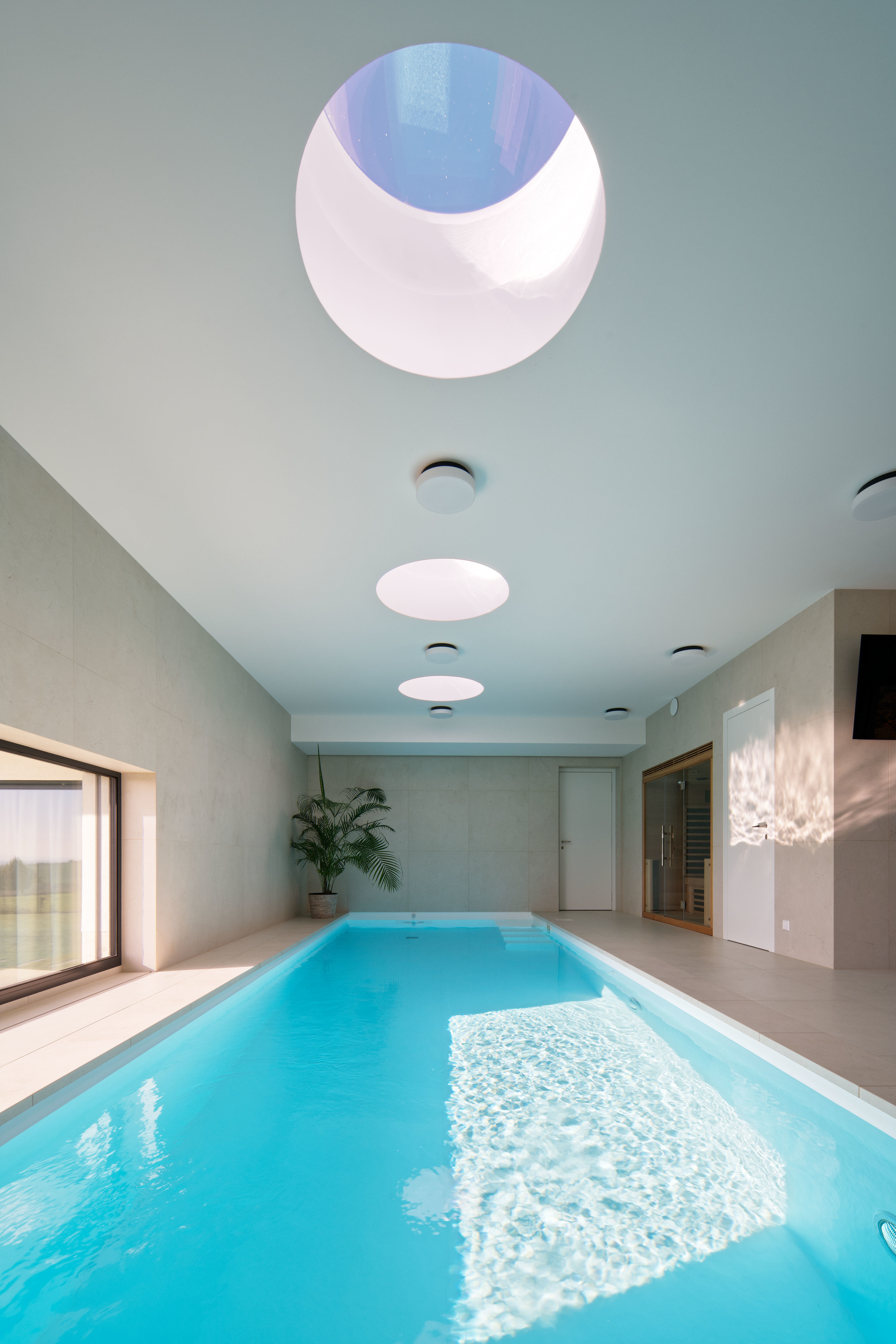 Na konci chodby, kopírujúcej priebeh terénu, situovali architekti vstup do bazénovej časti a TZB miestnosti. Wellness zóna s bazénom je priamo prepojená s terasou a záhradou za domom.