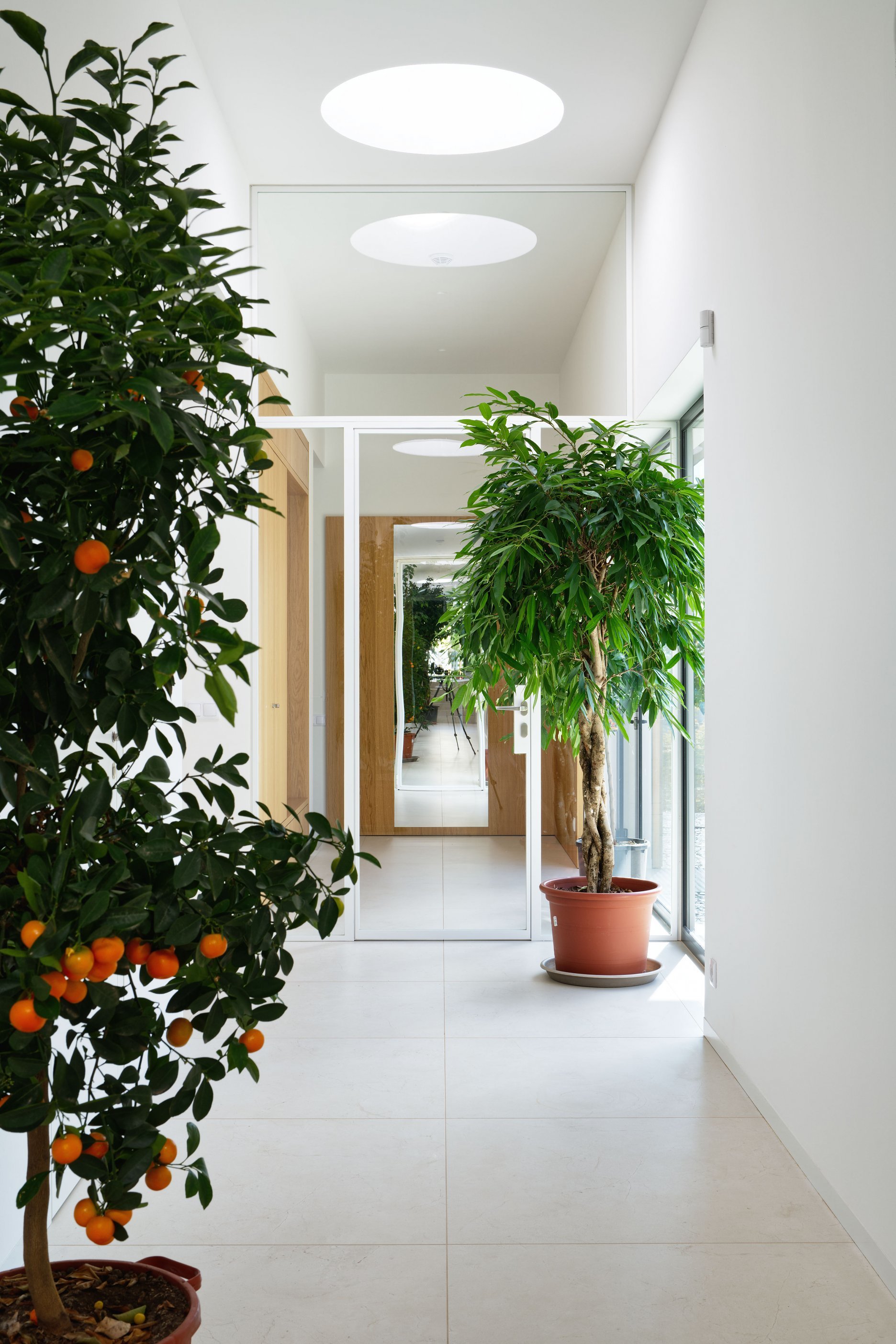 Prístup k objektu, odsadeného od cesty, vedie pozdĺž južnej hranice pozemku. Vydláždený chodník, kopírujúci mierny svah pozemku, sprístupňuje hlavný vstup do domu. Na zádverie nadväzuje vstupná hala a chodba, ktorá člení dispozíciu na obytný a obslužbslužný trakt. Hlavný obytný priestor zahŕňa obývačku s jedálenským kútom a otvorenú kuchyňu. Chodba ďalej sprístupňuje detské izby, spálňu rodičov, dve kúpeľne, šatník, miestnosť na domáce práce a technické zázemie domu. Spálne aj denná zóna domu majú priamy prístup do átria.