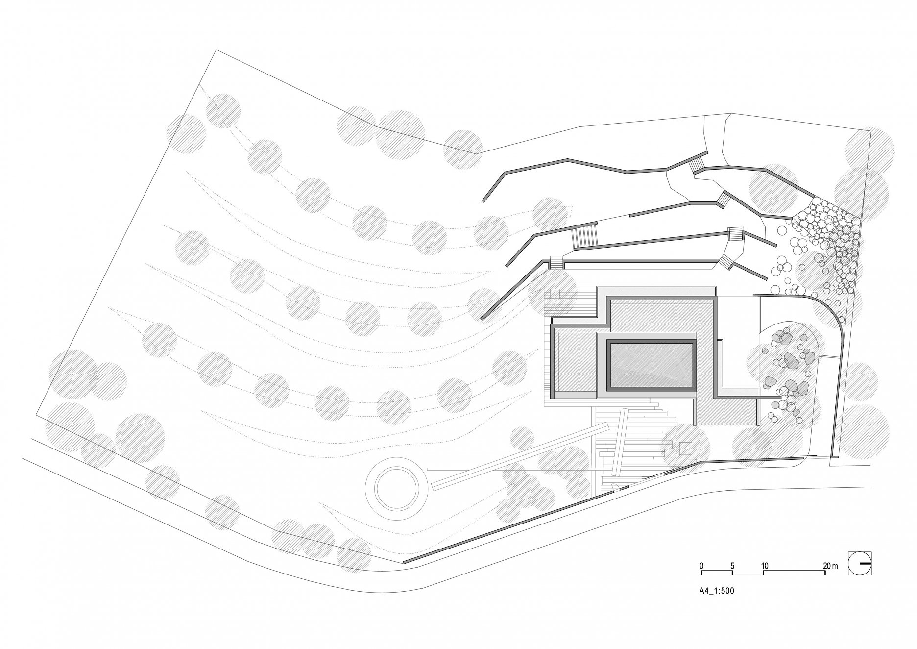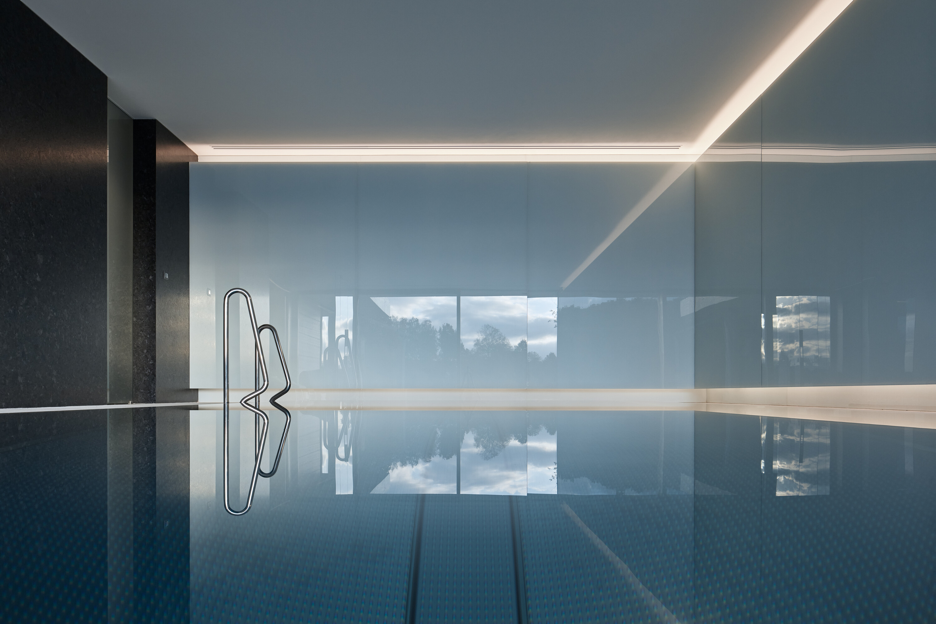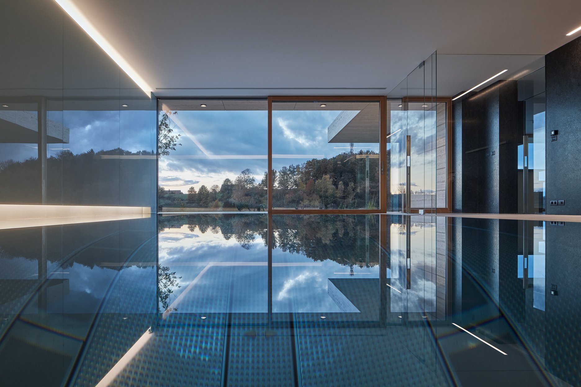 Dom má dve podlažia. Vyššiu úroveň využívajú hosťovské izby so samostatným vstupom a pracovňou. Spodné podlažie, čiastočne zapustené, hlavný obytný priestor, na ktorý nadväzuje garáž a krytý bazén.