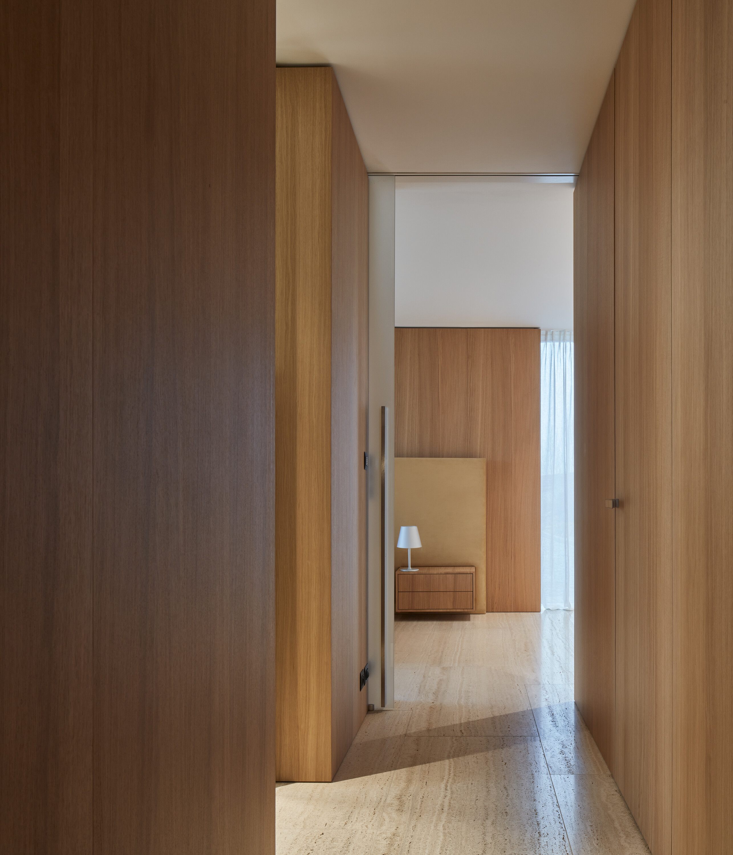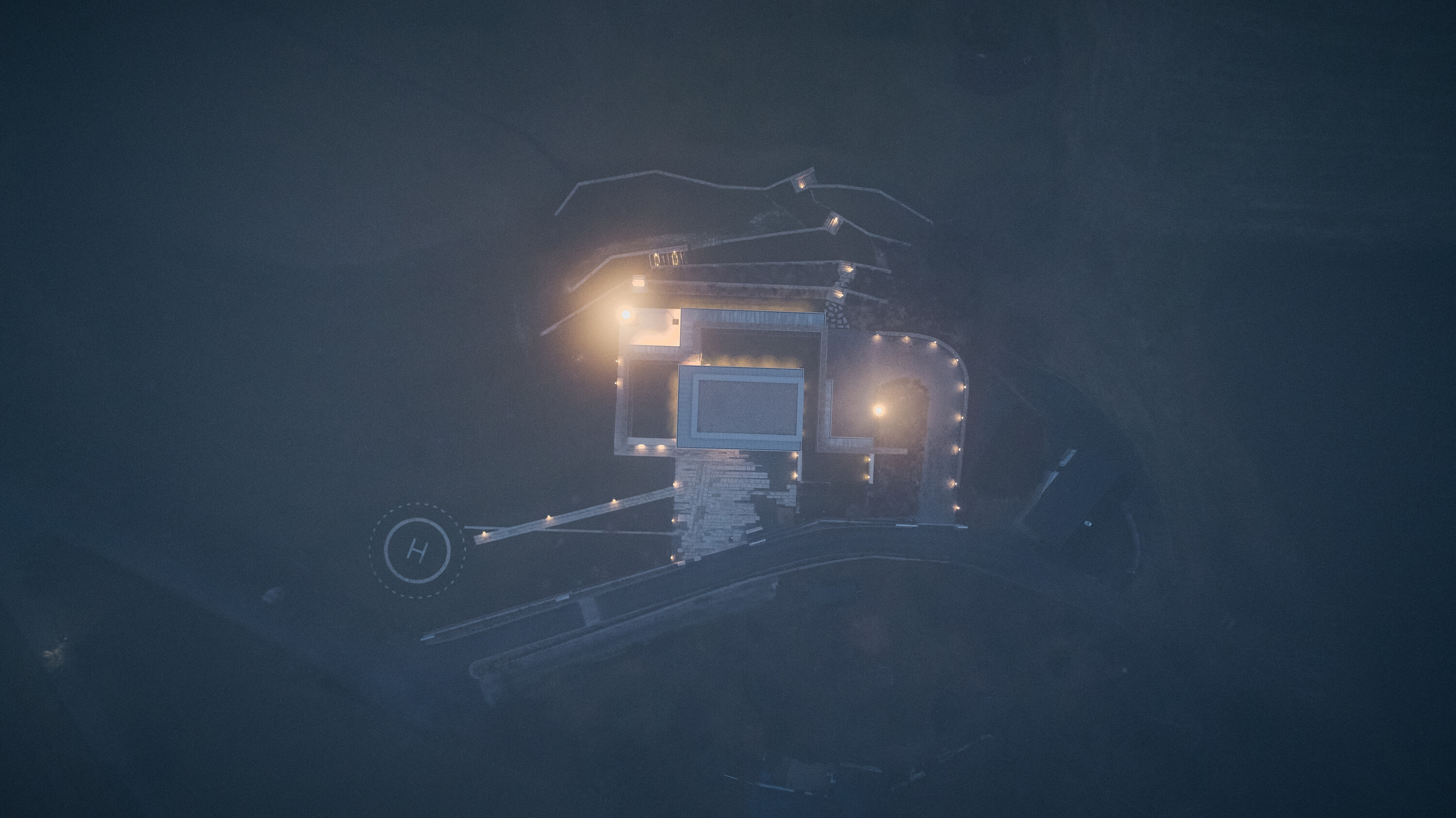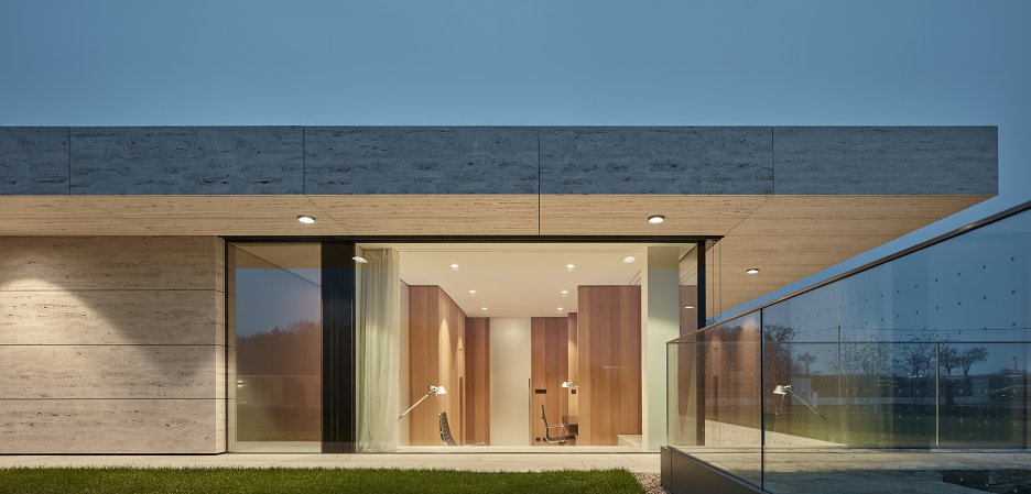 Dom má dve podlažia. Vyššiu úroveň využívajú hosťovské izby so samostatným vstupom a pracovňou. Spodné podlažie, čiastočne zapustené, hlavný obytný priestor, na ktorý nadväzuje garáž a krytý bazén.