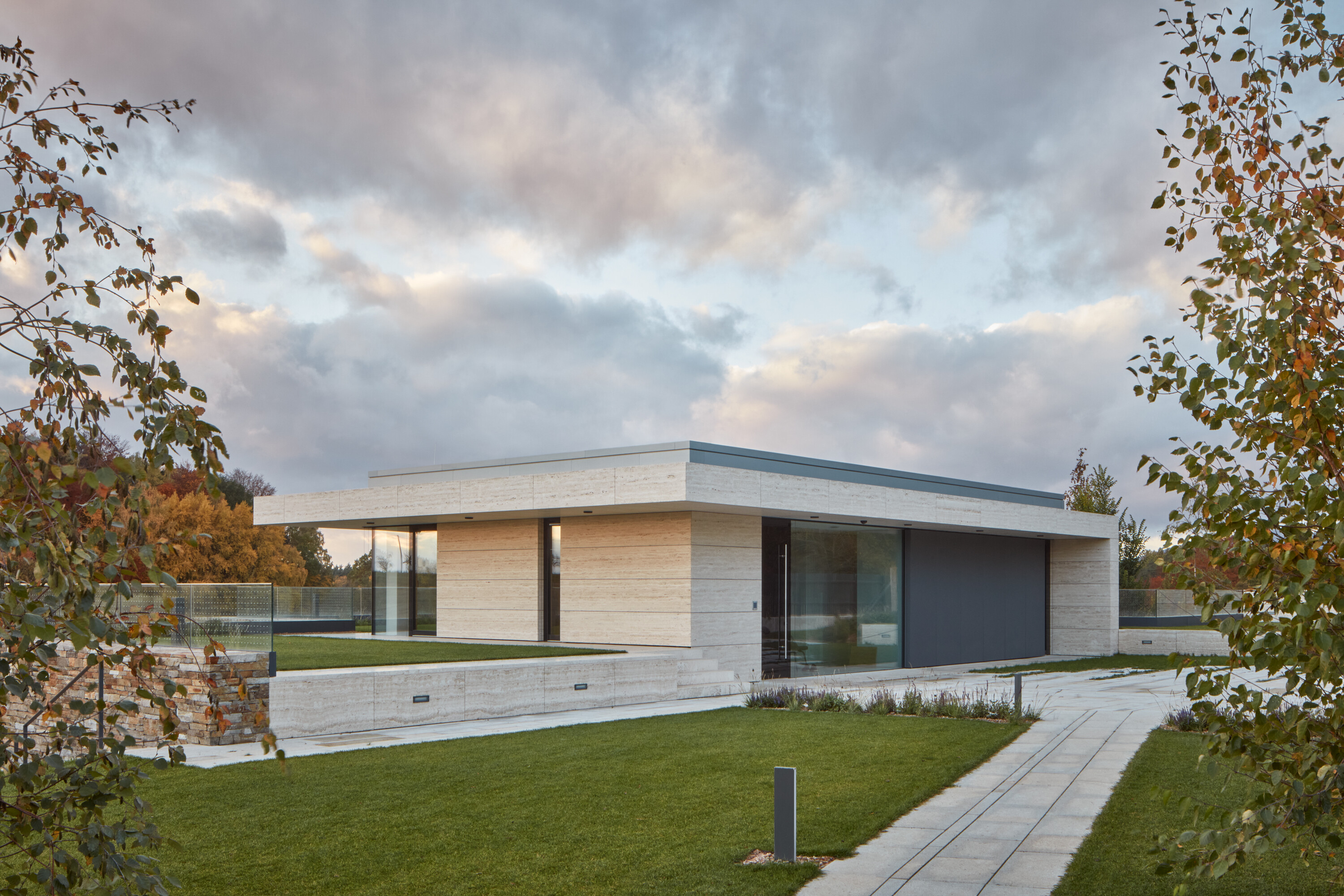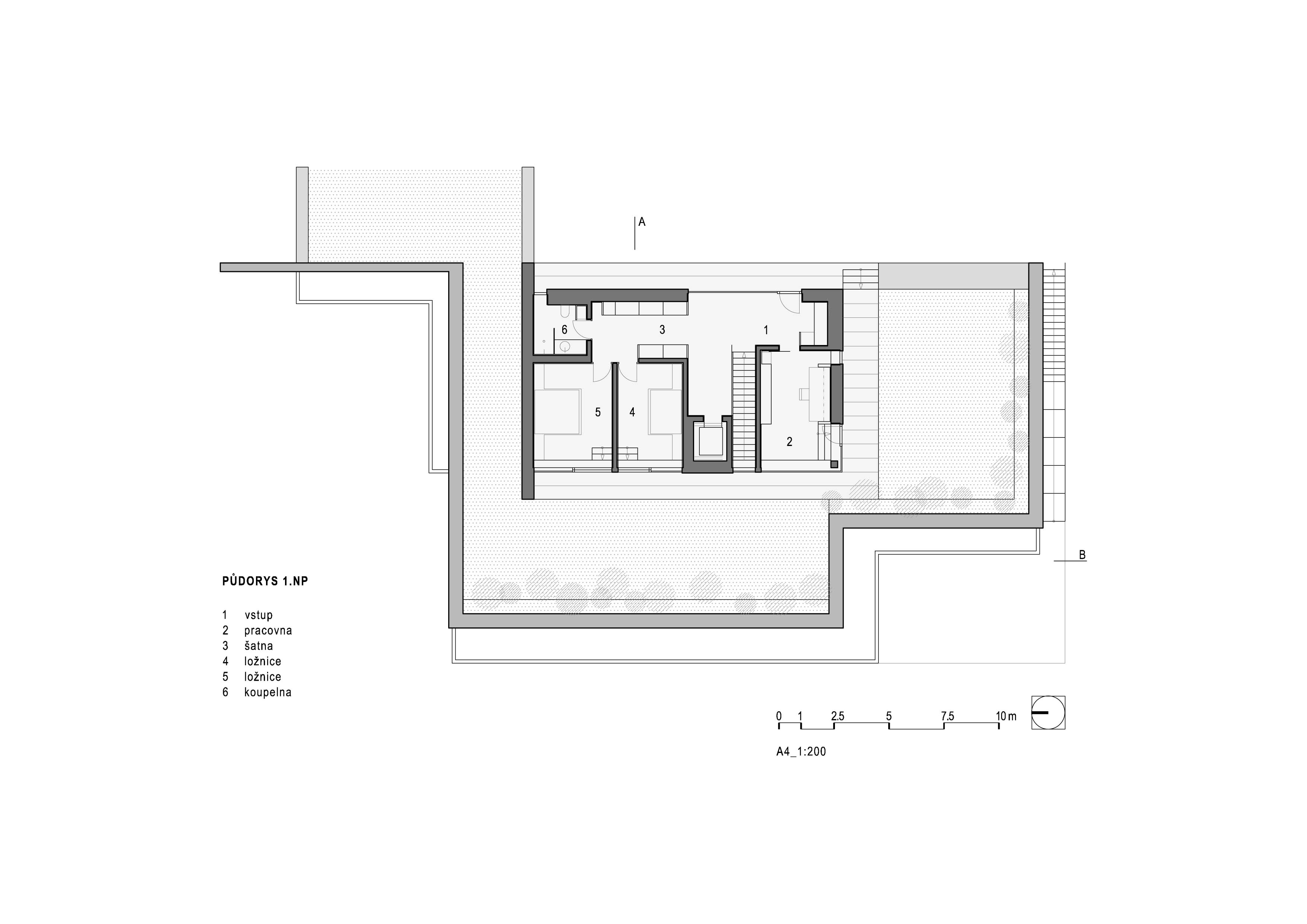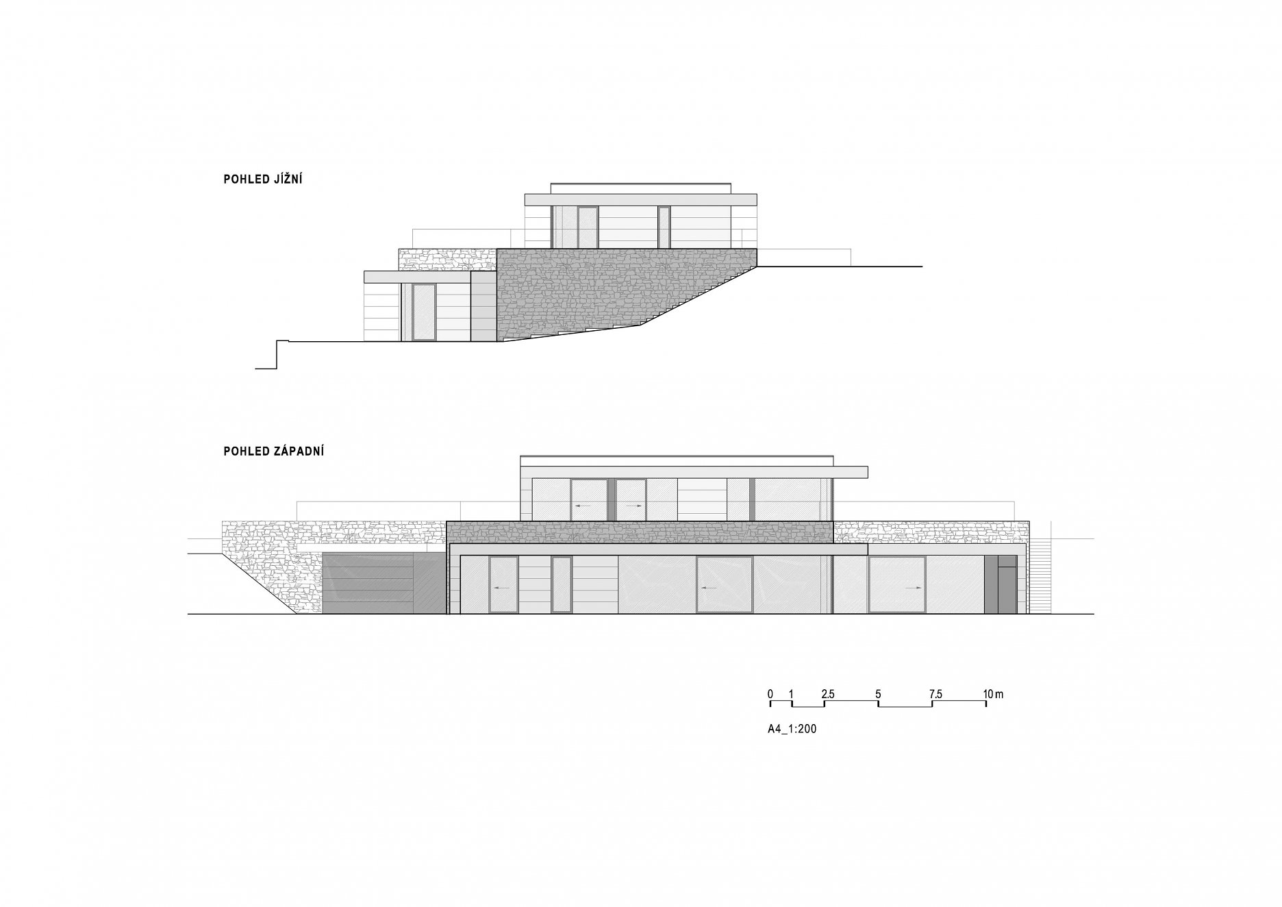 Rozsiahla parcela, mimo zastavaného územia obce je súčasťou zvlnenej krajiny na okraji Českého raja. Pozemok, sklonený k juhozápadu, otvára výhľady na protiľahlý zelený horizont. Rozmerné zasklenie obytných miestností smeruje na priebežné terasy a k diaľkovým pohľadom. Prianím klienta bolo široké využitie prírodných materiálov.