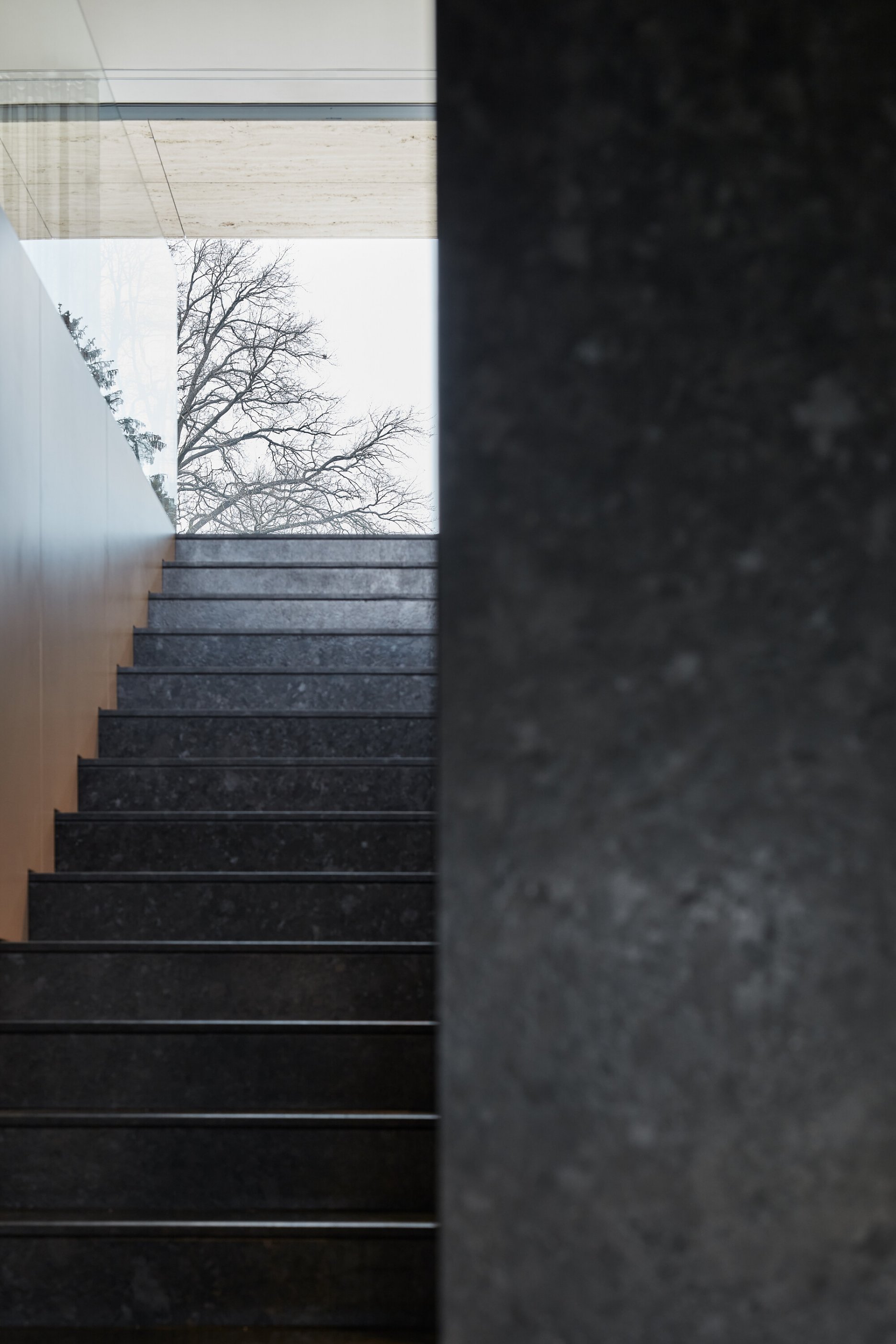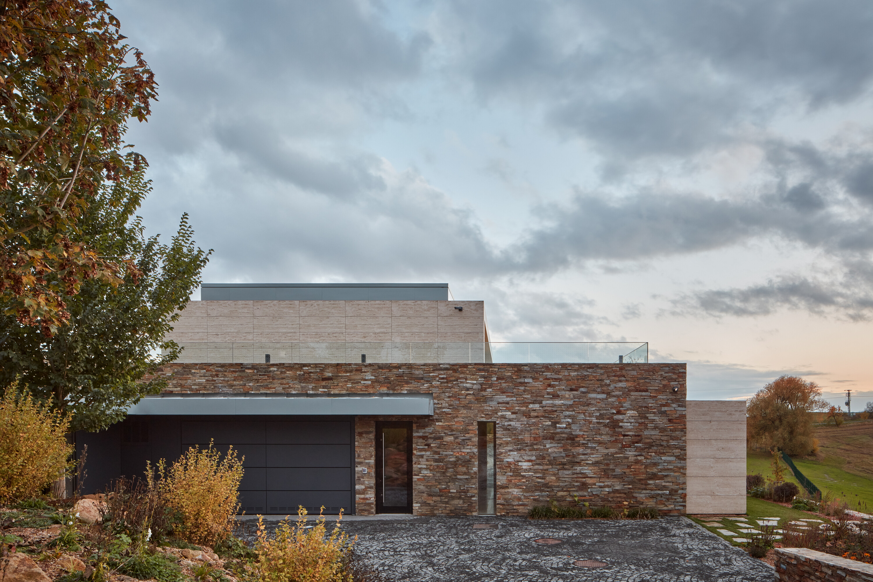 Najvýraznejším materiálom, použitým v interiéri aj exteriéri je kameň. Režné murivo oporných múrov a travertínové platne na fasáde dopĺňajú vo vnútri veľkoformátové obklady z prírodného kameňa. Obklady stien a nábytok sú vyrobené na mieru z lakovaných a dyhovaných MDF dosiek.