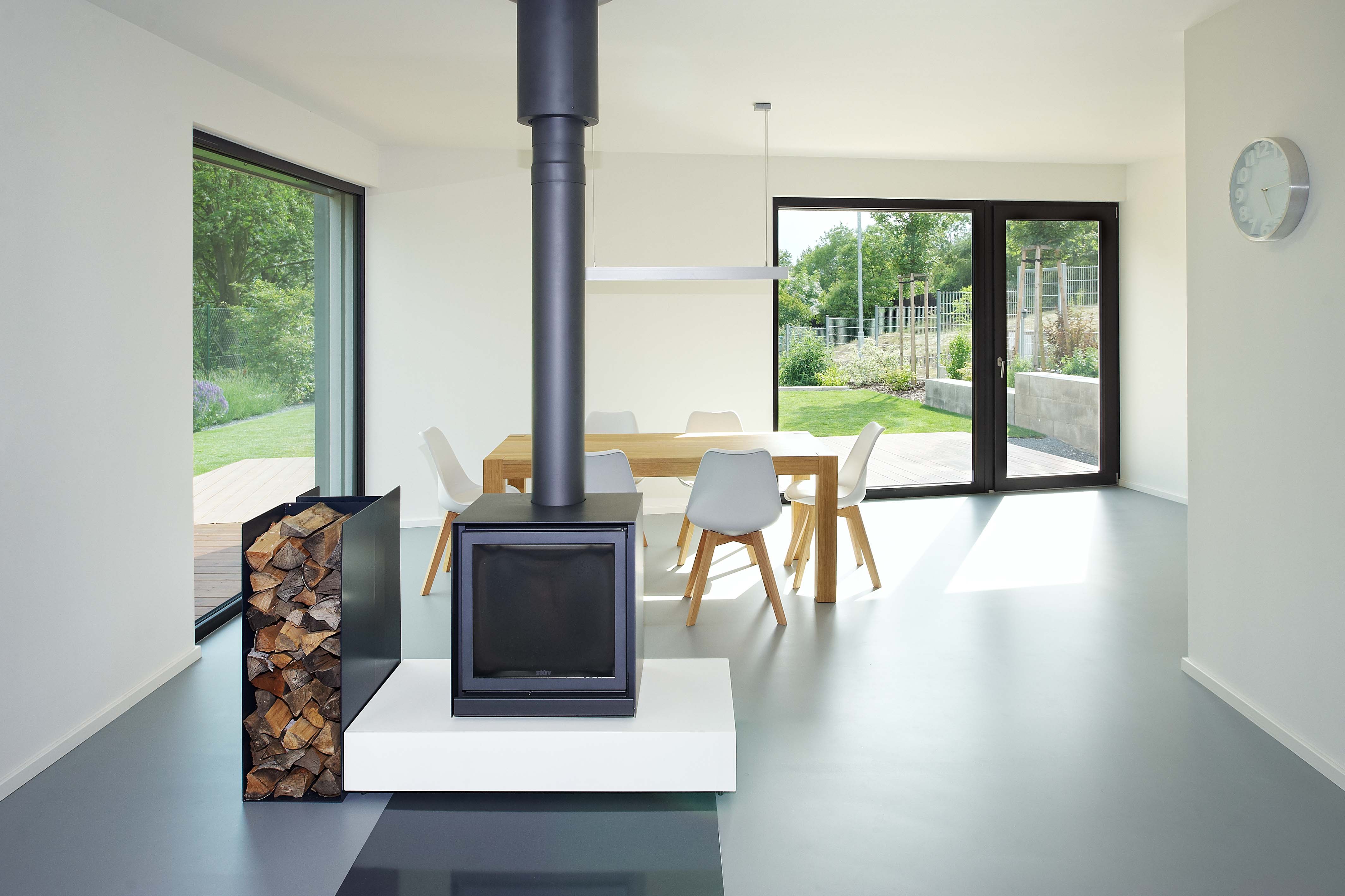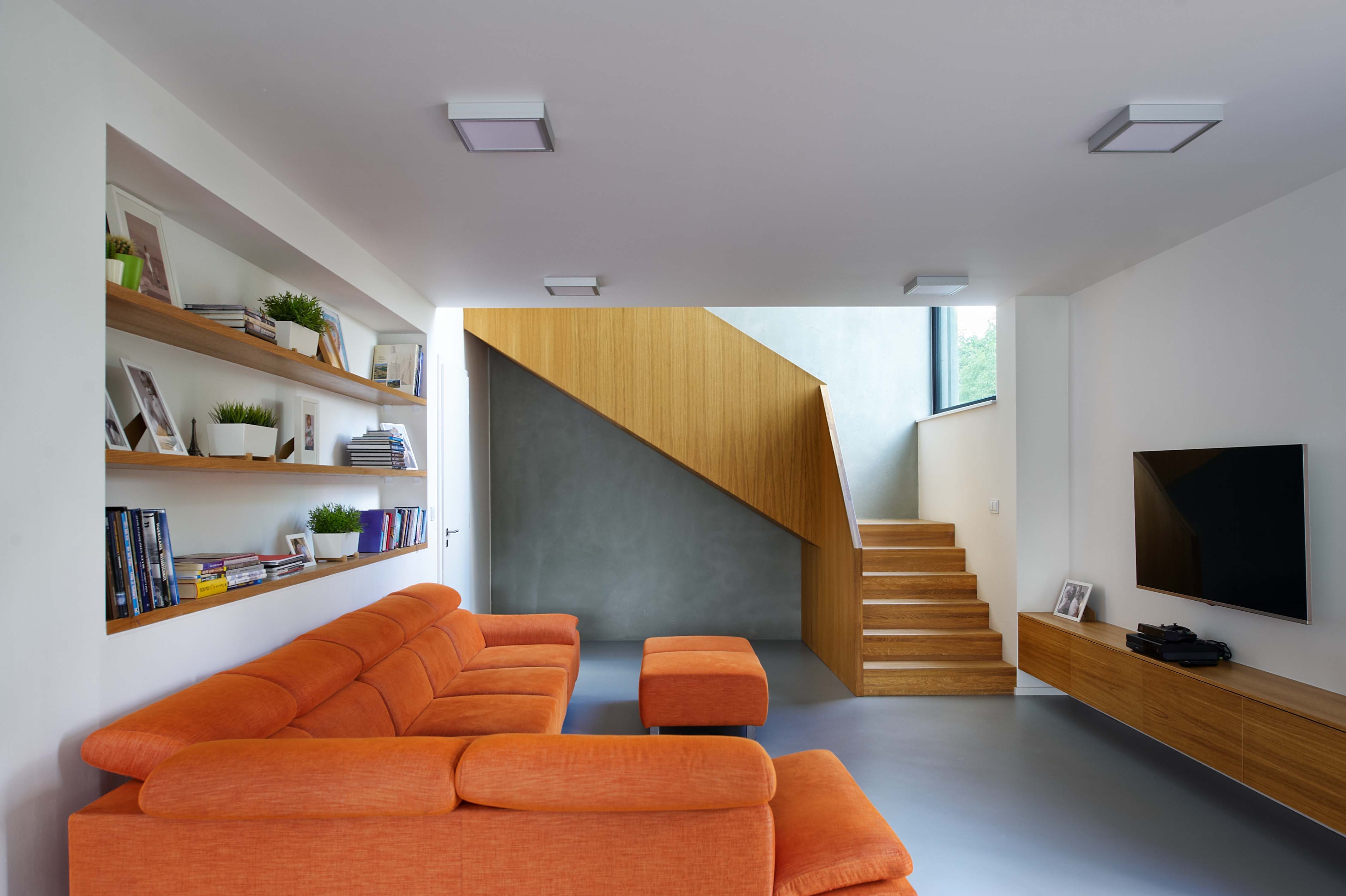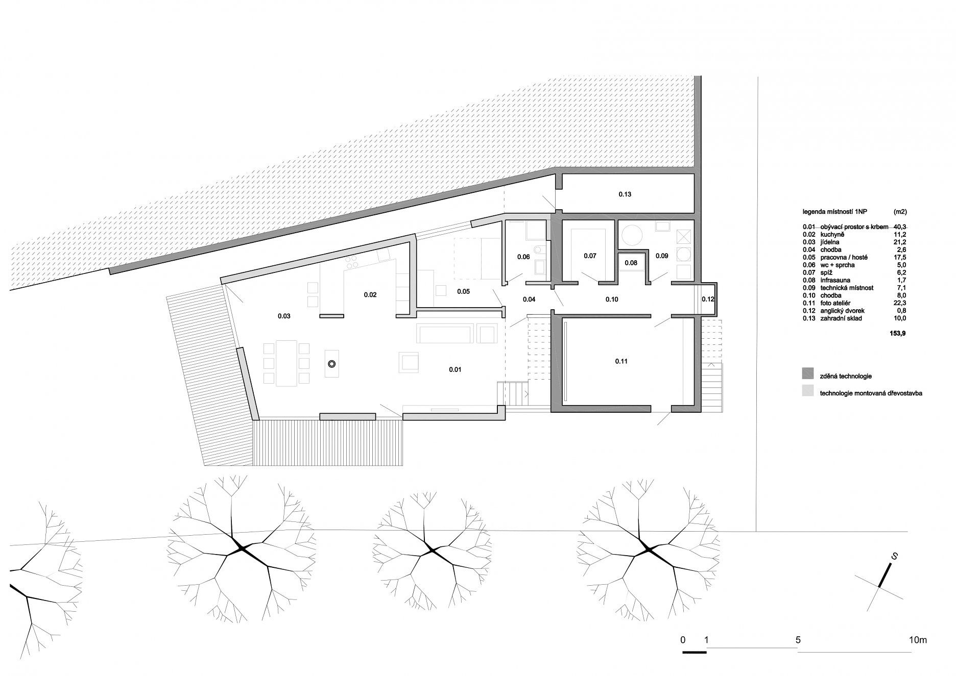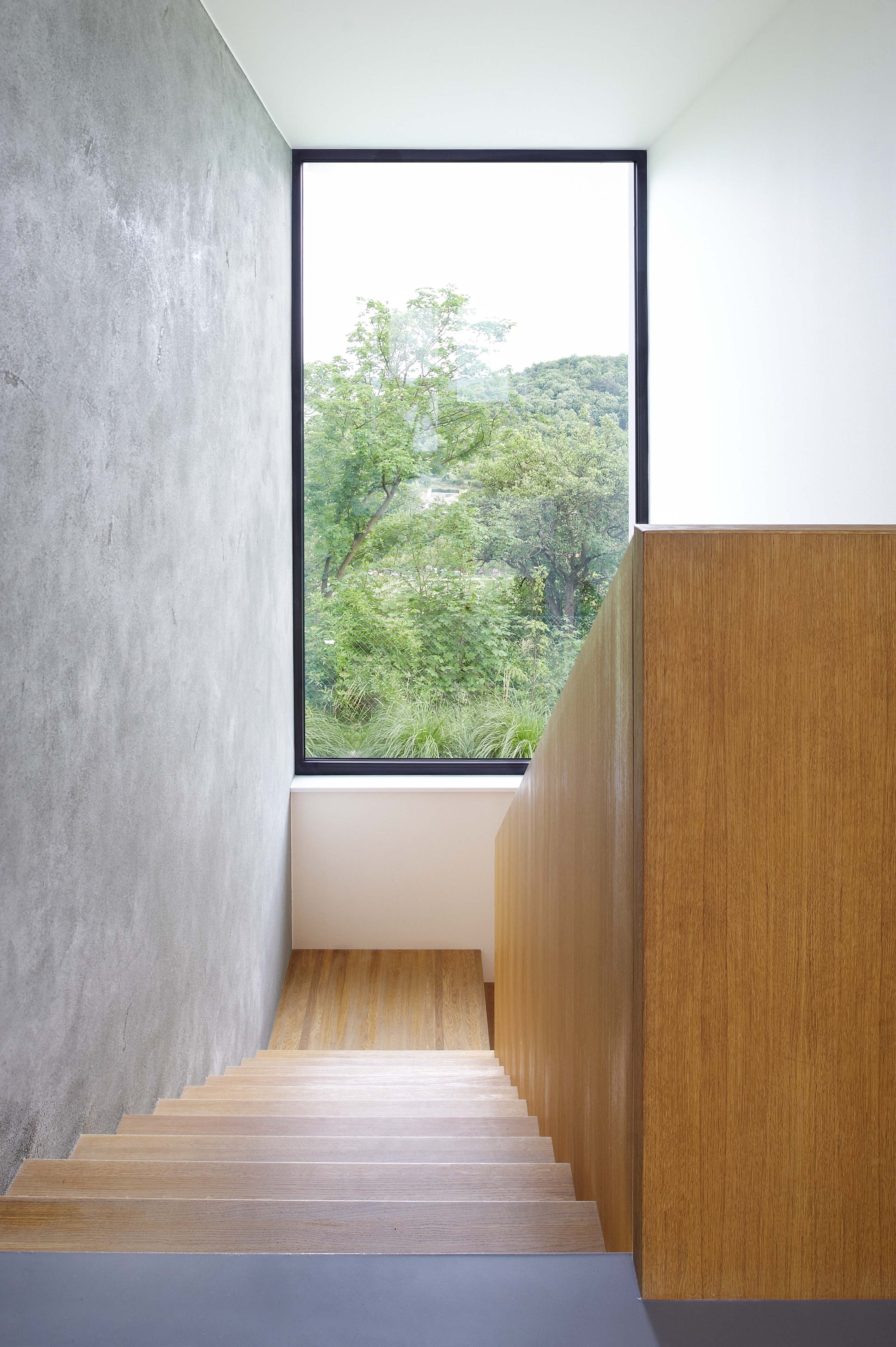 "Investor našel zalíbení v domech ze dřeva a tuto technologii chtěl použít i u svého domu," vysvetľuje architekt. Kvôli výraznému svahu musela byť drevostavba kombinovaná s klasickou stenovou konštrukciou. Segment s nebytovými priestormi, technickou miestnosťou, skladmi a fotoateliérom je čiastočne zapustený do svahu. Obytná časť bola realizovaná ako montovaná drevostavba z prefabrikovaných panelov. Schodisko vložené medzi oba úseky logicky člení objekt a zároveň vytvára funkčné prepojenie medzi úrovňou ulice a záhrady, ktorá je o tri metre nižšie. Fasády sú omietnuté bielou, respektíve sivou stierkou imitujúcou betón. Interiér je striedmy, vynikajú v ňom výrazné solitéry z dubového dreva, ako napríklad schodisko, jedálenský stôl a nábytok vyrobený na mieru. Veľkoformátové okná zaisťujú optický kontakt so zeleňou a výhľad na dôležité dominanty mesta, Slánsku horu a kostol.