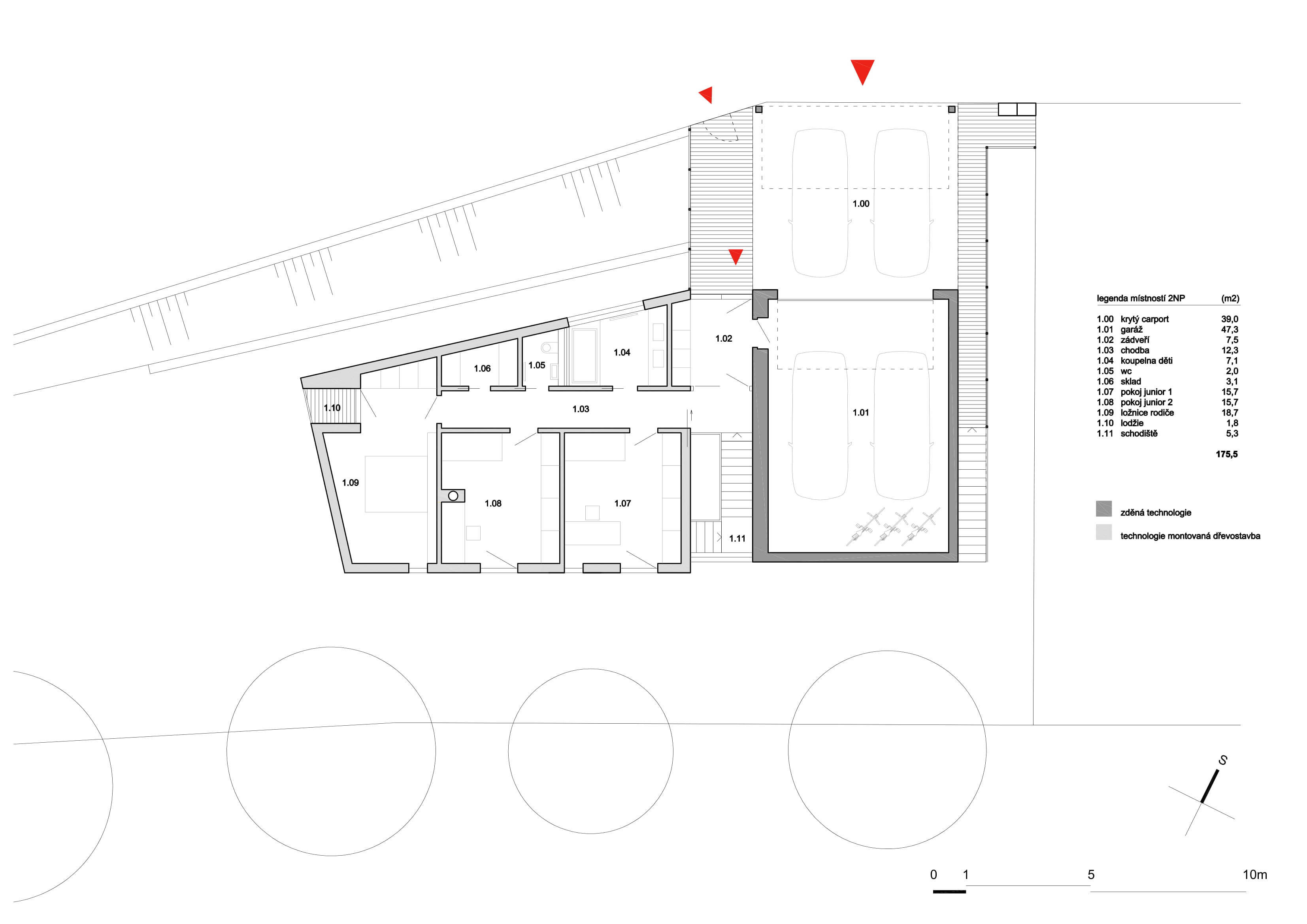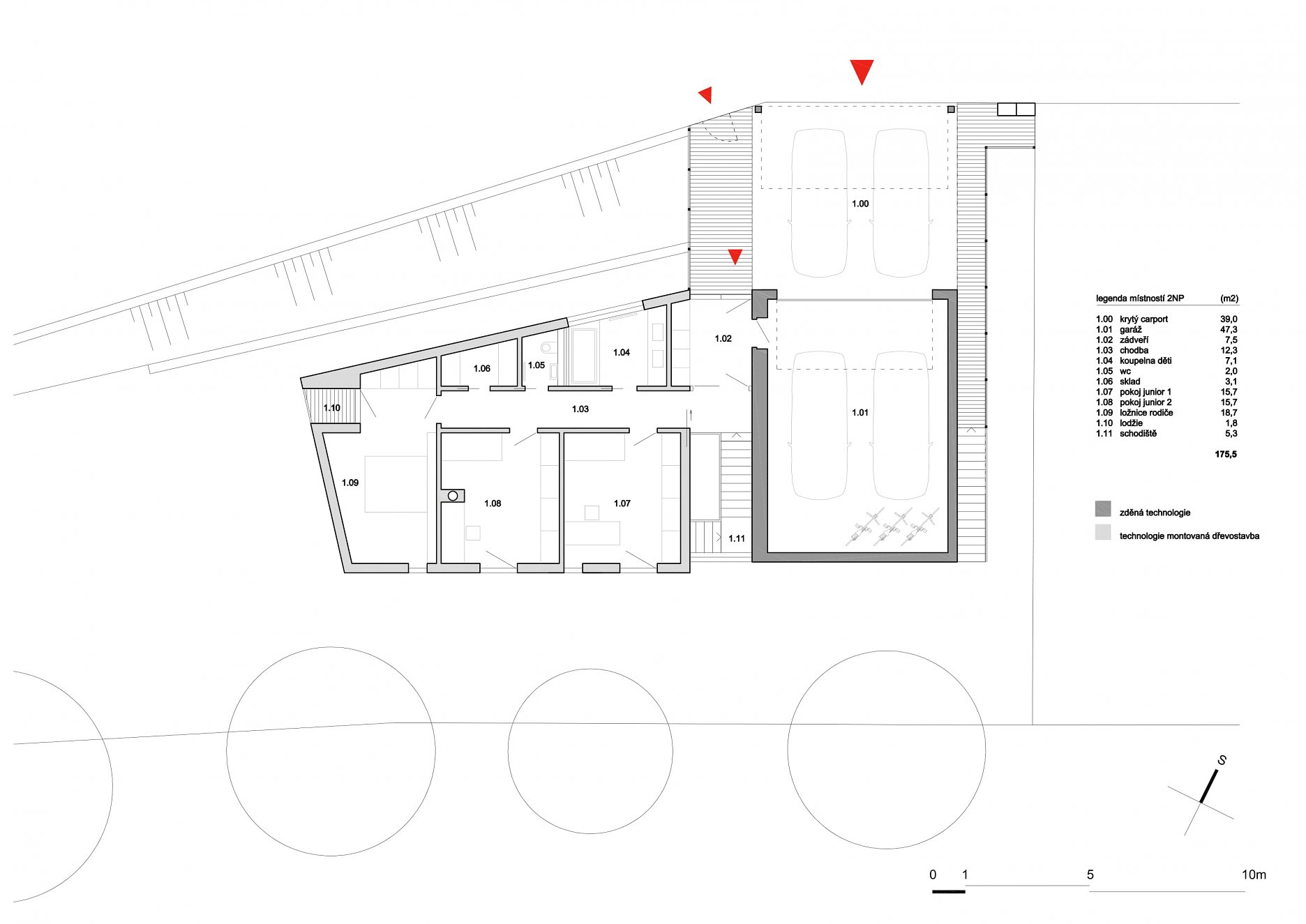 Pre centrum pätnásťtisícového mesta Slaný v okrese Kladno je charakteristická stredoveká parcelácia. Vývoj za jeho hradbami už taký kompaktný nie je. Zástavba pozvoľne prechádza do úrodnej krajiny s ovocnými sadmi a vinicami, ktorej dominuje čadičová Slánska hora. V okrajovej časti mesta, kde sa pôvodne nachádzali vinice, vznikol malý súbor s rodinnými domami. Posledný nezastavaný pozemok mal trojuholníkový tvar a klesajúci terén s prevýšením cez tri metre. Bol dlho na predaj a čakal na menej konzervatívneho investora a architekta.