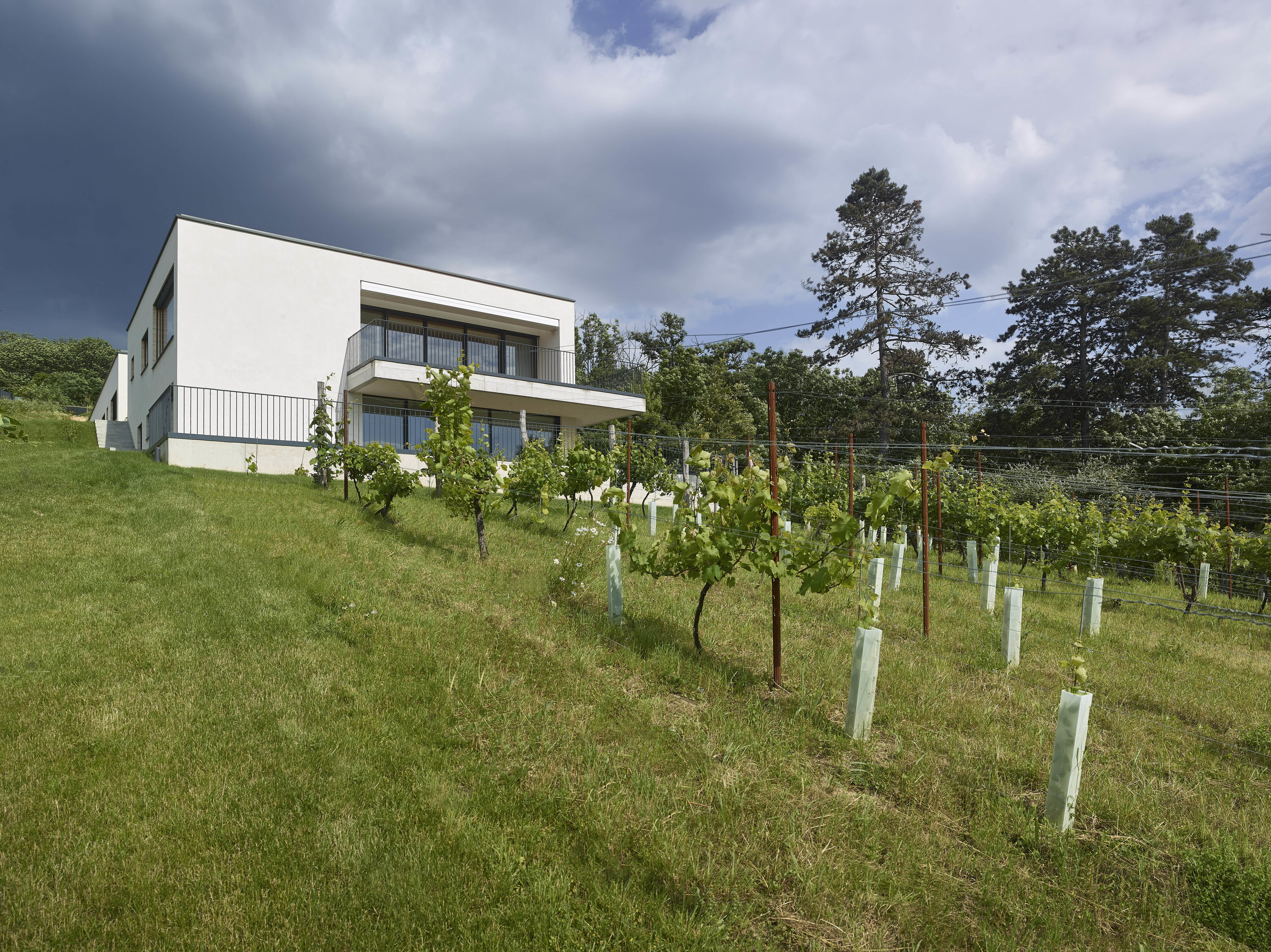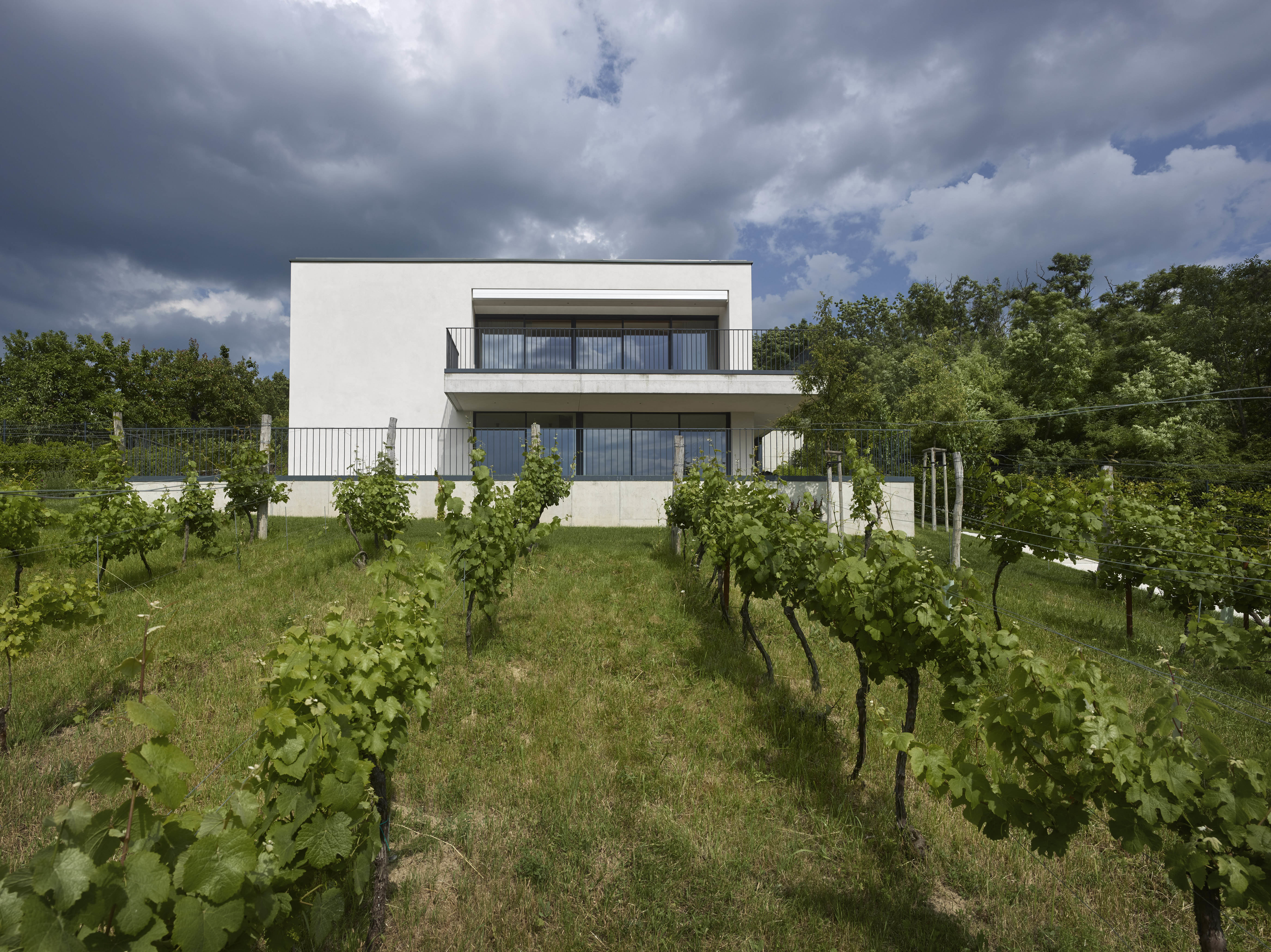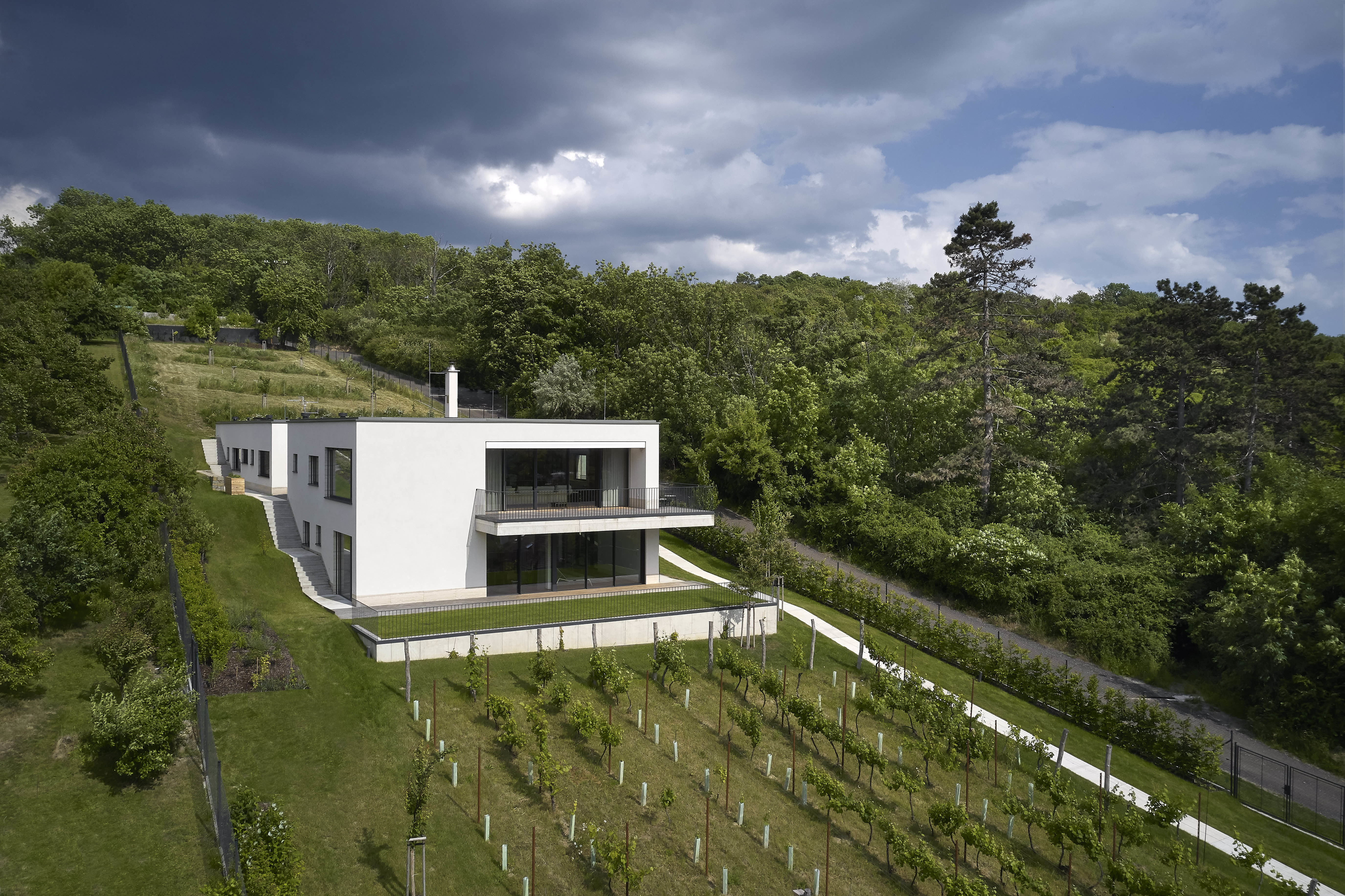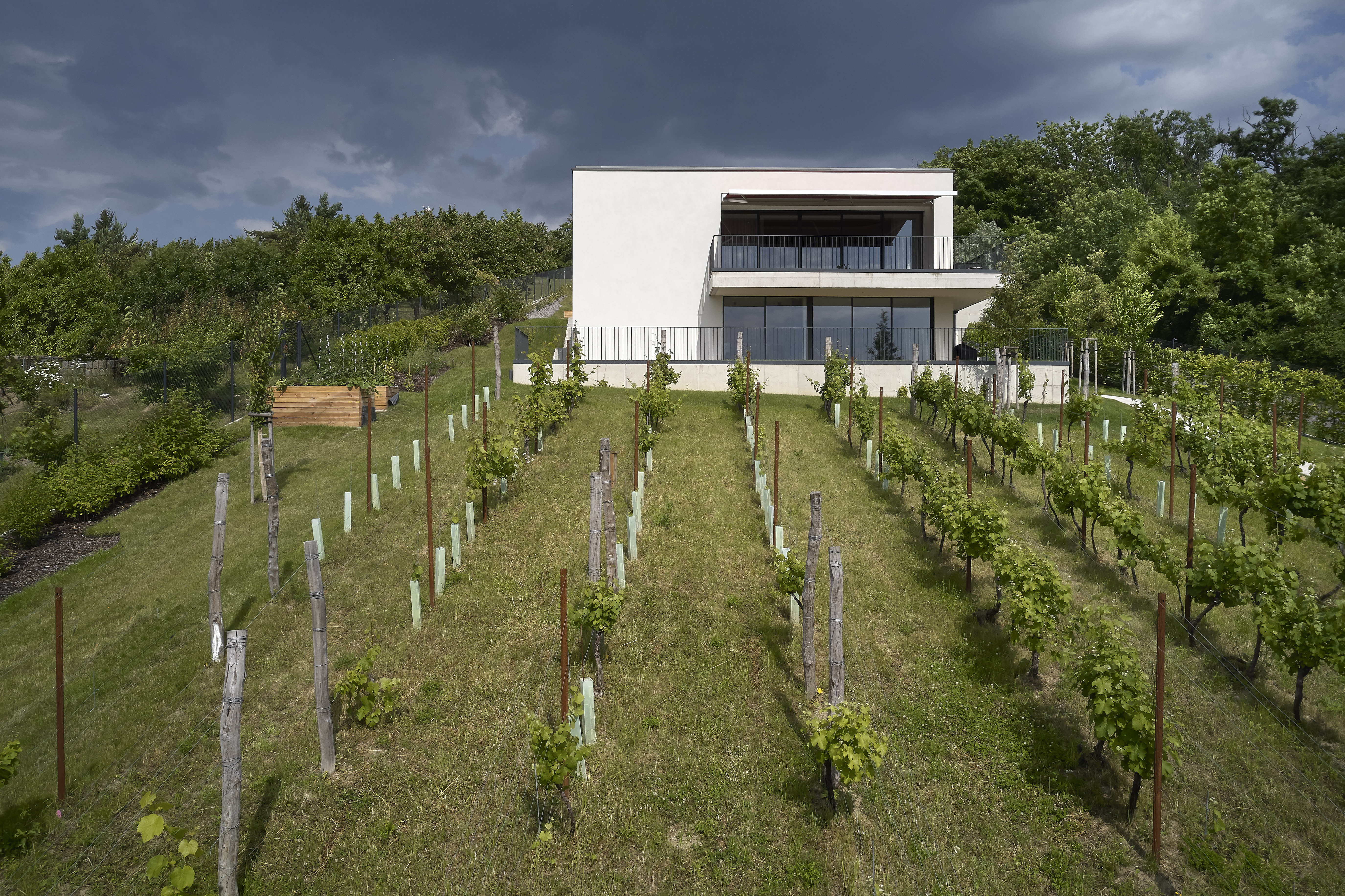 Štíhla dvojpodlažná hmota domu je votknutá do svahu. Pri pohľade z vrchnej časti pozemku objekt aj vďaka extenzívnej zelenej streche splýva so svahovitým terénom vinohradu. Na spodnej časti parcely, v úrovni susedných domov, situovali architekti garáž. Z ulice stúpa do svahu kaskádový chodník, vedúci k domu. Ďalšou z možností je prístup priamo z komunikácie, ktorá vedie pozdĺž južnej hrany parcely.