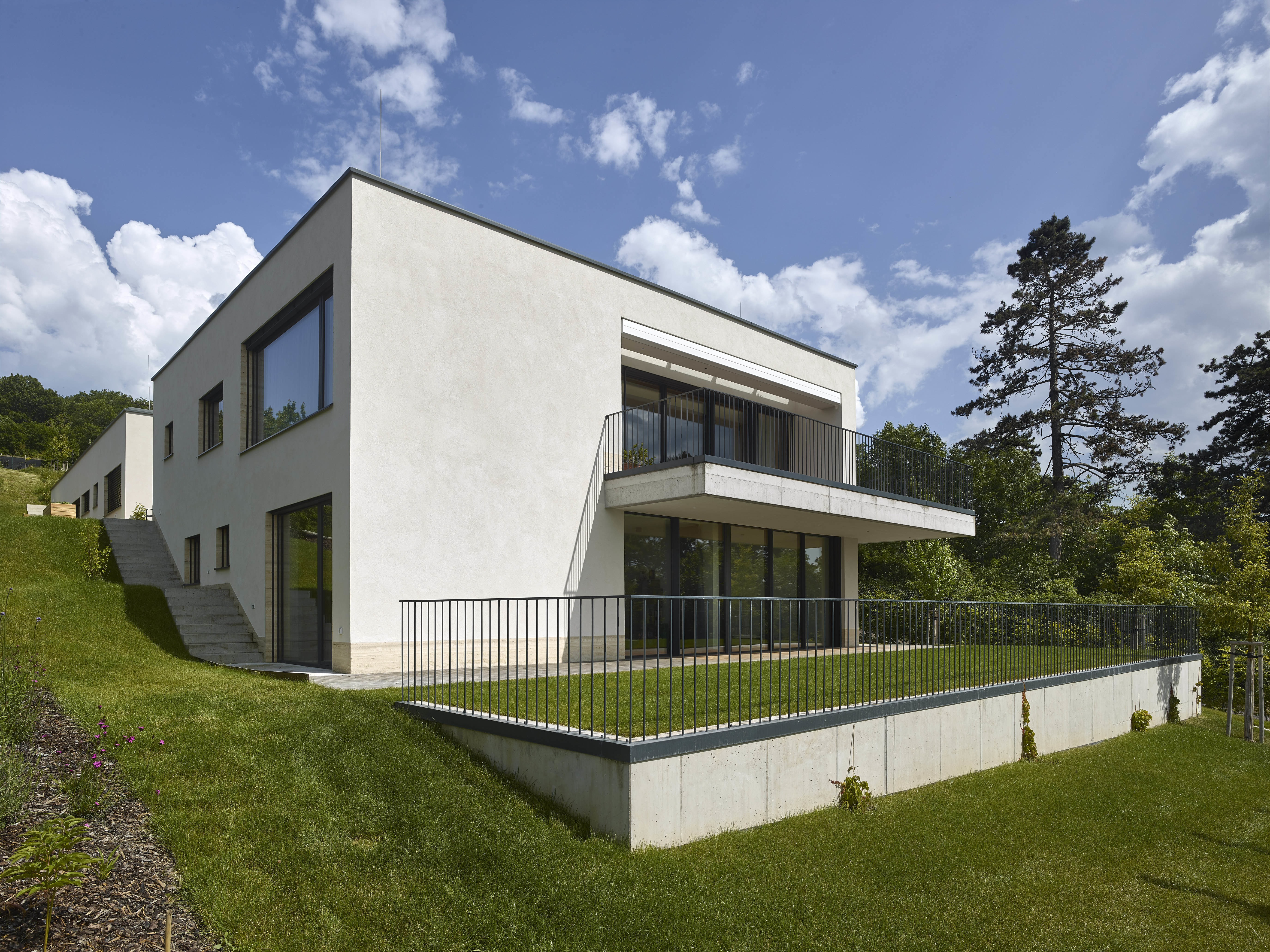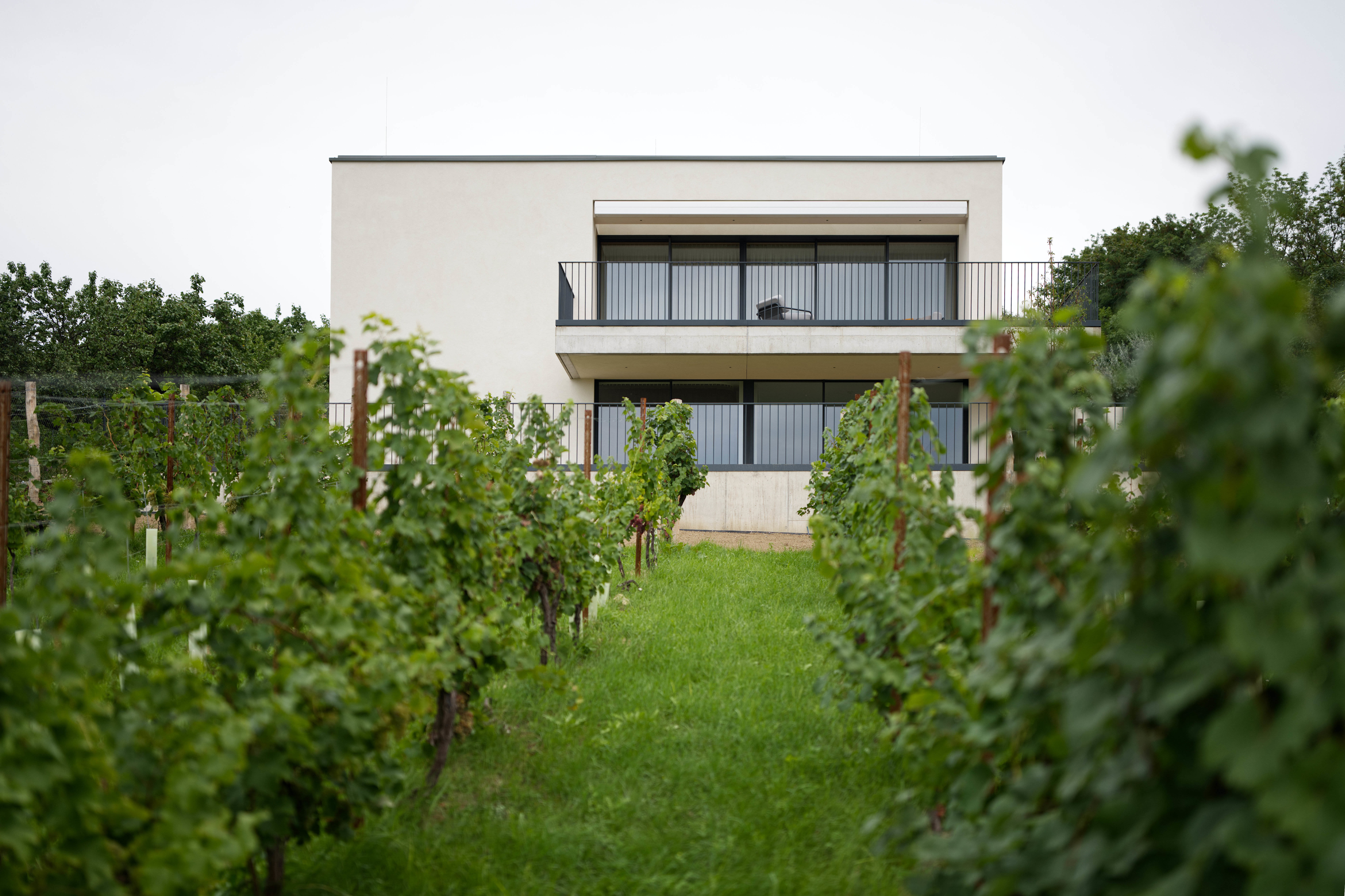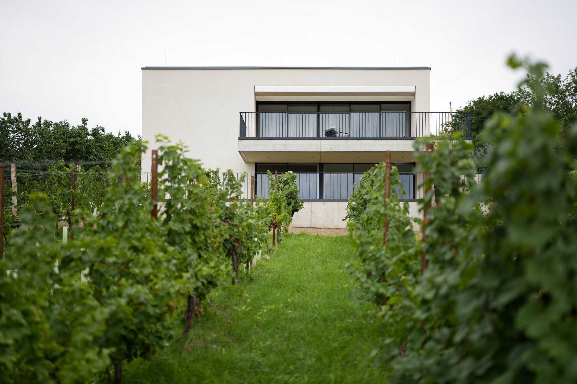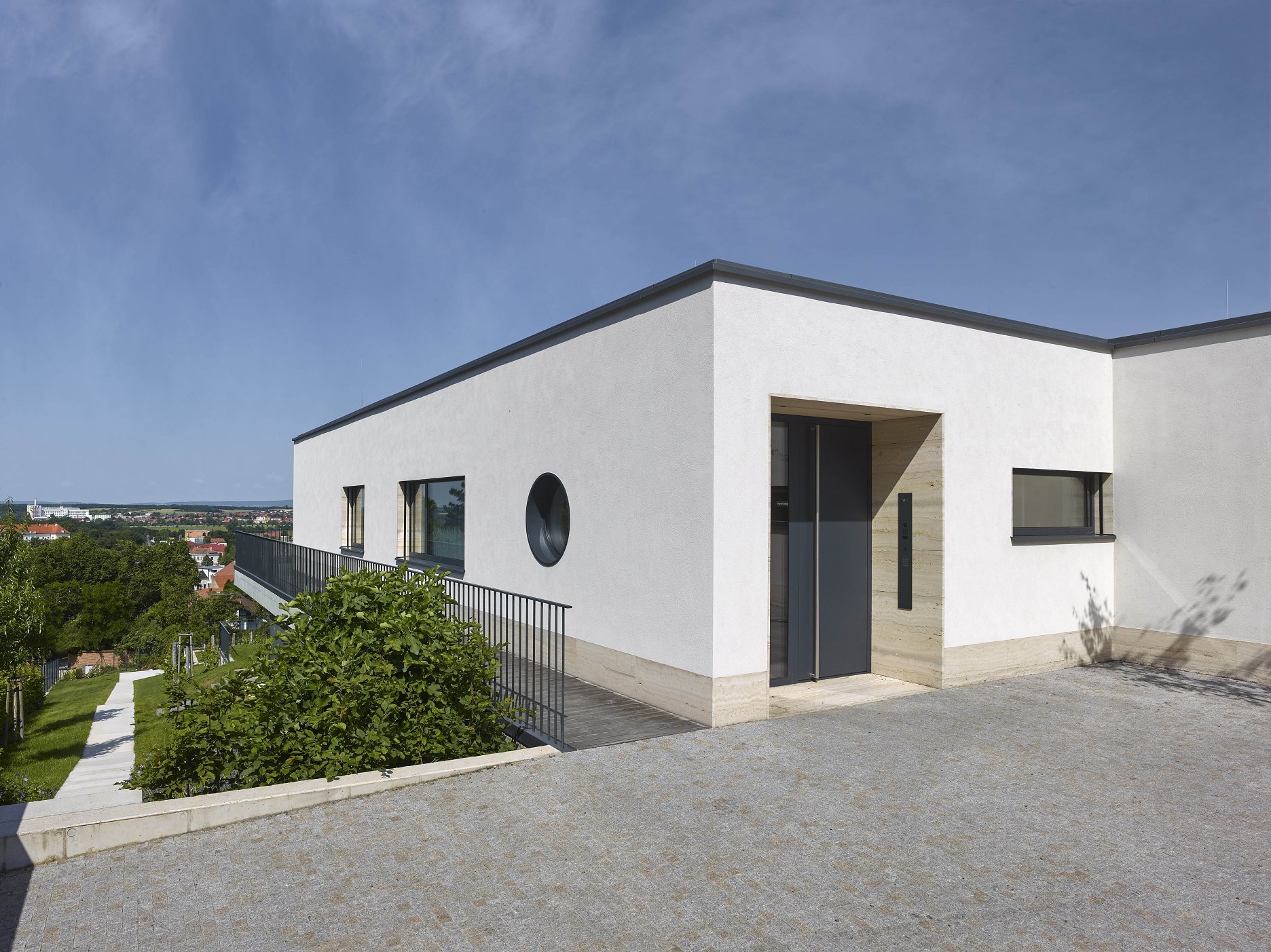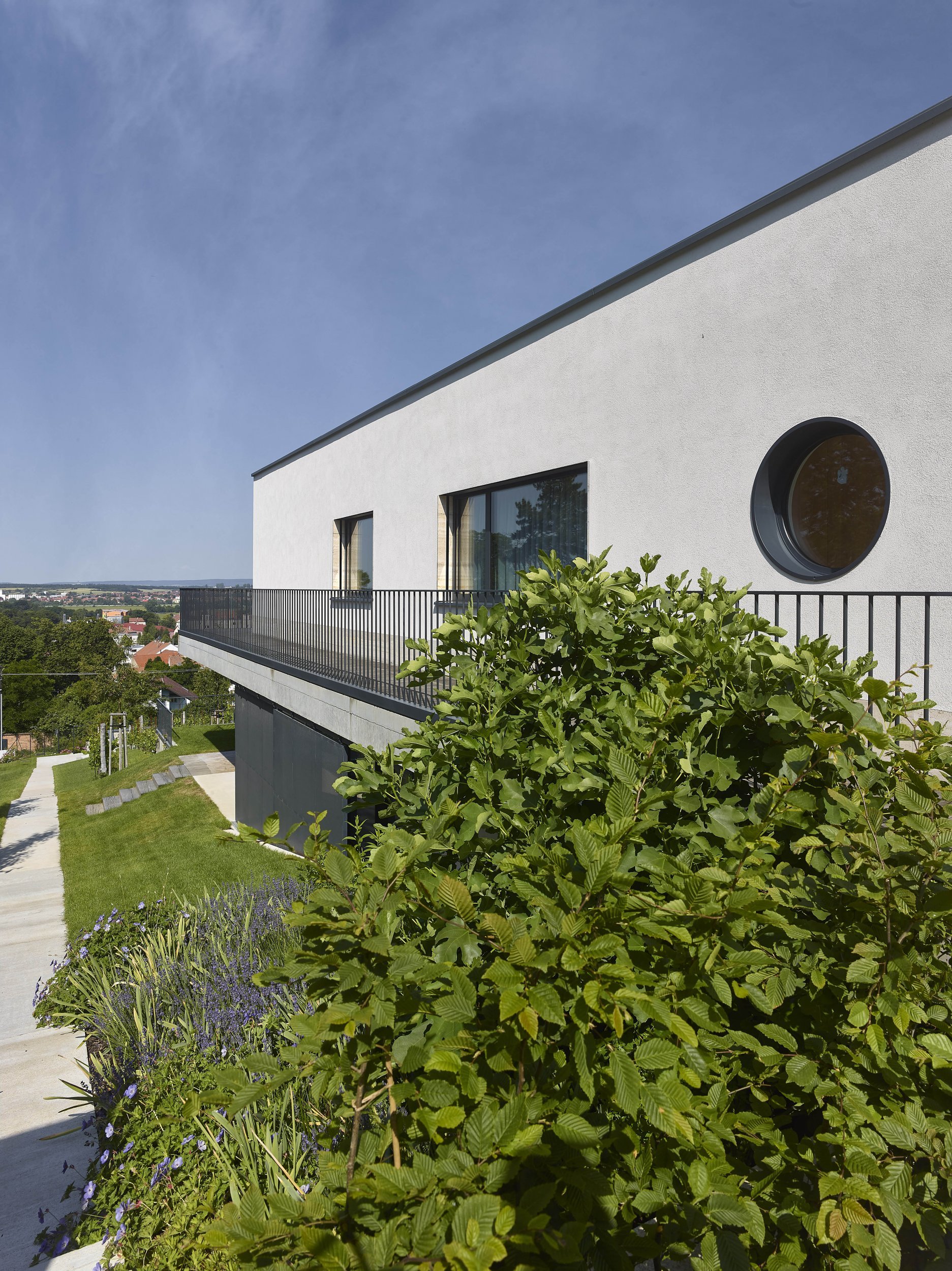 Štíhla dvojpodlažná hmota domu je votknutá do svahu. Pri pohľade z vrchnej časti pozemku objekt aj vďaka extenzívnej zelenej streche splýva so svahovitým terénom vinohradu. Na spodnej časti parcely, v úrovni susedných domov, situovali architekti garáž. Z ulice stúpa do svahu kaskádový chodník, vedúci k domu. Ďalšou z možností je prístup priamo z komunikácie, ktorá vedie pozdĺž južnej hrany parcely.