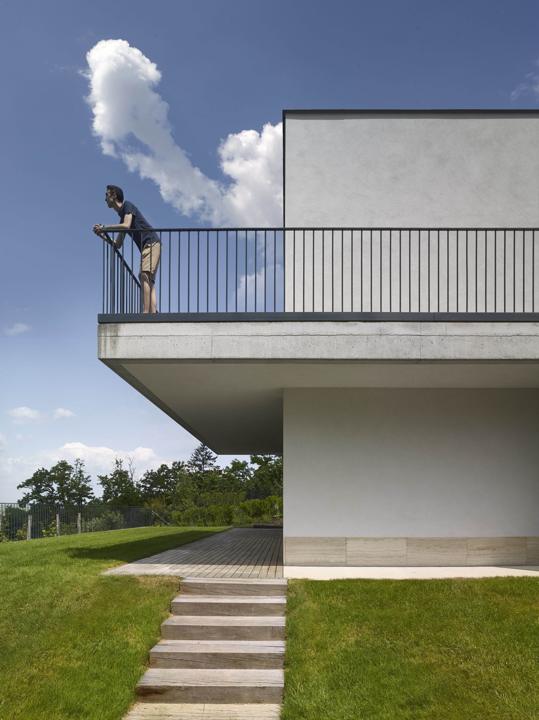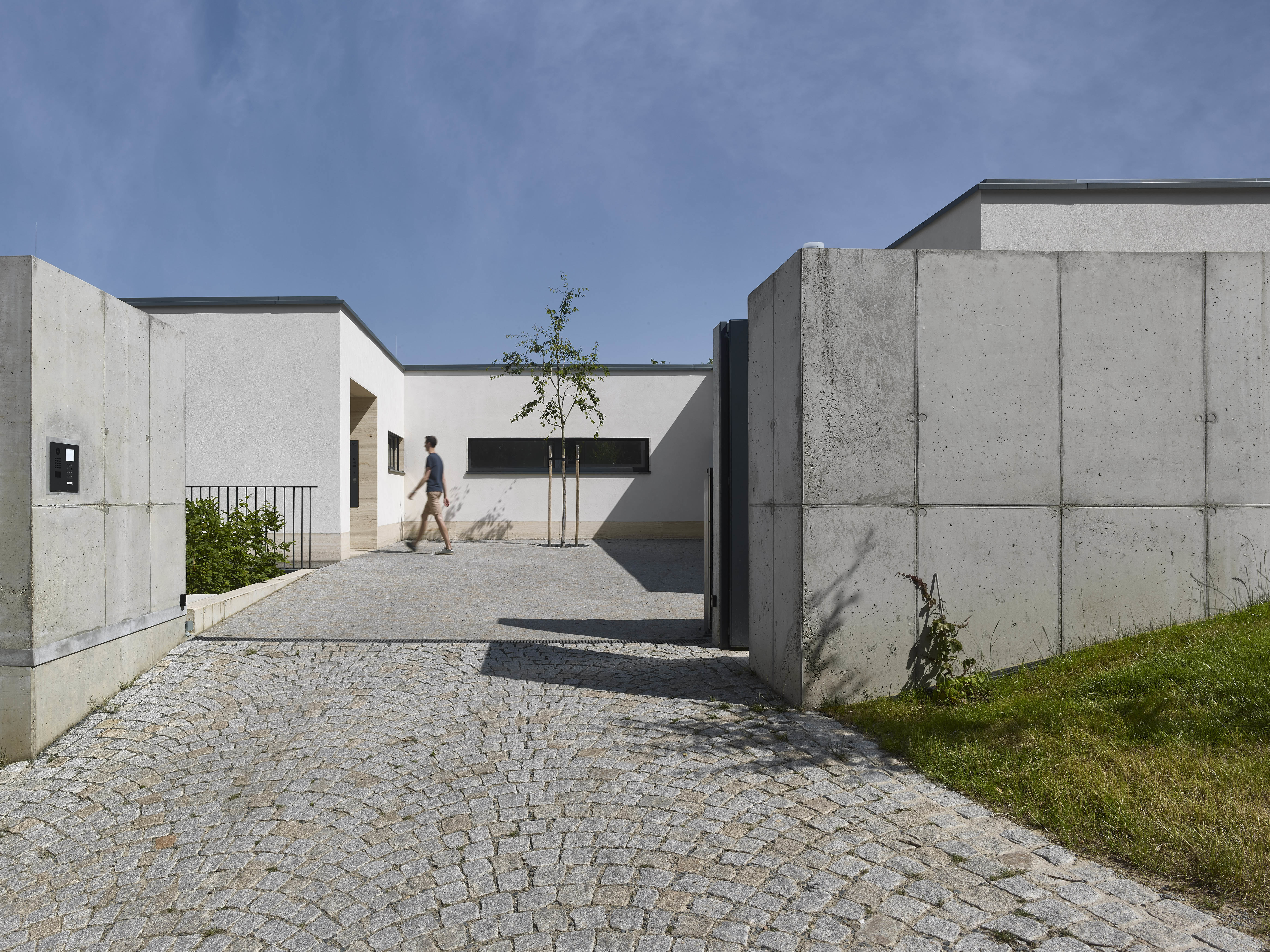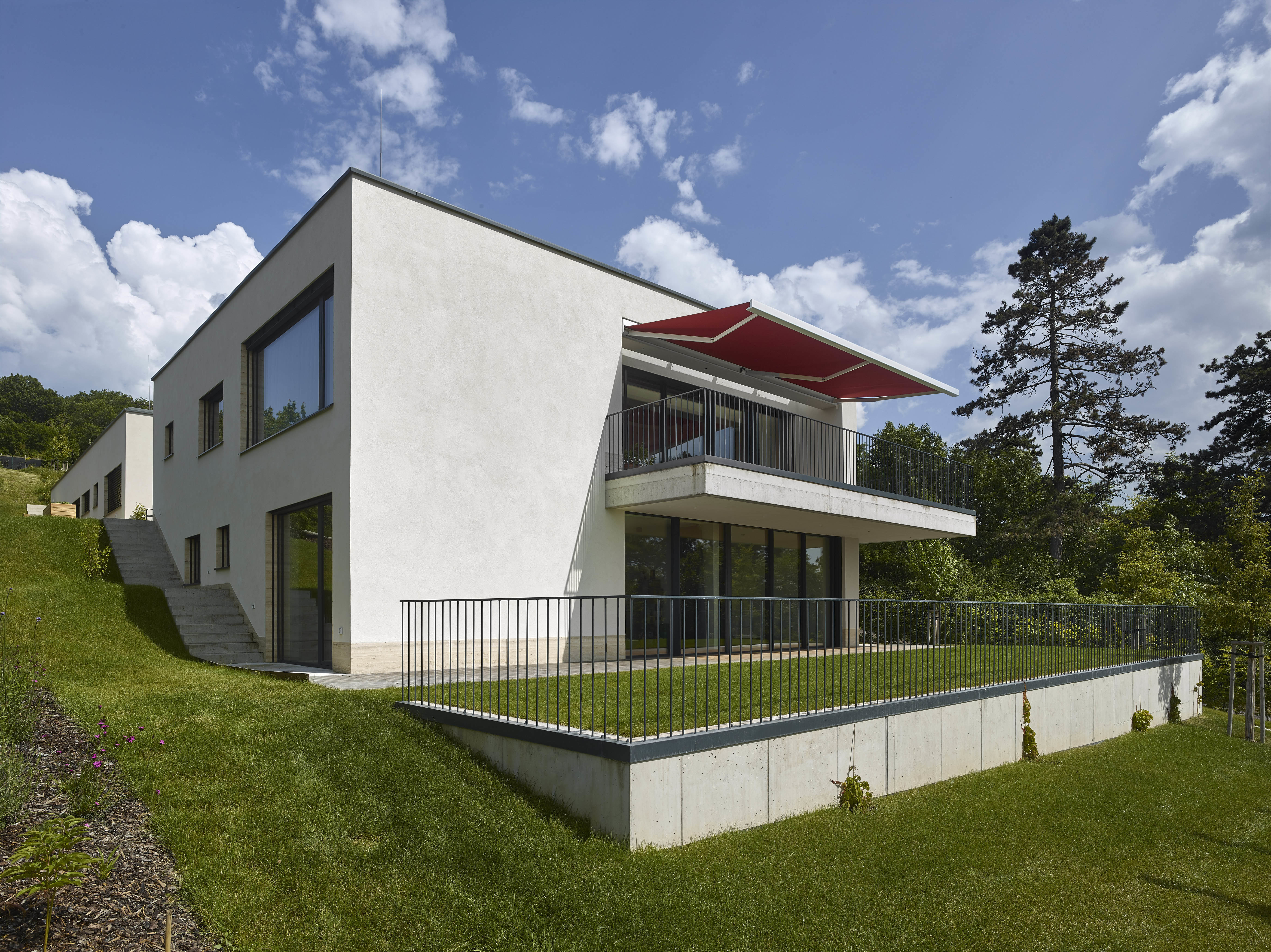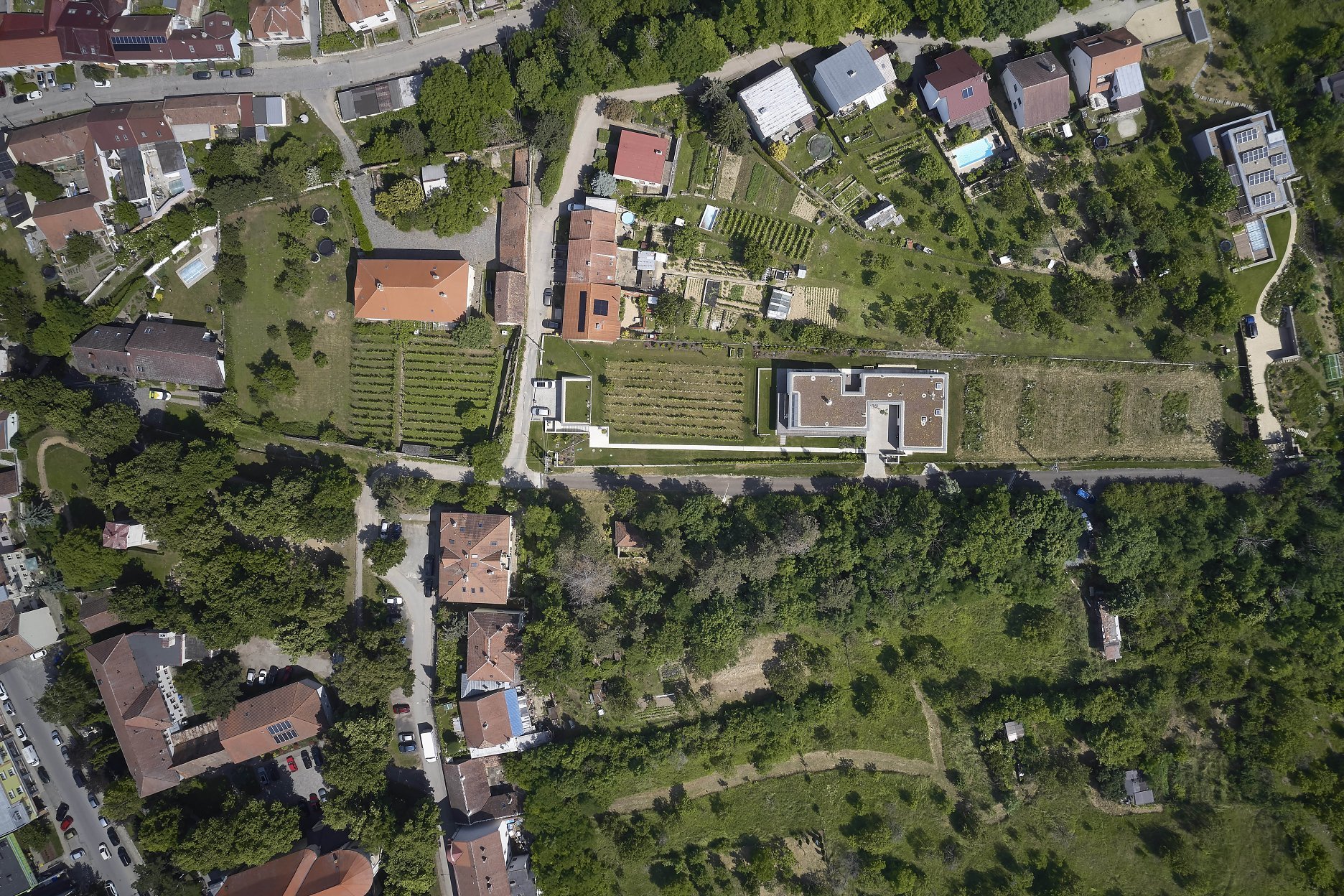 Štíhla dvojpodlažná hmota domu je votknutá do svahu. Pri pohľade z vrchnej časti pozemku objekt aj vďaka extenzívnej zelenej streche splýva so svahovitým terénom vinohradu. Na spodnej časti parcely, v úrovni susedných domov, situovali architekti garáž. Z ulice stúpa do svahu kaskádový chodník, vedúci k domu. Ďalšou z možností je prístup priamo z komunikácie, ktorá vedie pozdĺž južnej hrany parcely.