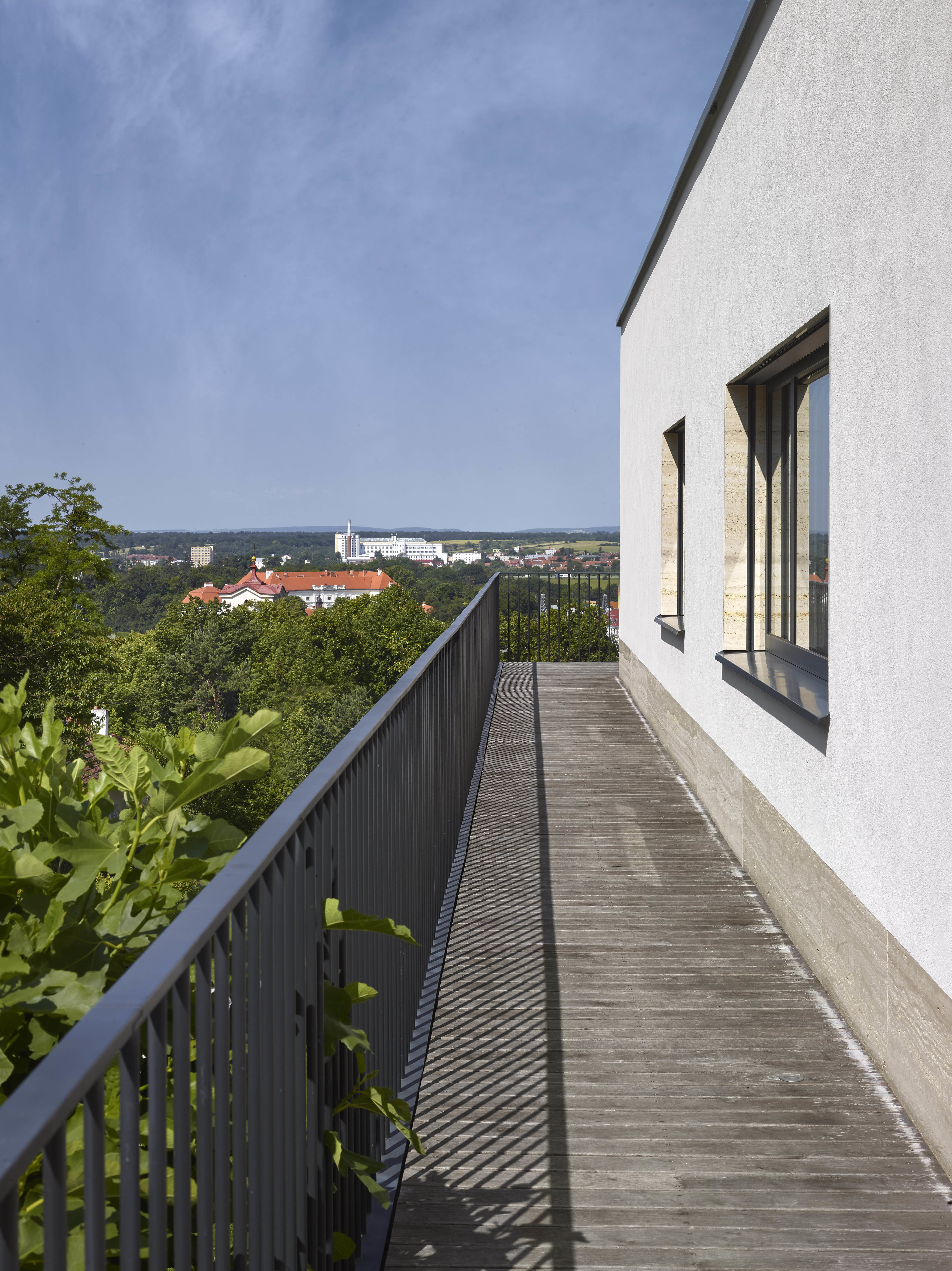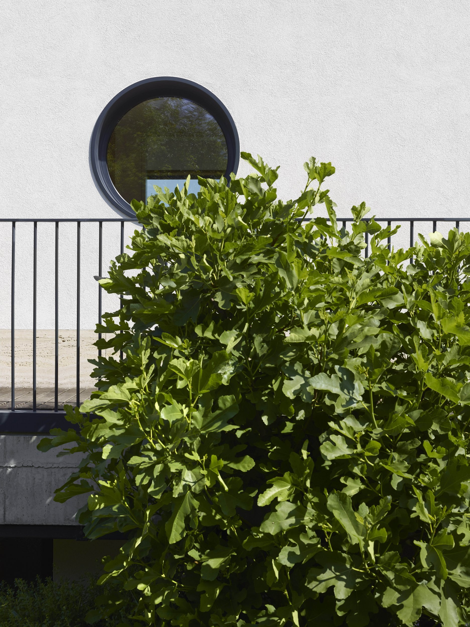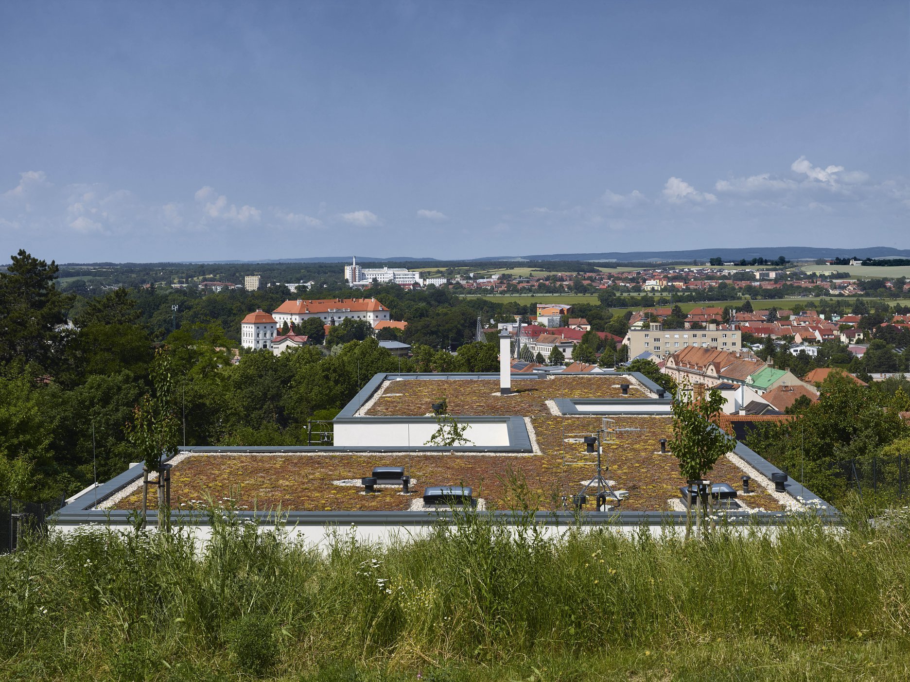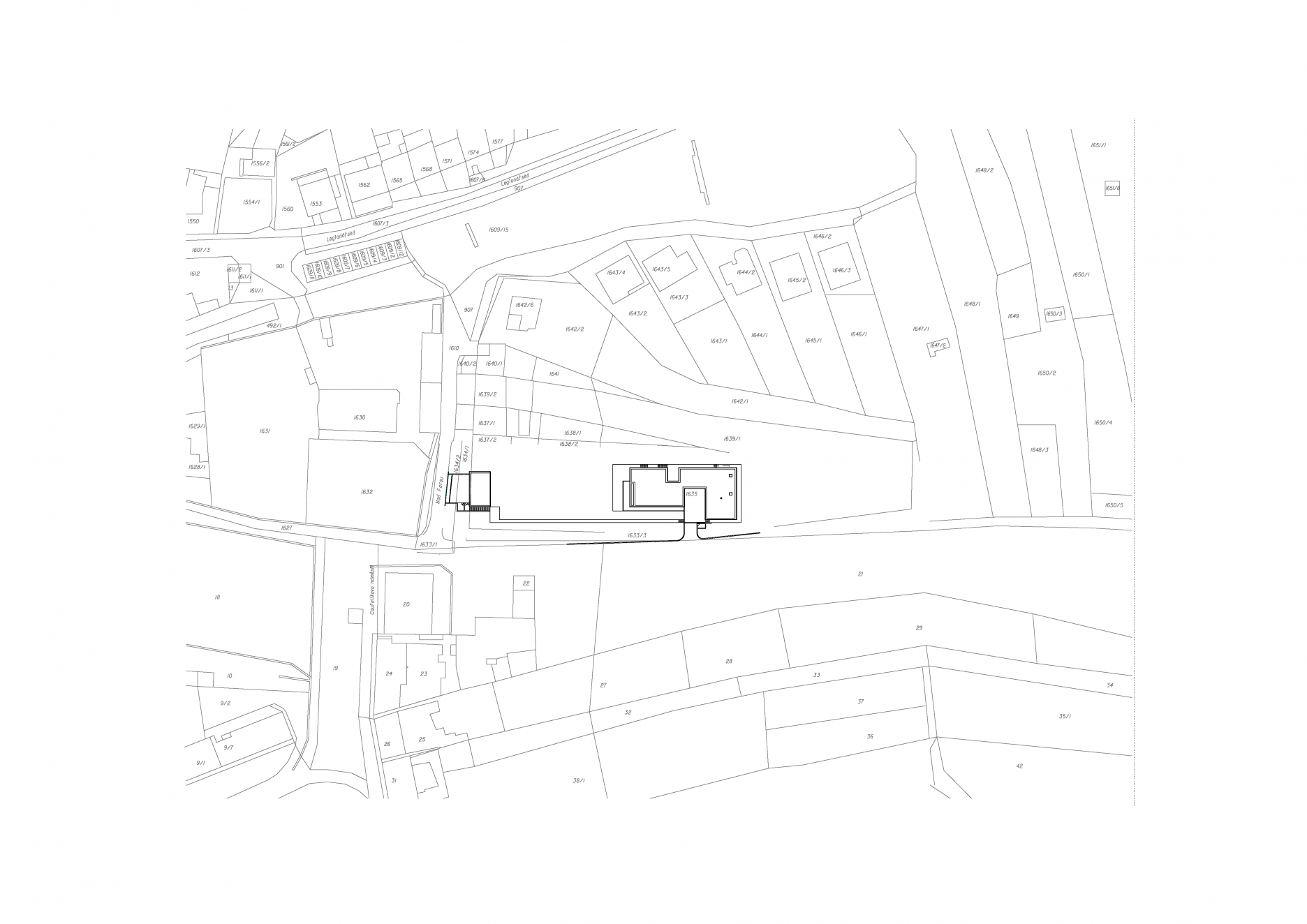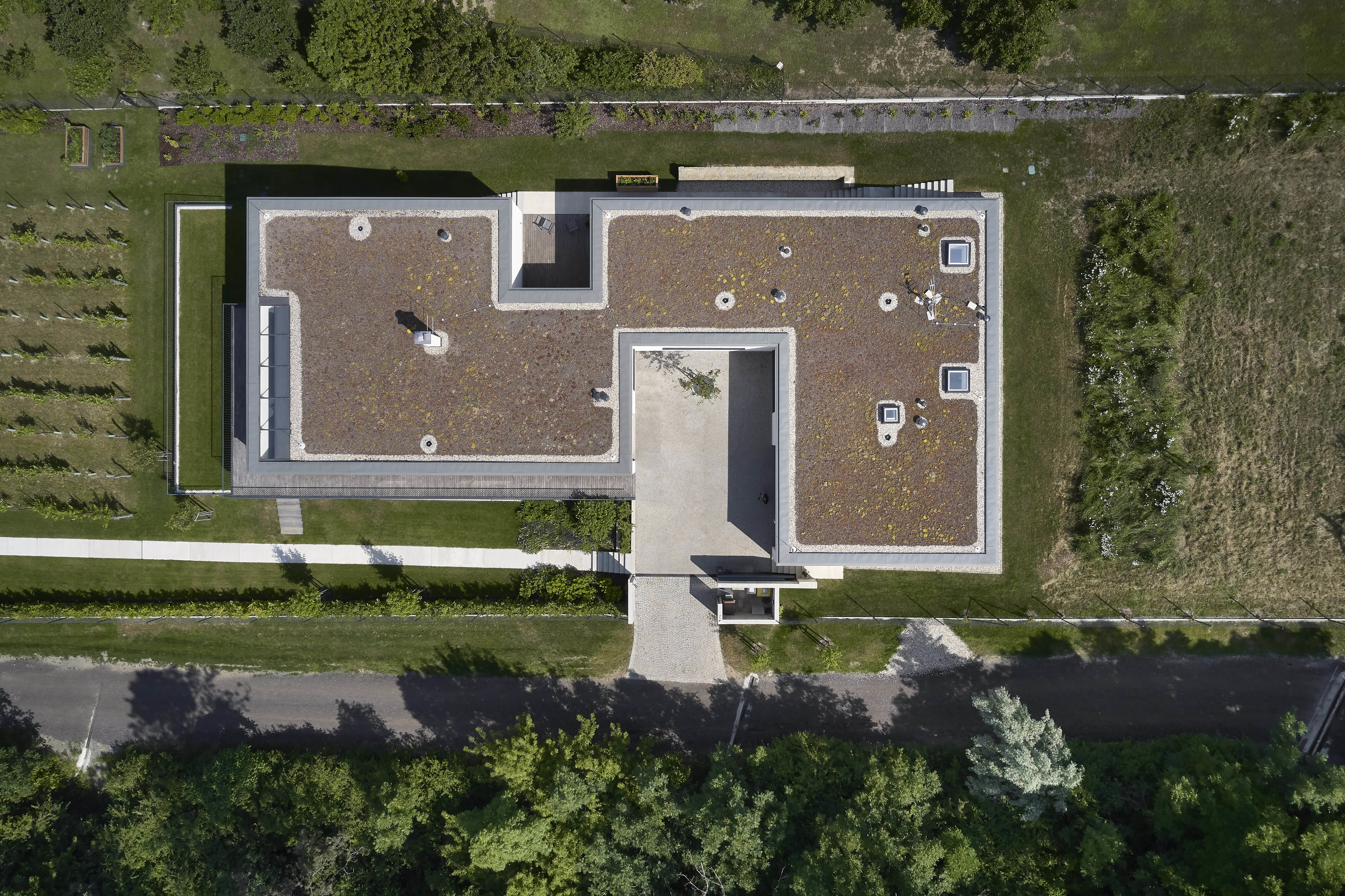 Štíhla dvojpodlažná hmota domu je votknutá do svahu. Pri pohľade z vrchnej časti pozemku objekt aj vďaka extenzívnej zelenej streche splýva so svahovitým terénom vinohradu. Na spodnej časti parcely, v úrovni susedných domov, situovali architekti garáž. Z ulice stúpa do svahu kaskádový chodník, vedúci k domu. Ďalšou z možností je prístup priamo z komunikácie, ktorá vedie pozdĺž južnej hrany parcely.