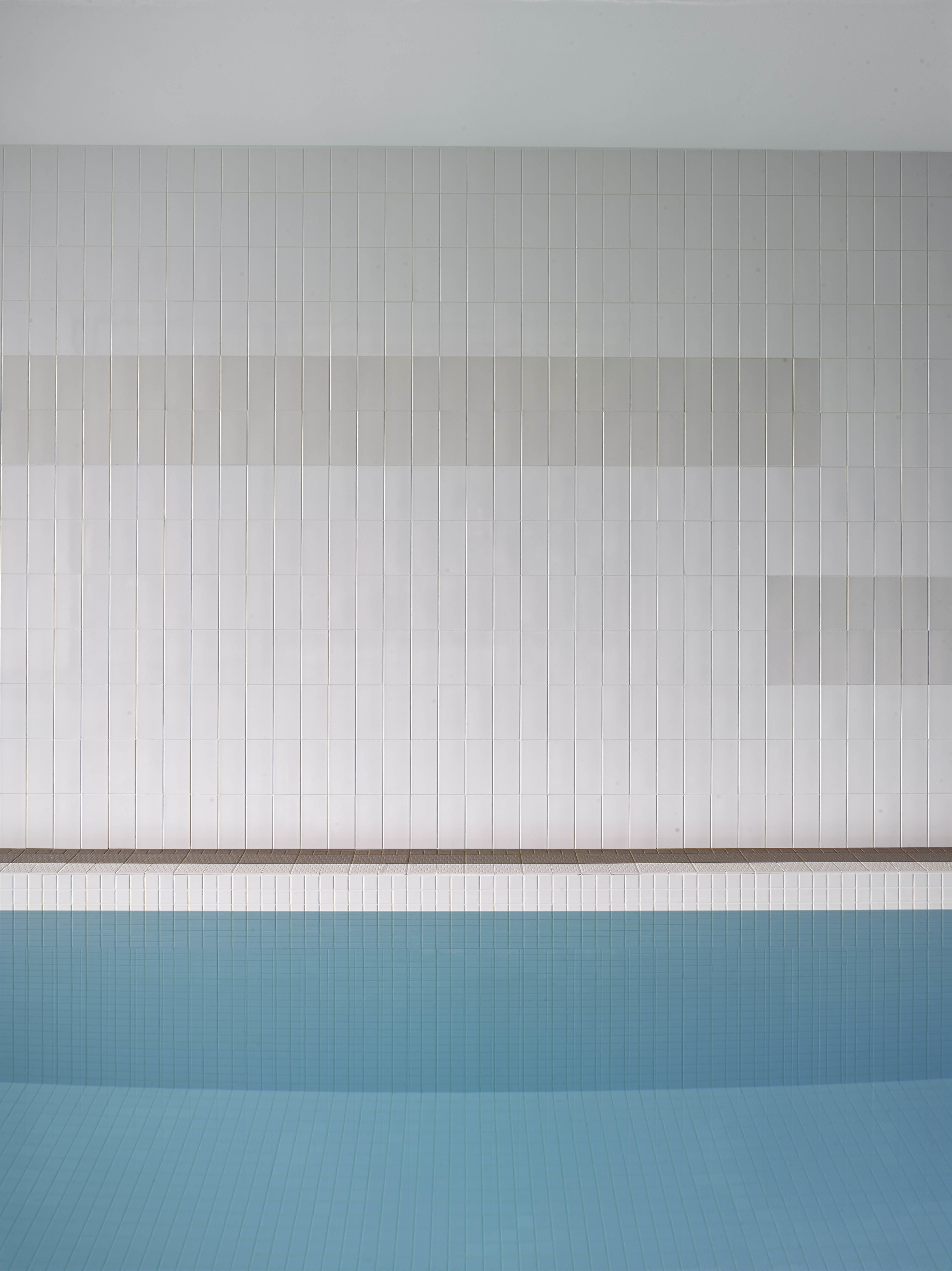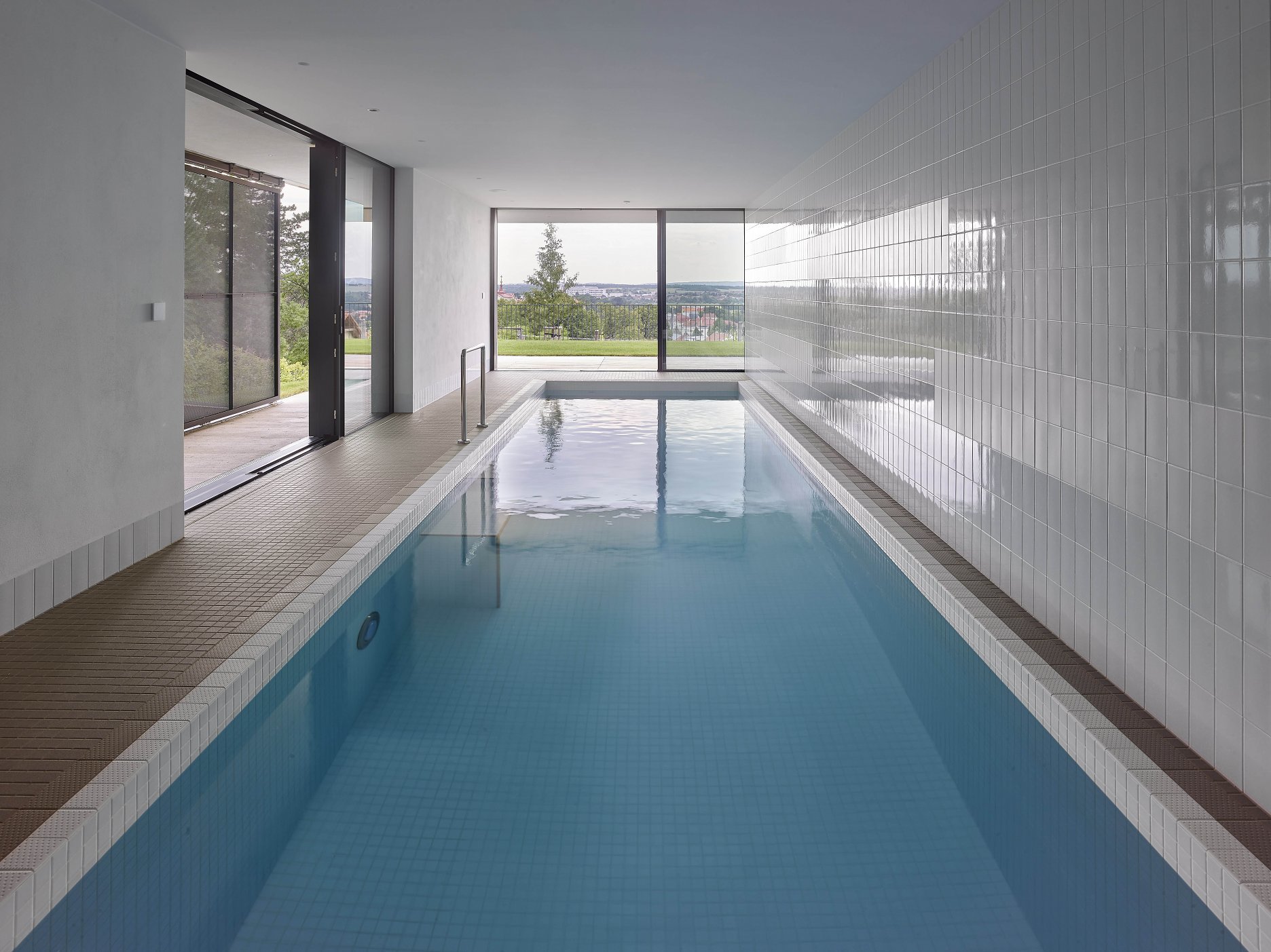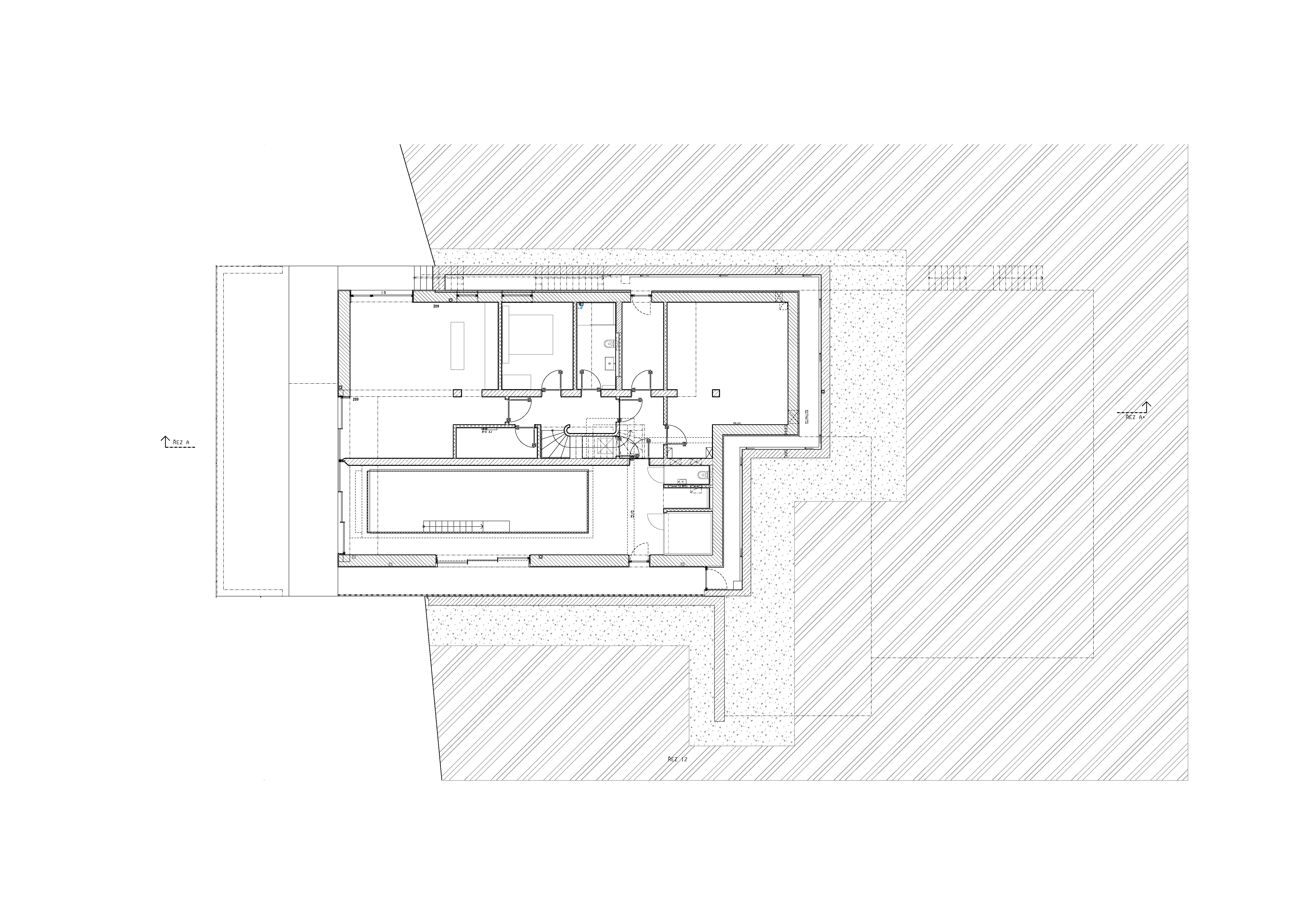 Schodisko zostupuje do športovo relaxačného podlažia, v ktorom sú umiestnené aj technické miestnosti. Bazén a spoločenská viacúčelová miestnosť sú orientované do priestorovo veľkorysej "saly terreno“ - druhej veľkej obytnej lodžie. Táto je na rozdiel od hornej prepojená s terénom a slúži aj ako hlavný vstup do kaskádovej záhrady. Lokalitný program zahŕňa tiež hosťovskú izbu so zázemím. V hĺbke dispozície nájdeme technické a skladové miestnosti.