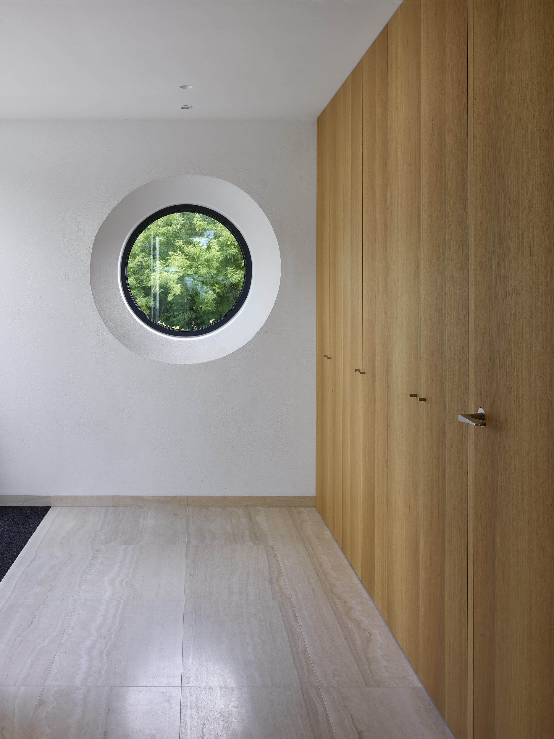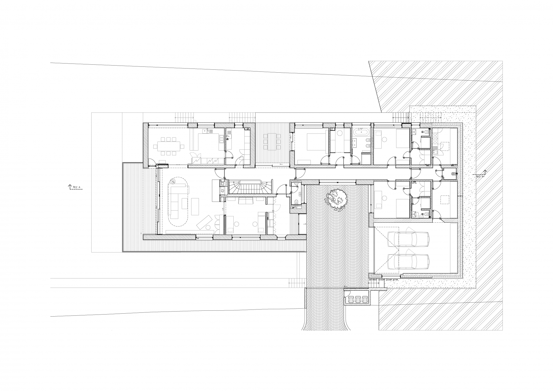 Hlavný vstup na južnom priečelí vedie do priestrannej vstupnej haly na vyššom podlaží. Na vstup priamo nadväzuje schodiskový priestor a pracovňa. Schodisko presvetľuje rozmerné okno, orientované do vnútorného átria. Presklené dvere v ľavej časti schodiskovej haly ústia do hlavného obytného priestoru. Dvere na opačnej strane oddeľujú nočnú zónu domu.