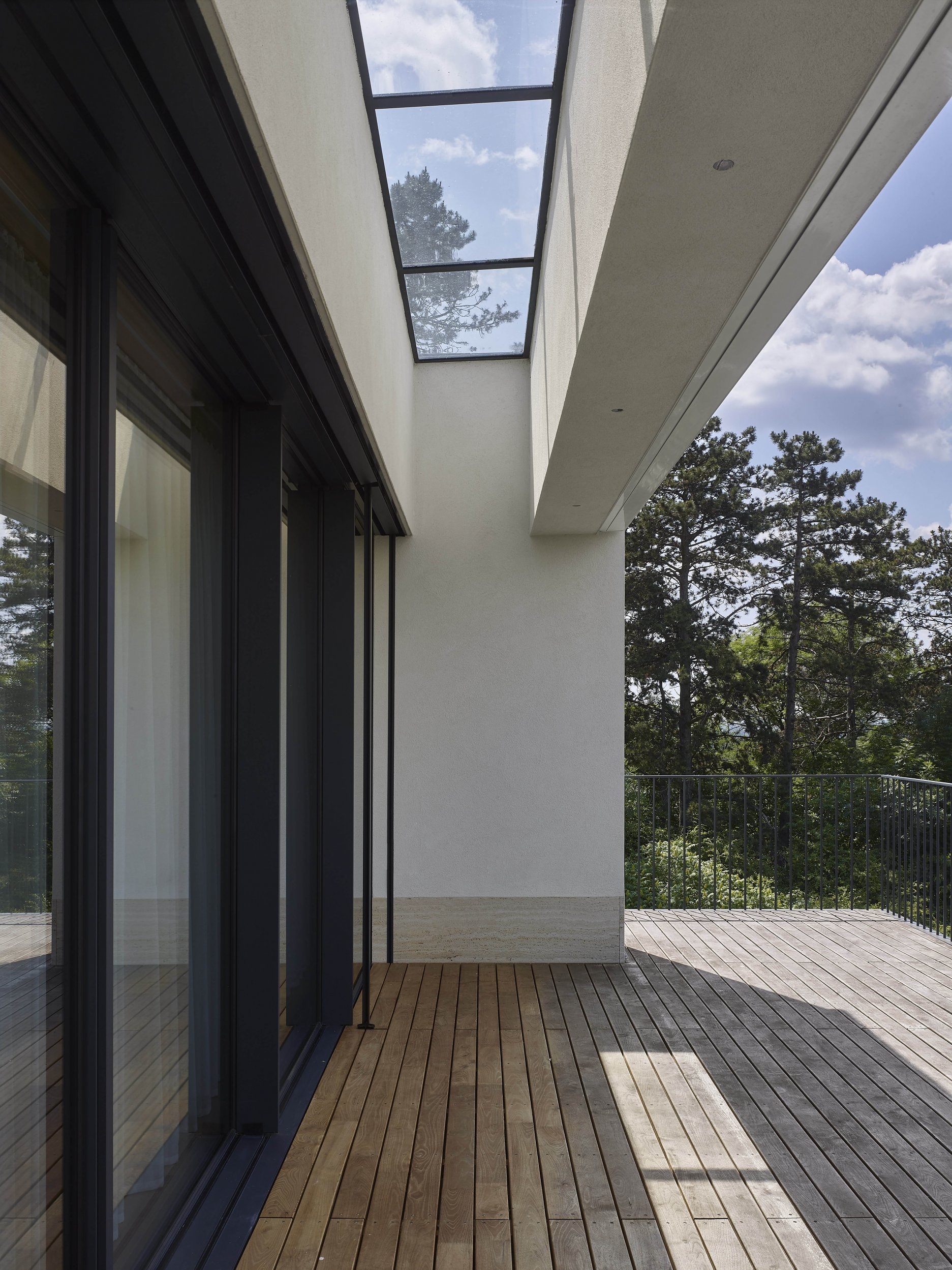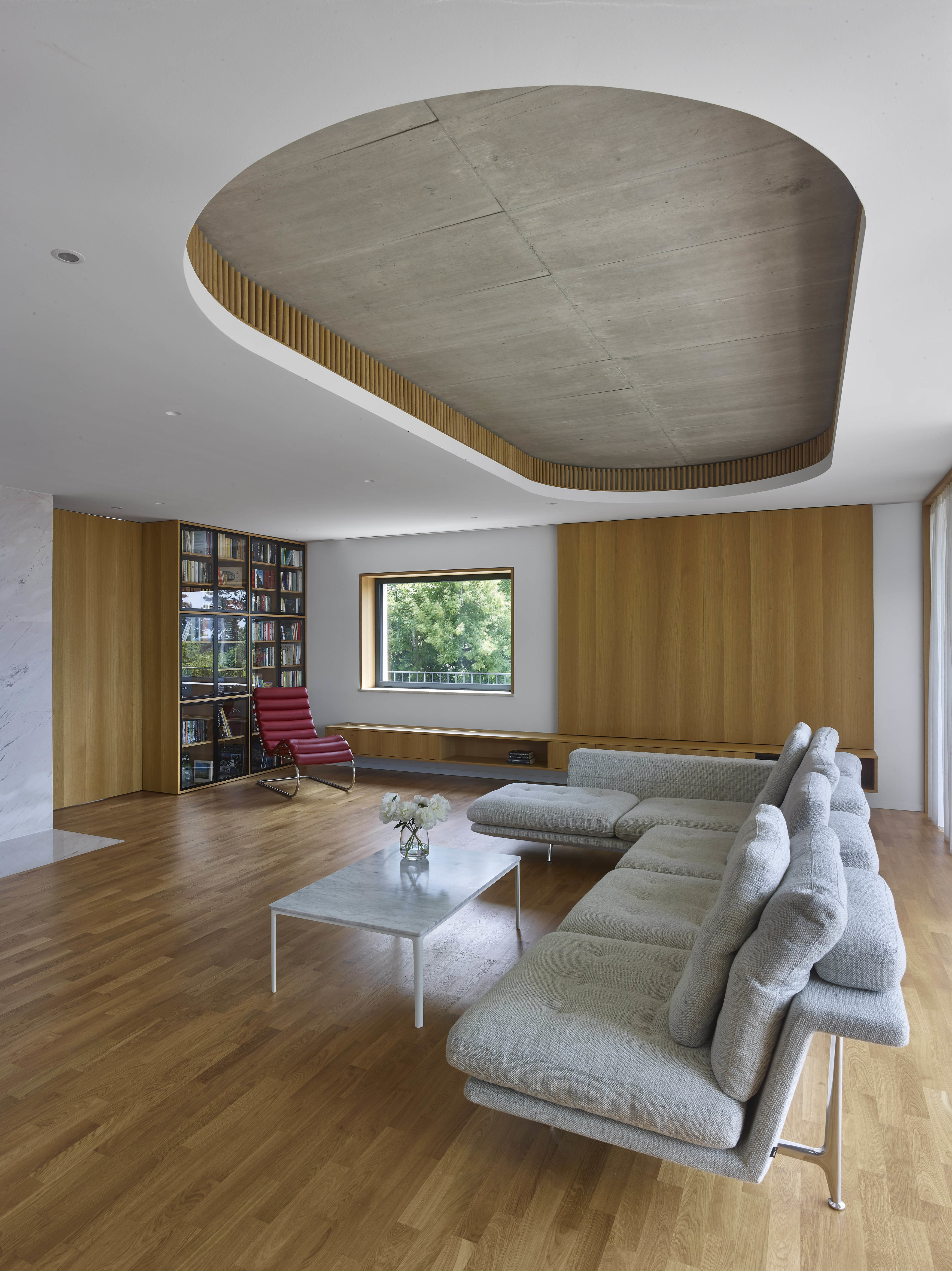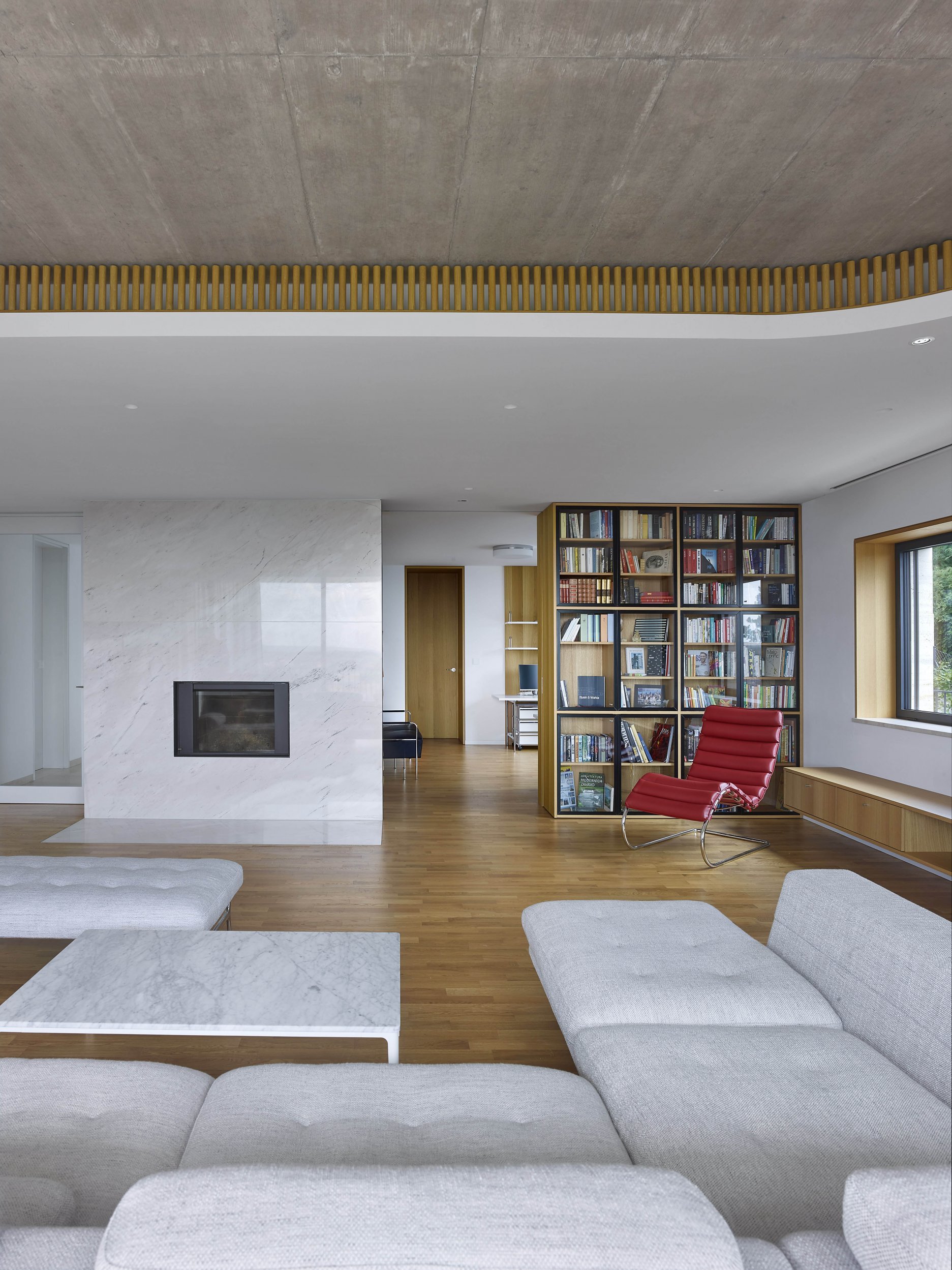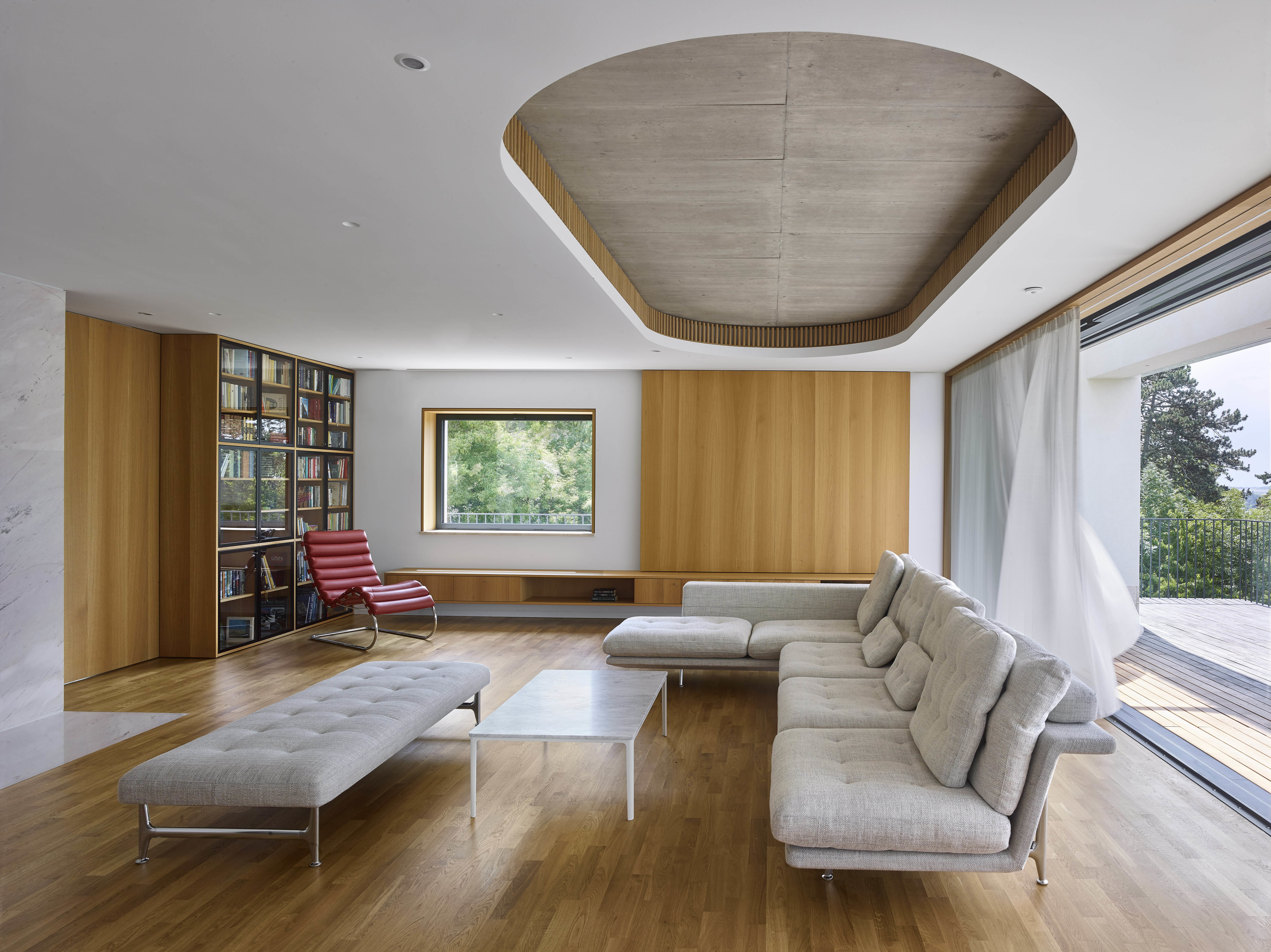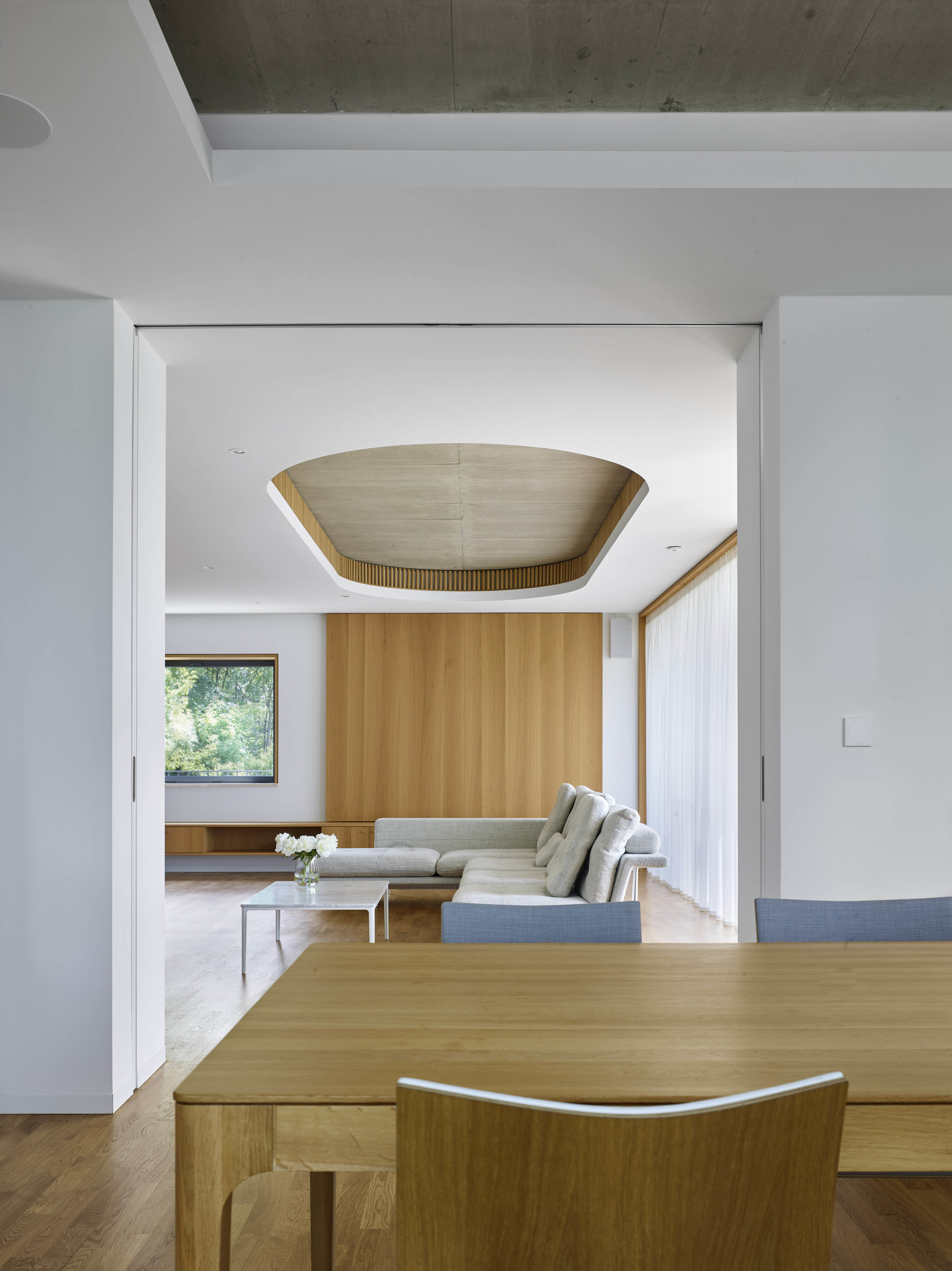 Hlavná obytná miestnosť je prirodzene orientovaná k západným panoramatickým pohľadom. Priestor s prijímacou a odpočinkovou funkciou je spojený s jedálňou s kuchyňou a pracovňou. V prípade potreby je možné jednotlivé celky oddeliť posuvnými dverami. Dennú zónu domu rozširuje priestorná lodžia, oddelená presklenou stenou. Nočnú časť člení chodba na južné a severné krídlo. V južnom krídle sú situované spálne detí. V severnom, s orientáciou do átria je spálňa rodičov.