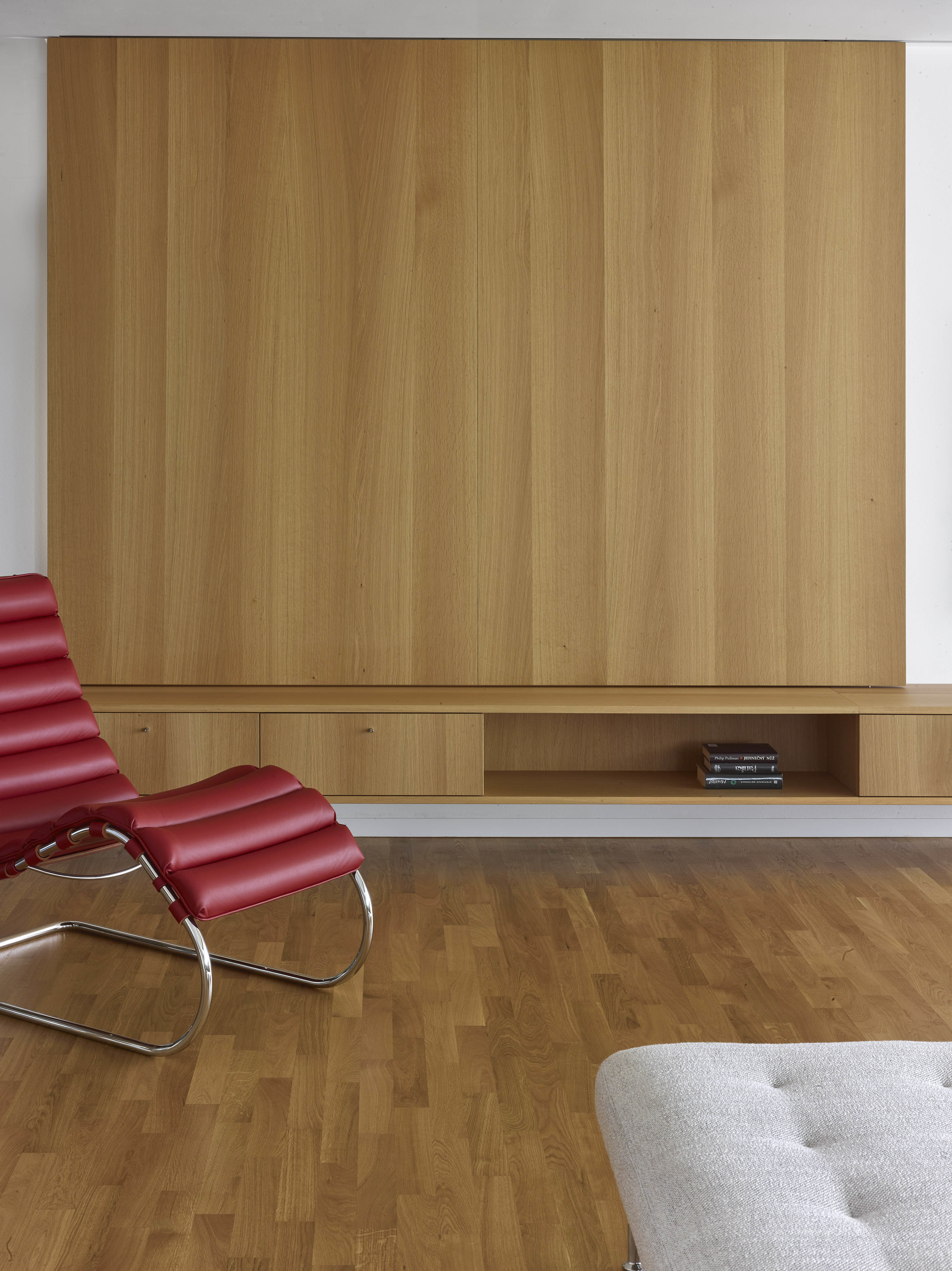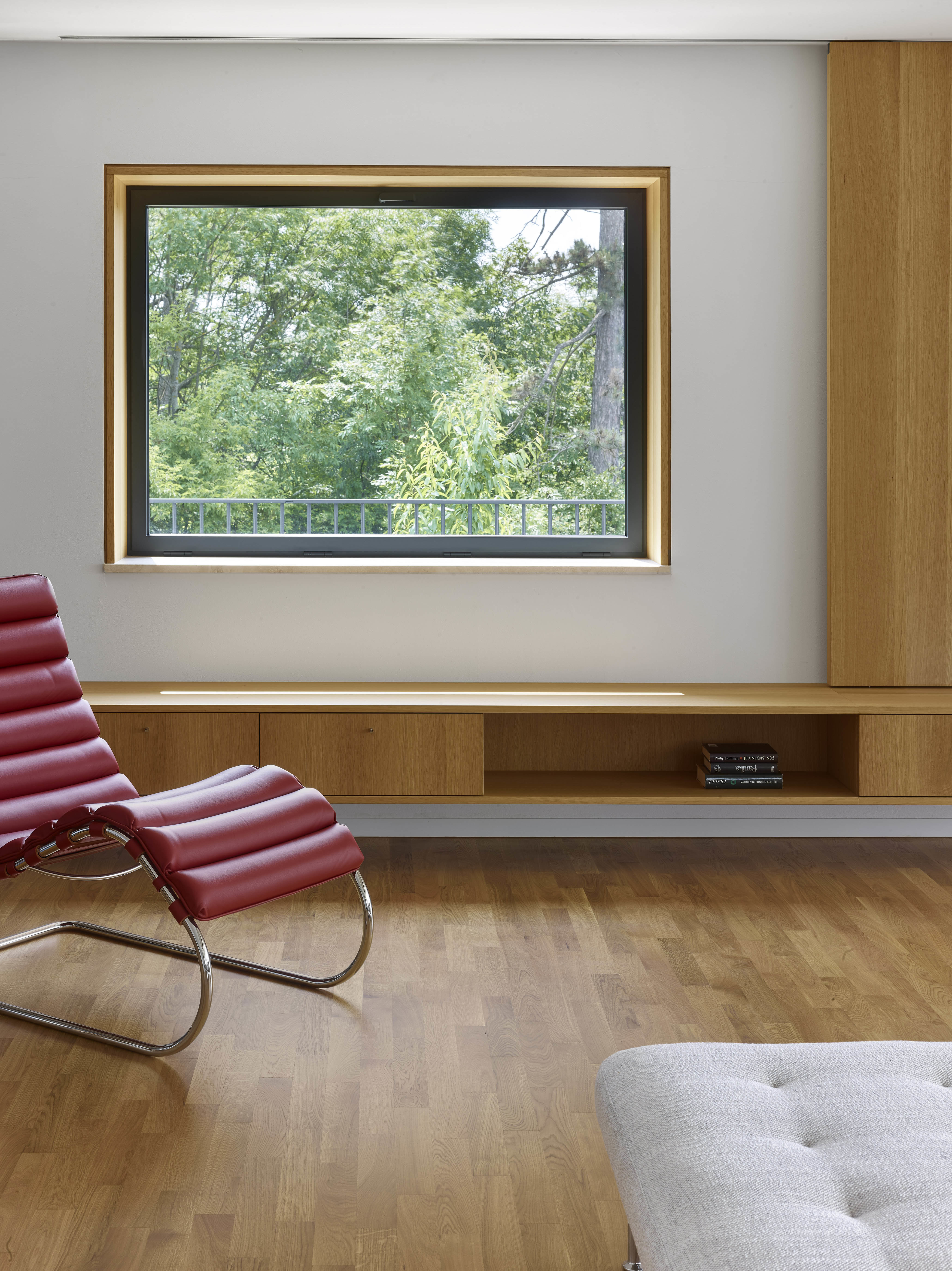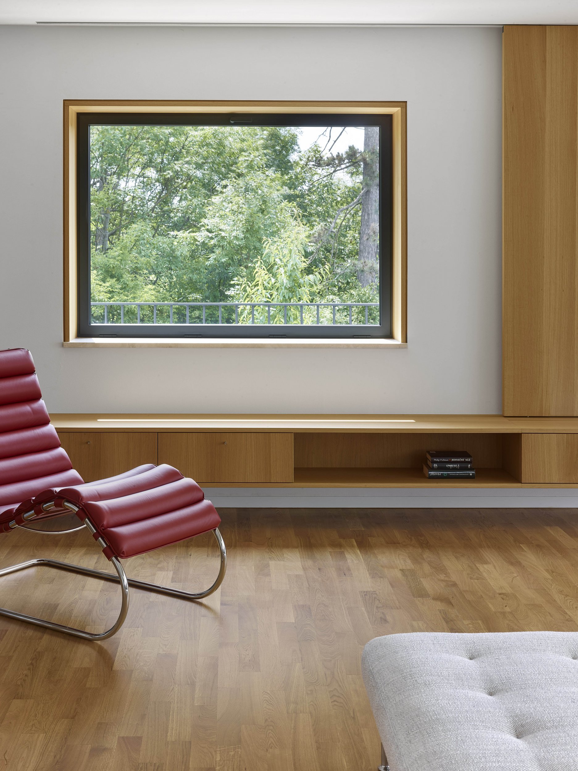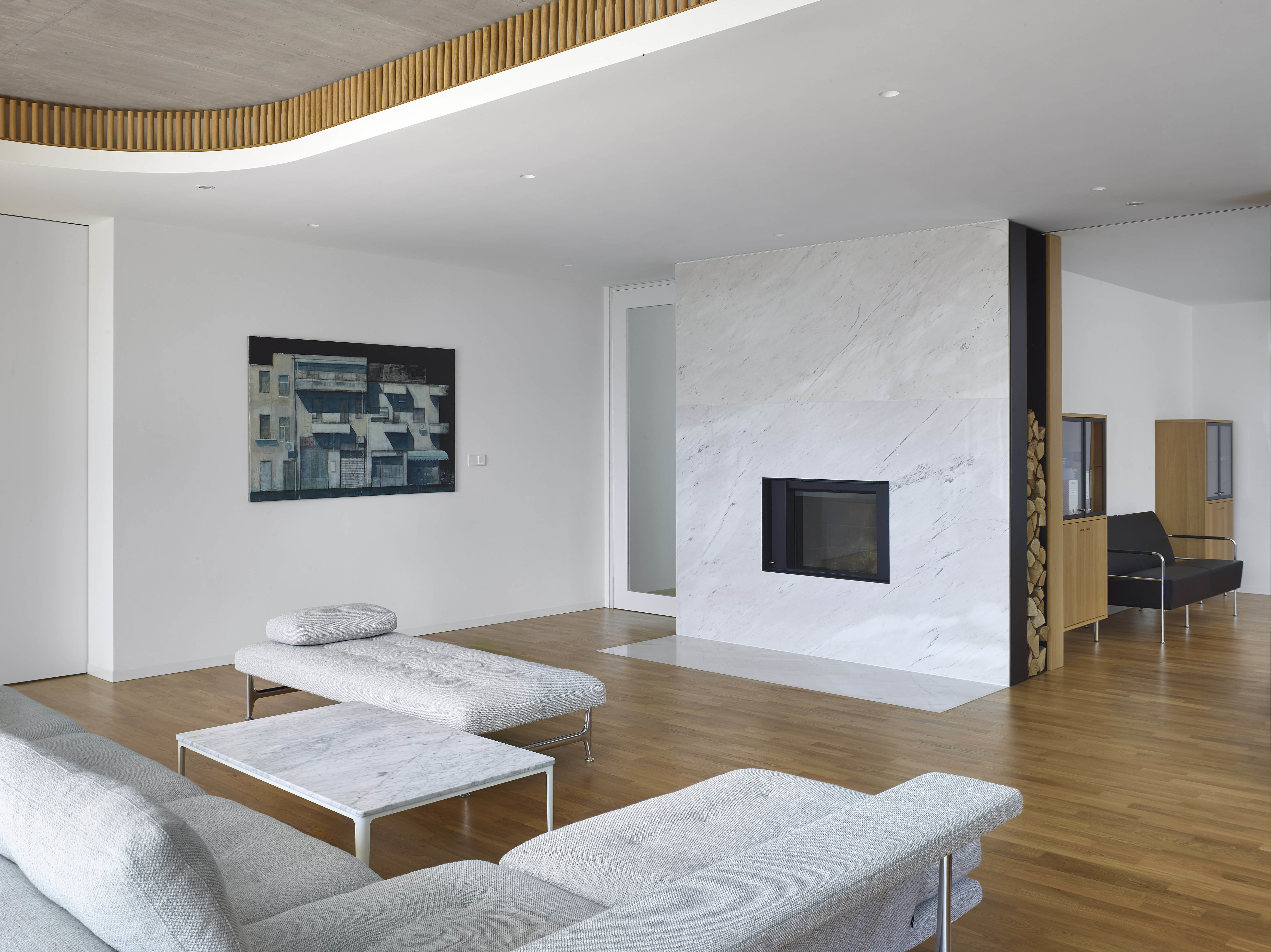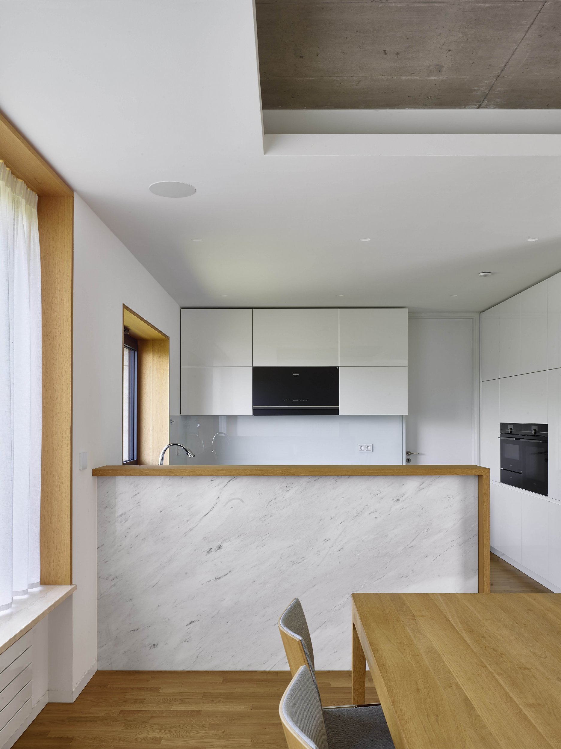 Interiér domu charakterizujú predovšetkým prírodné materiály. Na podlahách je použitý prírodný kaučuk, vápenec a masívne drevené parkety. Biele steny tvoria neutrálny podklad pre prírodnú dyhu a farebne lakované povrchy nábytku.