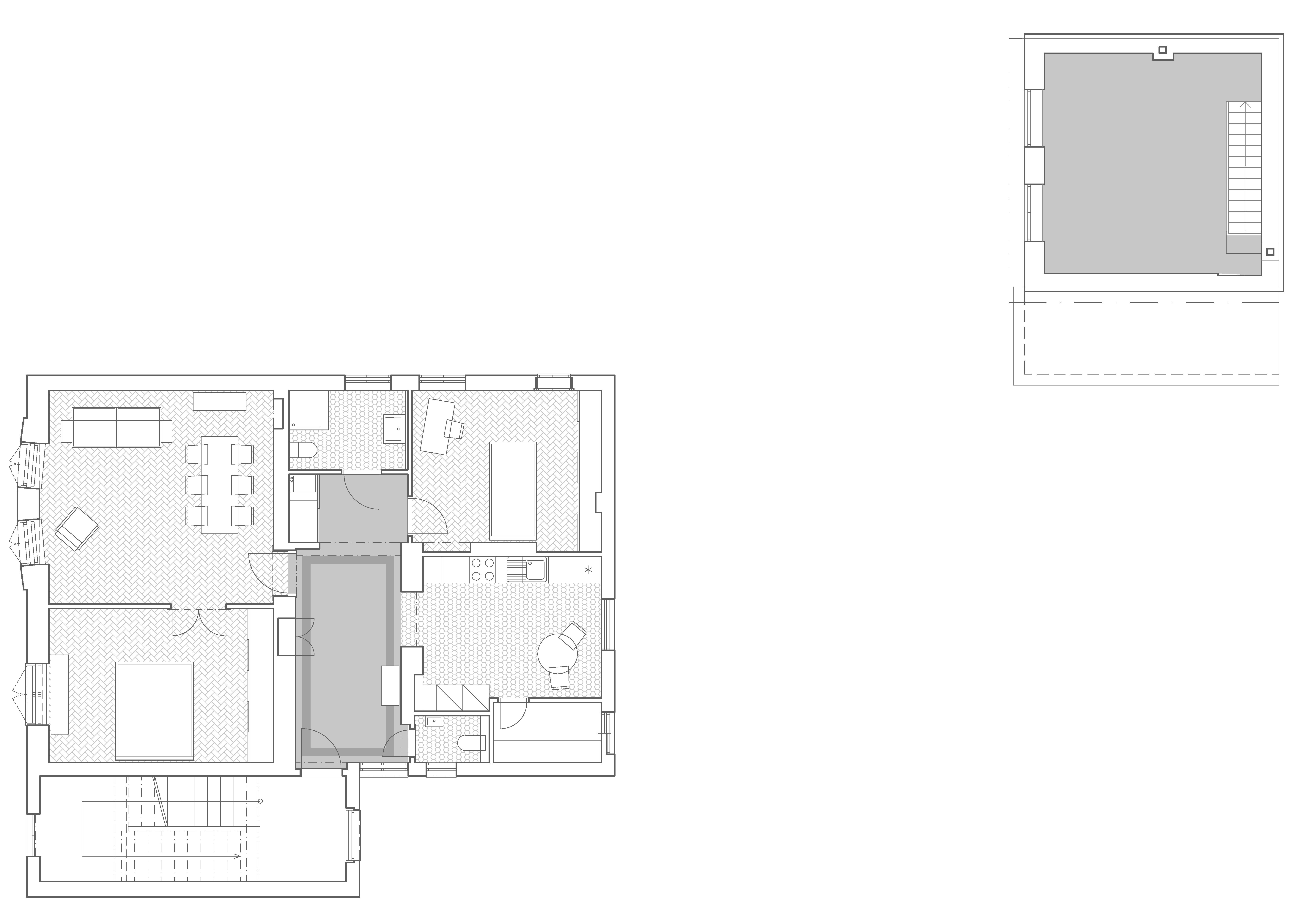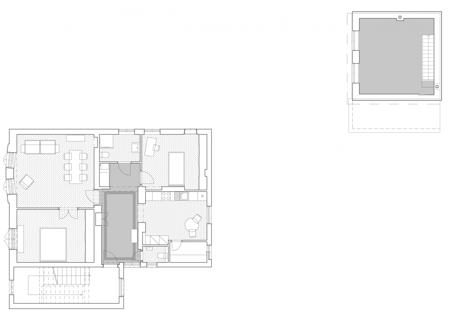 Nový krov vily kopíruje pôvodný tvar strechy, je však podchodný a staticky prispôsobený pre zateplenie a vnútorné zakrytie sadrokartónom. Priestor je možné celoročne využívať ako sklad, sú tu umiestnené kotle ústredného kúrenia. Na podlaží pod ním je plnohodnotný byt a na prízemí vznikli kancelárske priestory s kuchynkou a vlastným hygienickým zázemím. V objekte záhradného ateliéru sa zachovala pôvodná náplň: dvojpodlažné kancelárske priestory s vlastnou kuchynkou a hygienickým zariadením.