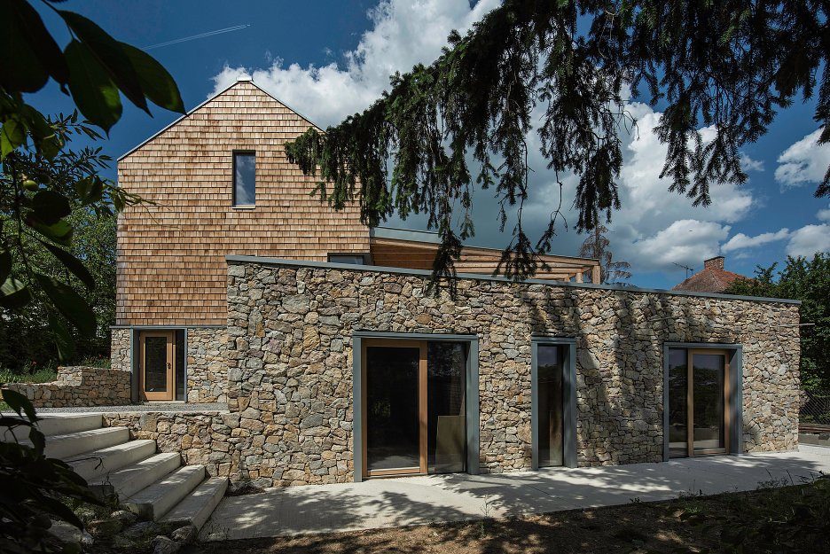 Architekti vsadili na kombináciu prírodných materiálov, bez dodatočnej povrchovej úpravy. Odhalené povrchy a ich hrubá štruktúra sľubujú minimálne nároky na budúcu údržbu a prirodzené starnutie fasád domu.
