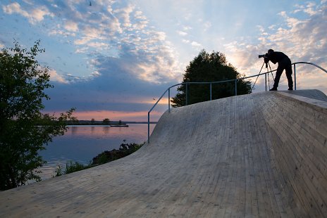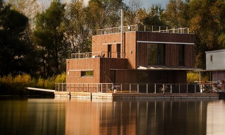 Jednopodlažnému bungalovu dominuje centrálny obývací priestor s krbovou pieckou. Sekundárne funkcie sú vytlačené do strán, svojím objemom ohraničujú spoločenskú miestnosť. Harmonikové zasklenie eliminuje rozhranie vnútri - vonku. Valbová strecha asymetricky, podľa potreby prekrýva je jednotlivé strany "krabice". Smerom k jazeru - nad terasou sú to takmer tri metre cenného priestoru chráneného pred slnkom a dažďom.