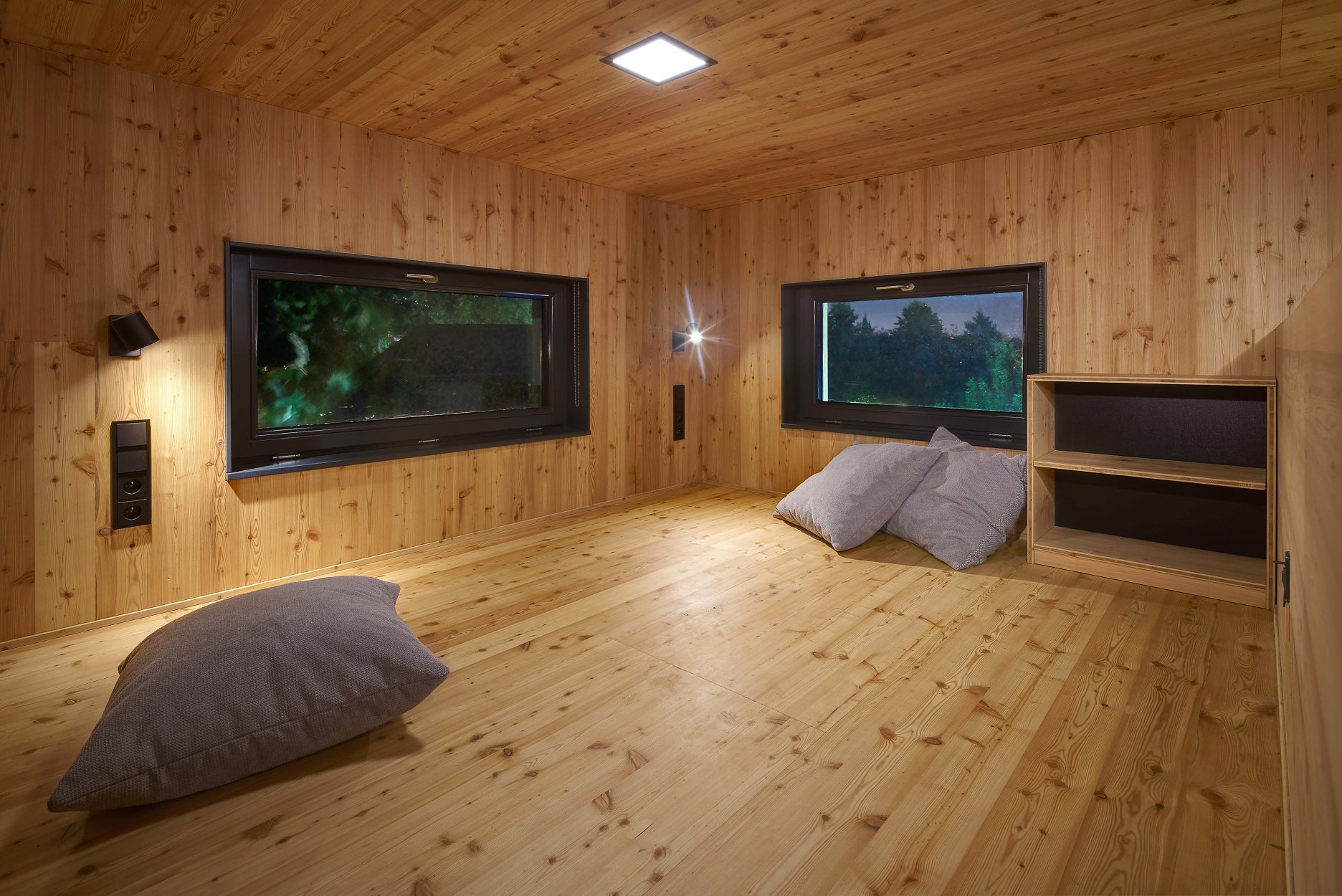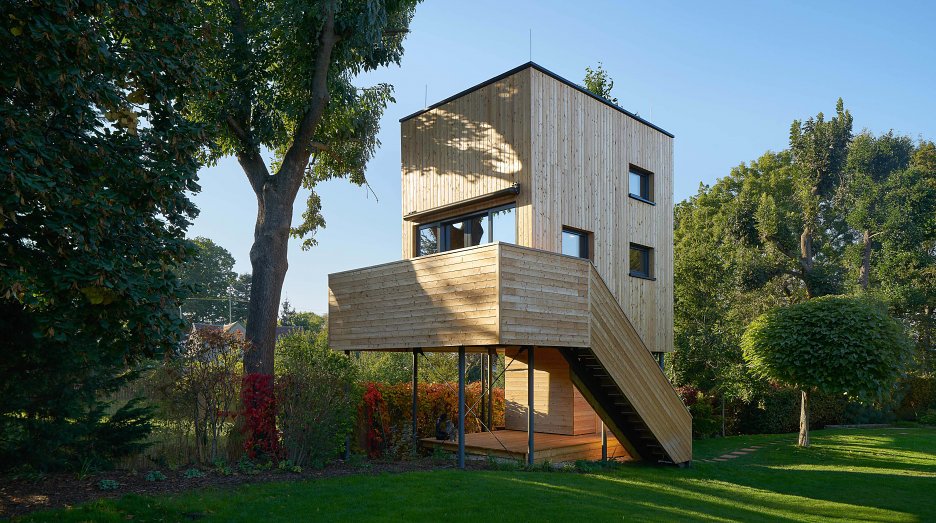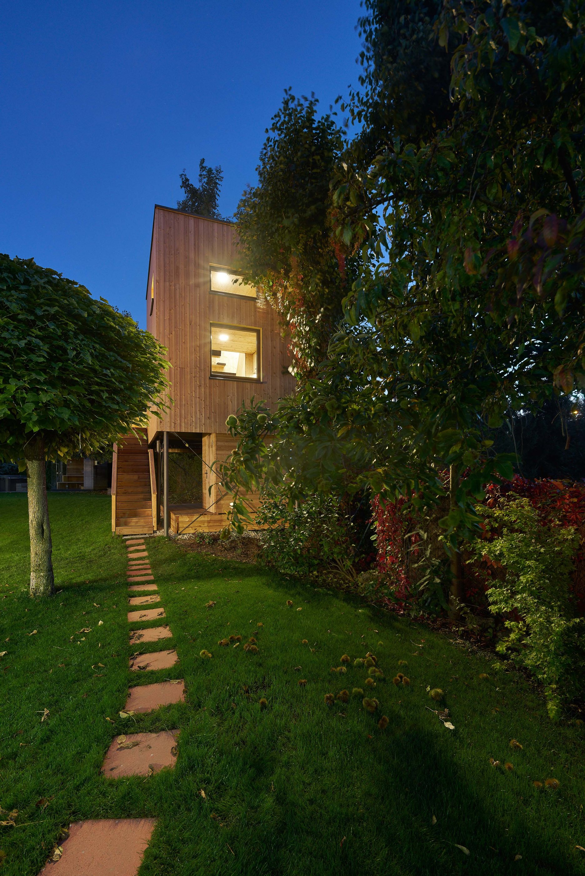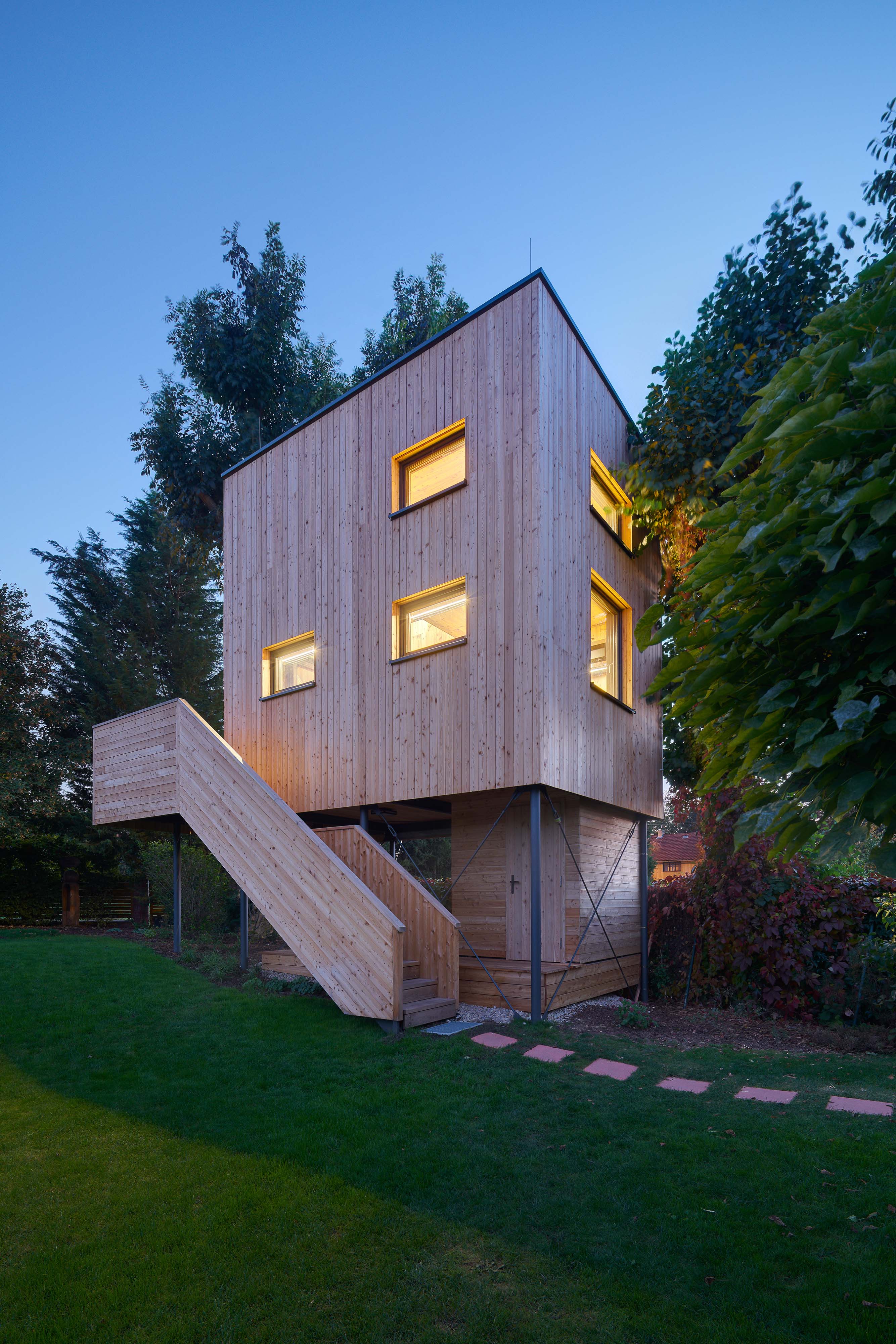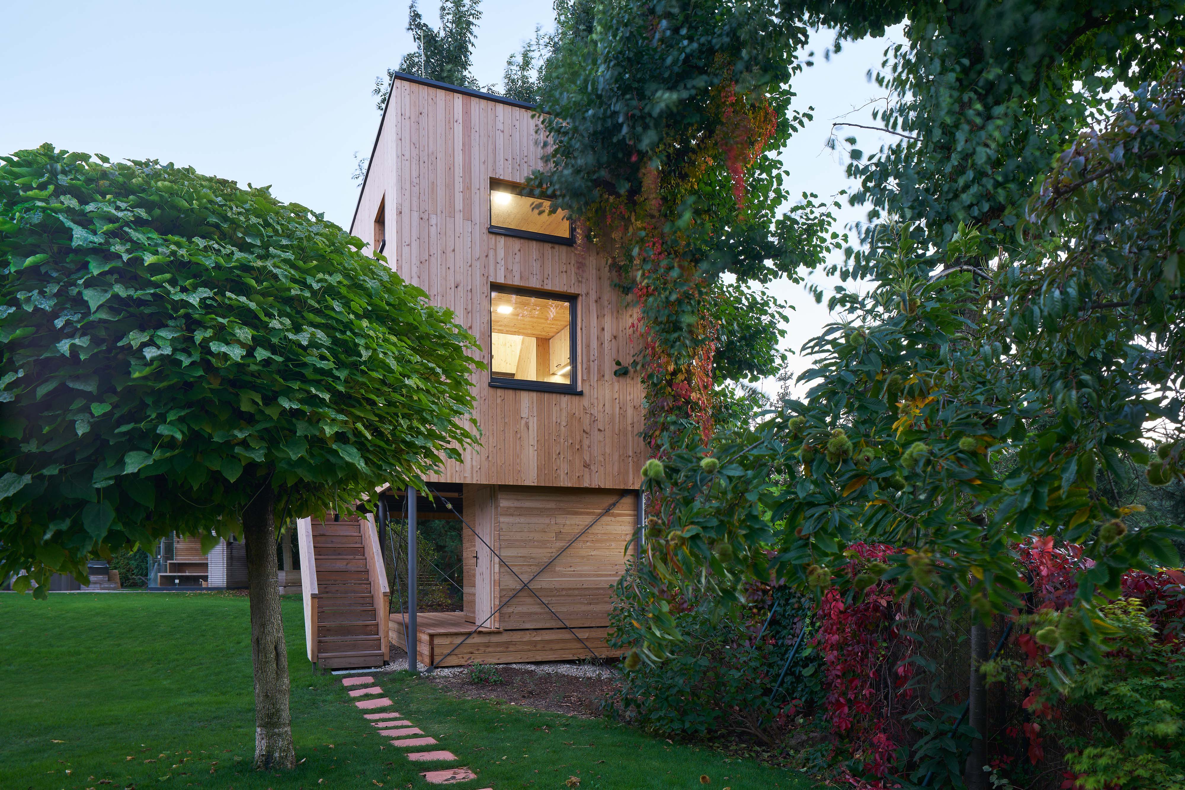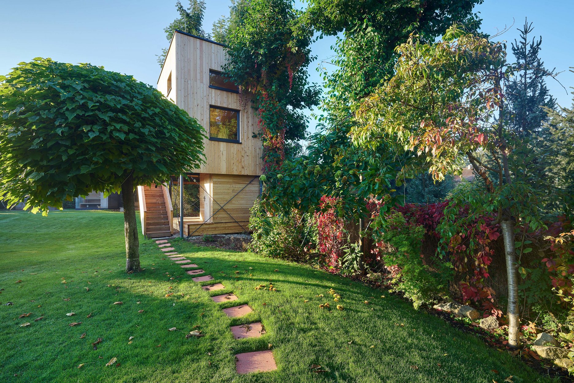 Výsledkom je celoročne obývateľný domček s podlahovou plochou 25 m², osadený hneď vedľa urasteného brestu, na hranici pozemku a záhrady.