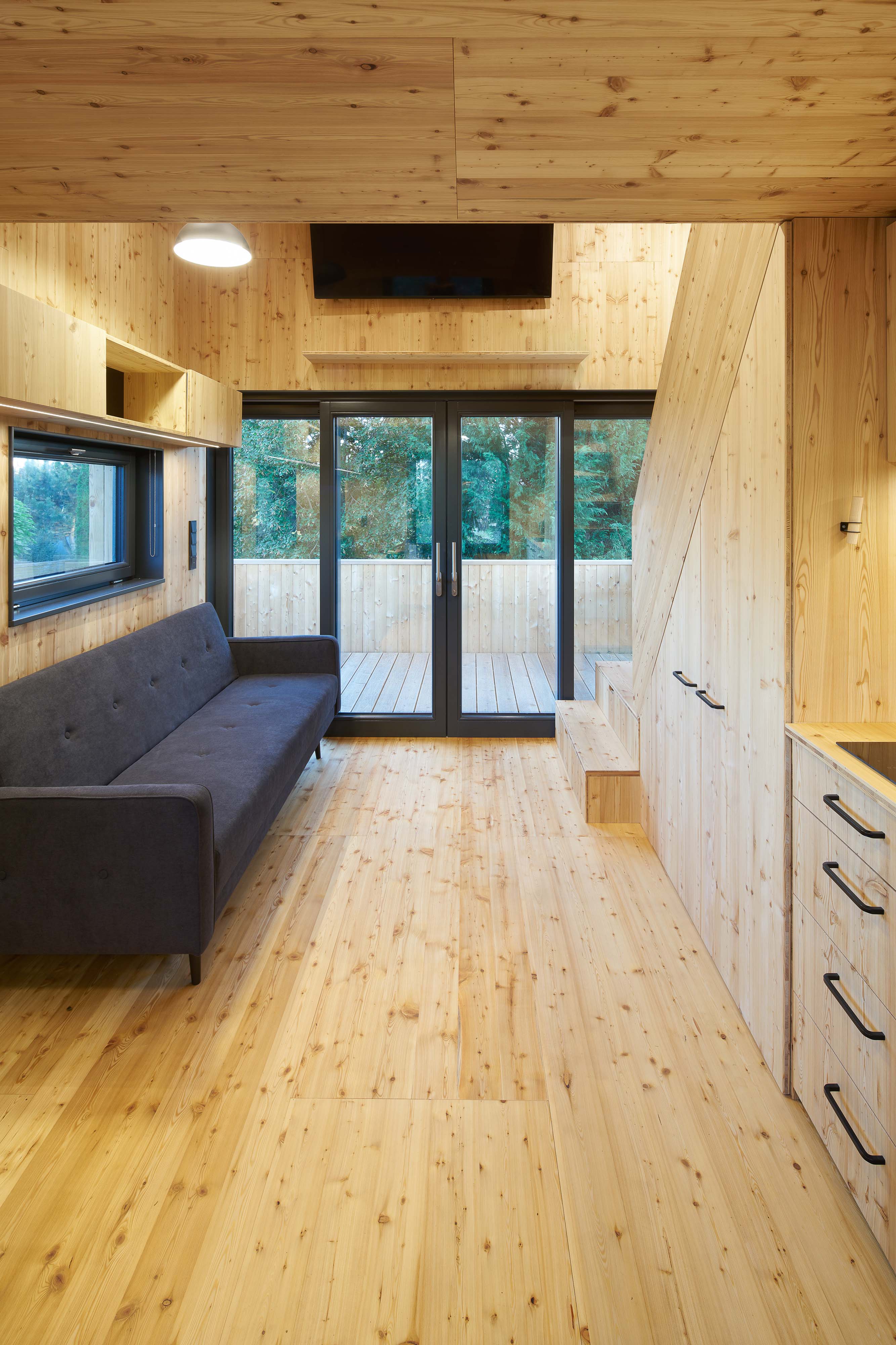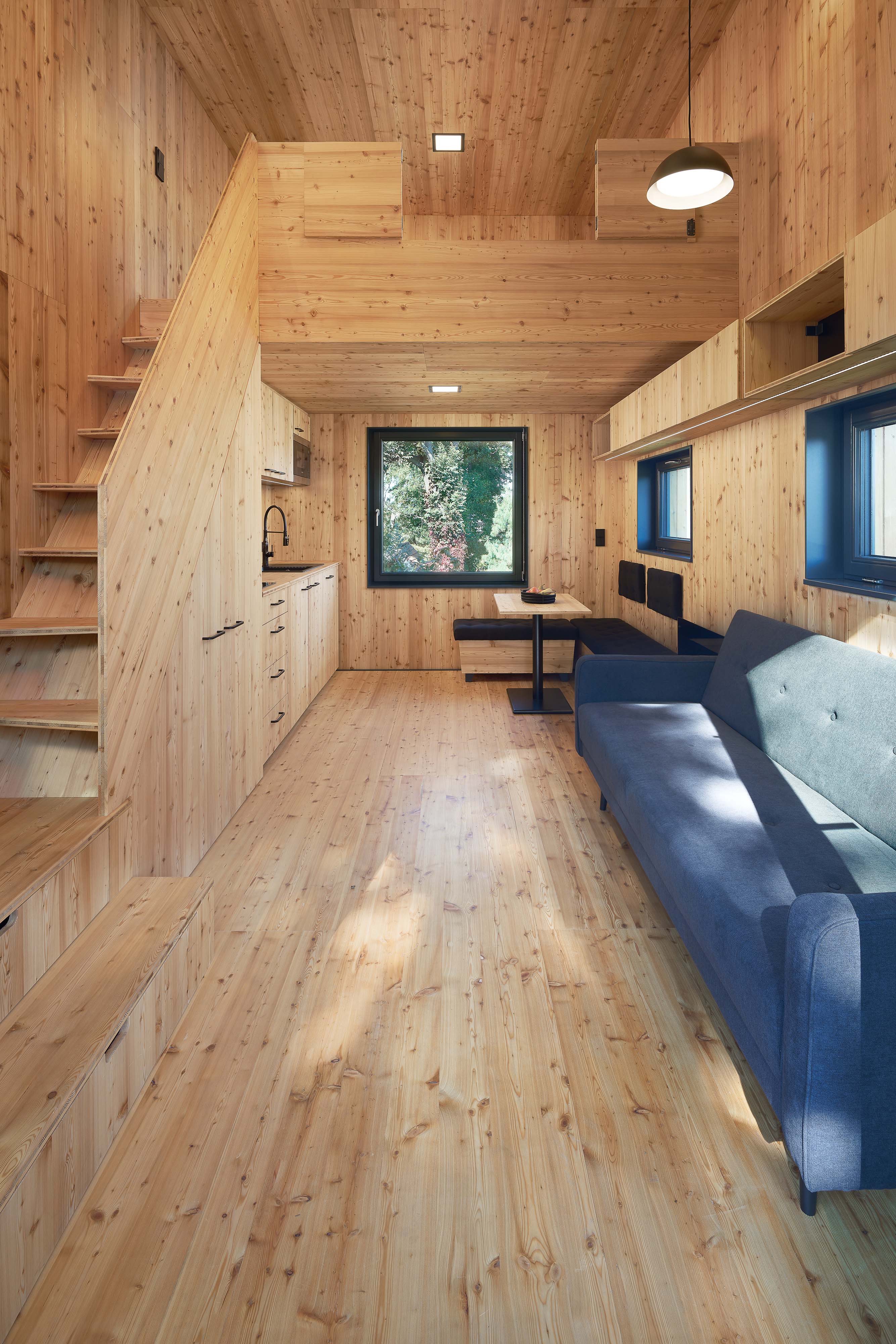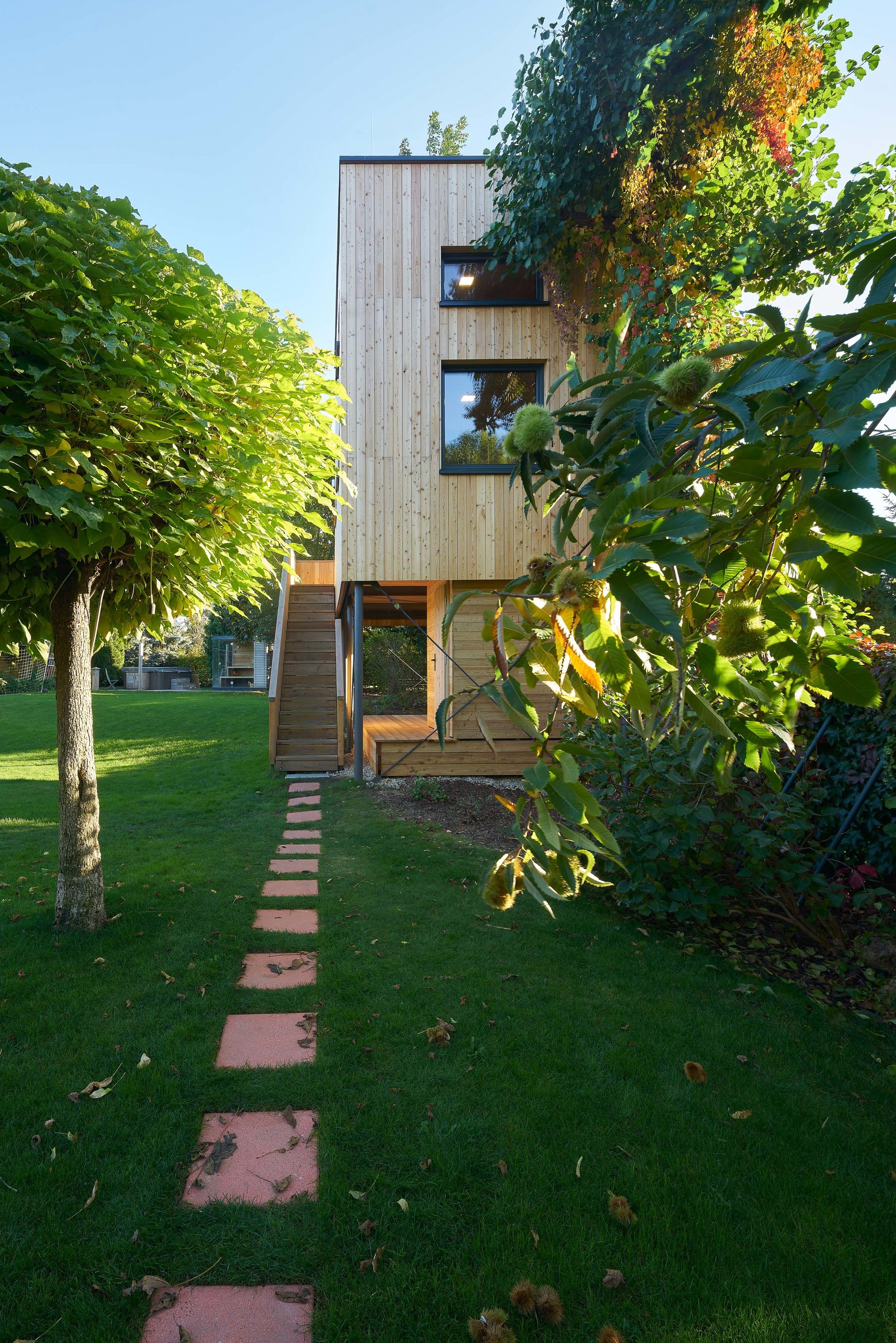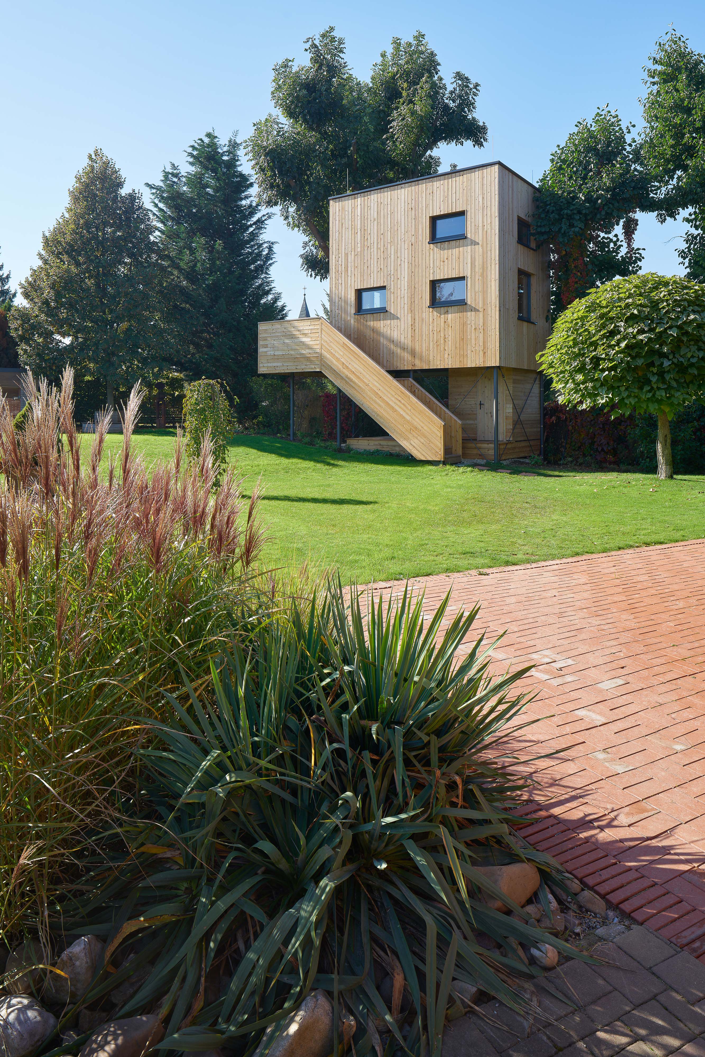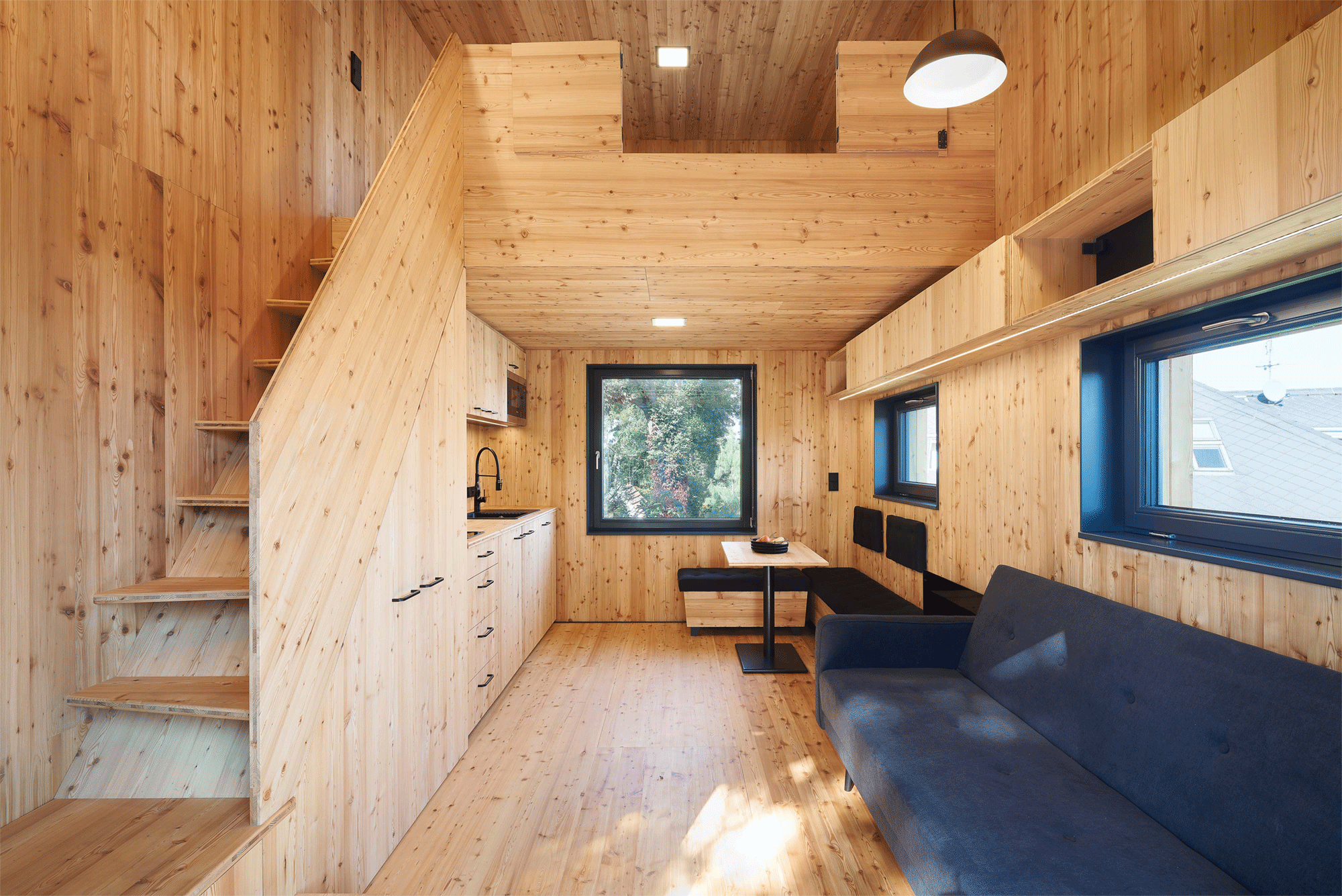 Výsledkom je celoročne obývateľný domček s podlahovou plochou 25 m², osadený hneď vedľa urasteného brestu, na hranici pozemku a záhrady.