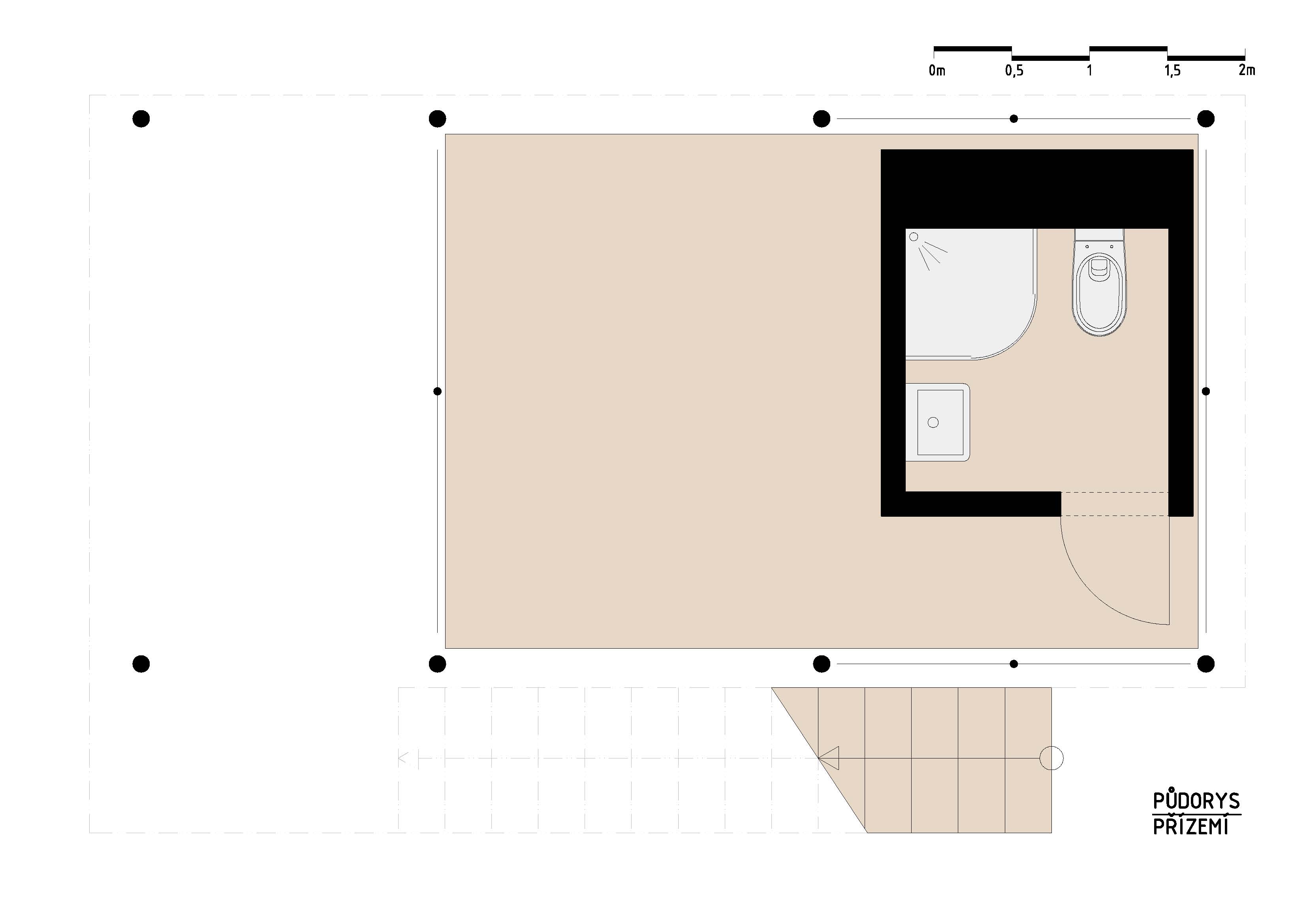 Na ustúpenom prízemí sa nachádza hygienické zázemie s výmerou 2,9 m². Slúži nielen pre drevostavbu, ale tiež ako pohotovostná toaleta pre záhradu. Terasu na prízemí, krytá vyššími poschodiami, využíva rodina celoročne na cvičenie jogy.