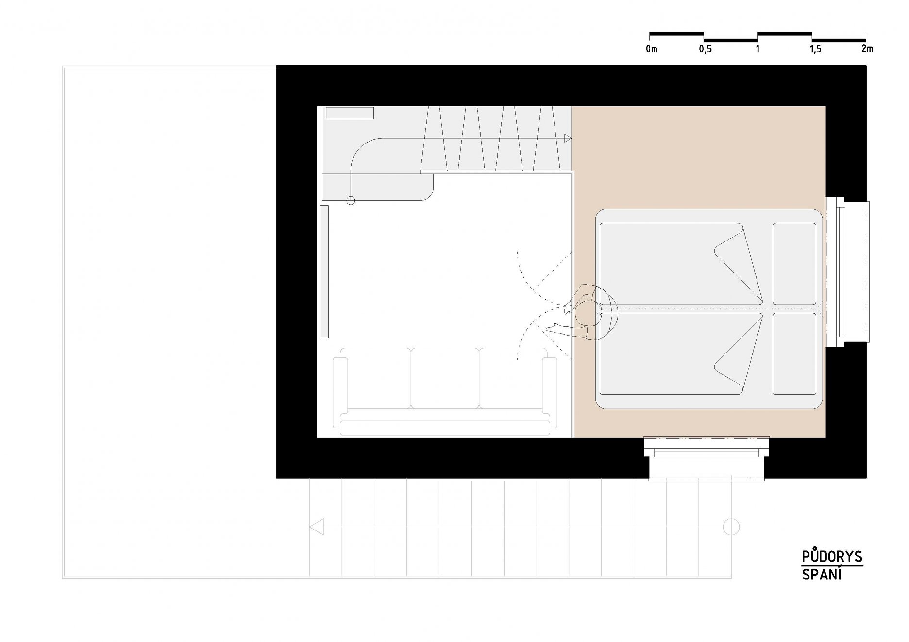 Mlynárske schody ďalej vedú do malej spálne s podlahovou plochou 7,3 m2. Zaujímavým detailom sú otvárateľné dvierka v stene, ktoré umožňujú sledovanie TV, situovanej nad vstupným HS portálom v obývačke. Priestor pod schodmi využíva vstavaná skriňa.