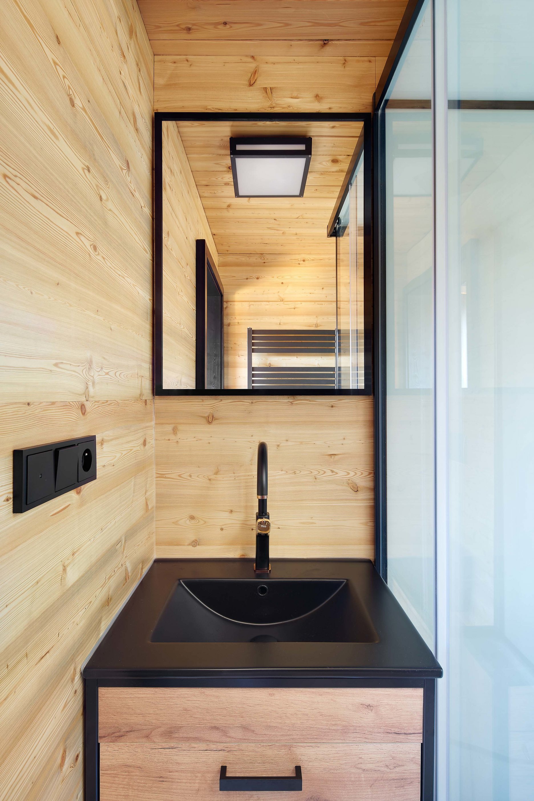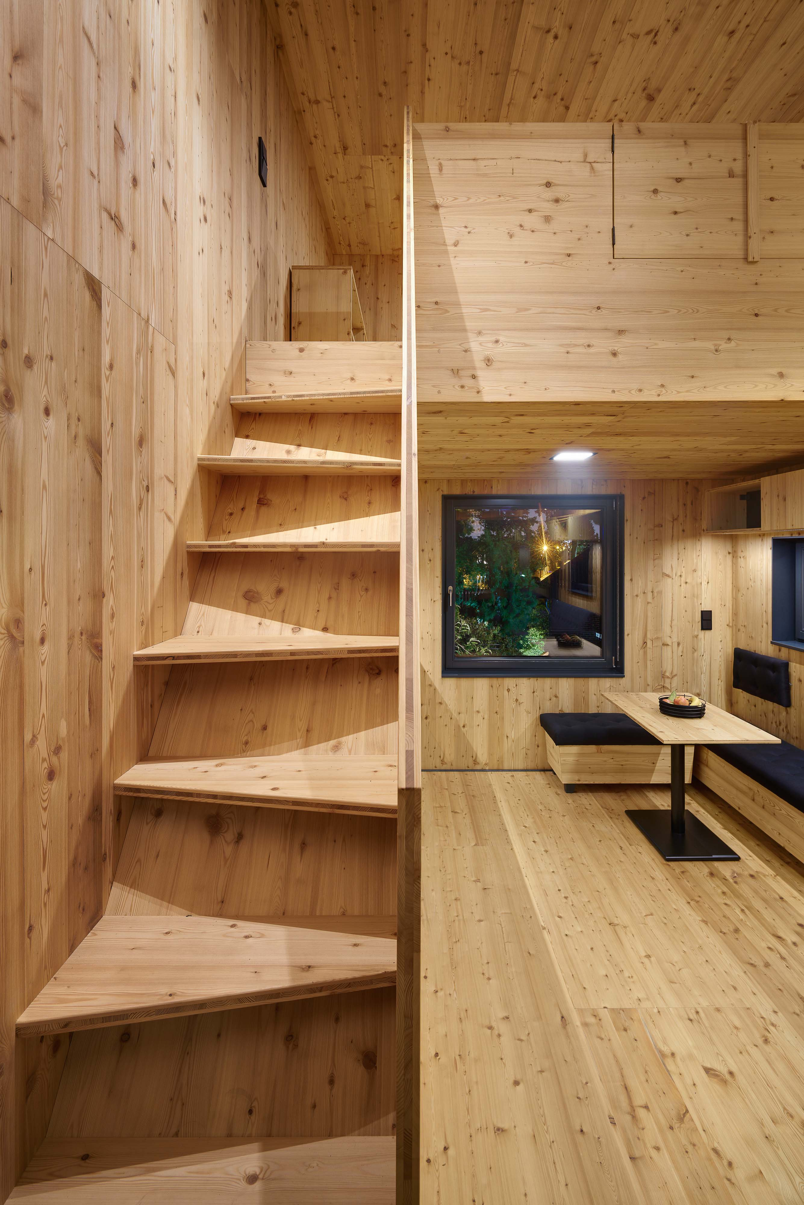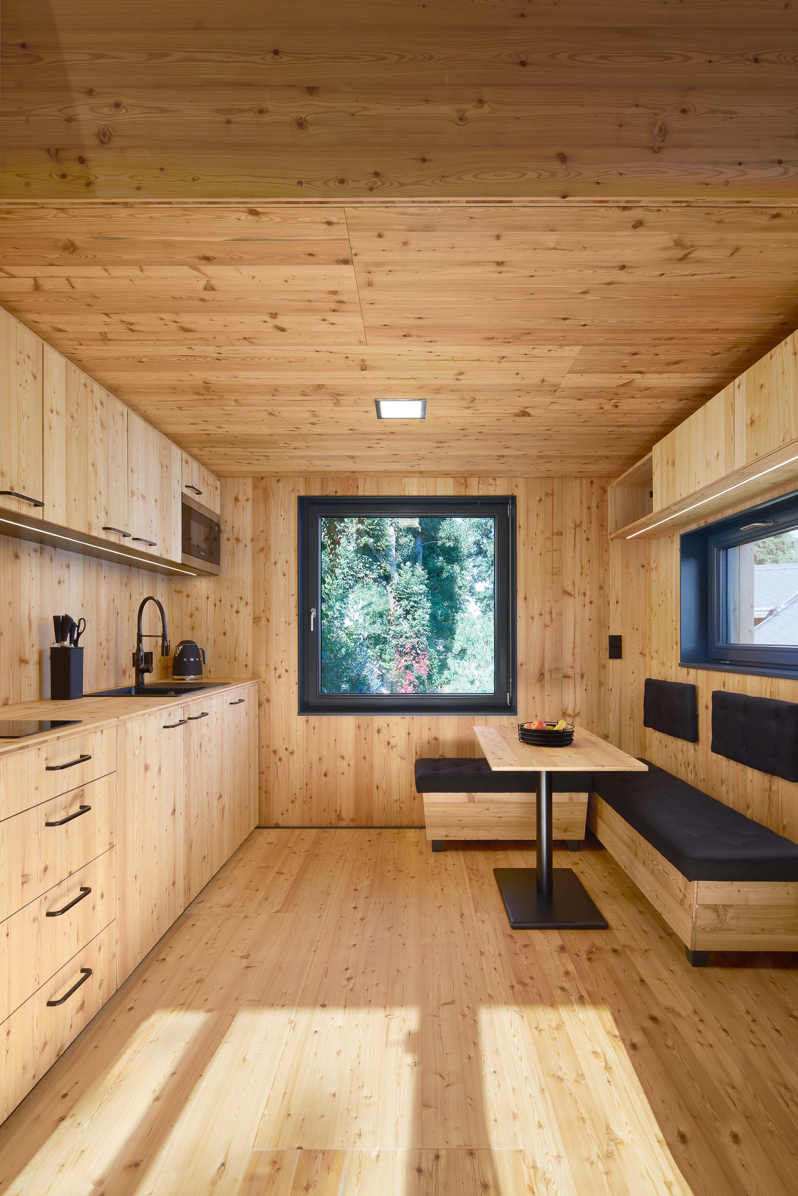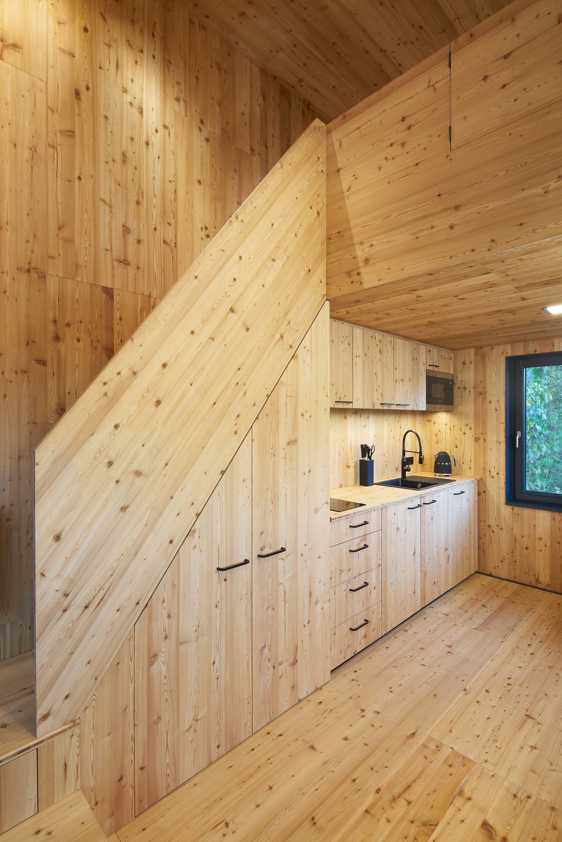 Drevostavba, realizovaná ako stĺpikový systém two by four, stojí na oceľovej konštrukcii. Ako obklad zo strany exteriéru zvolil architekt palubové dosky z odolného smrekovcového dreva. V interiéri slúžia ako finálna pohľadová vrstva veľkoplošné smrekové biodosky.
