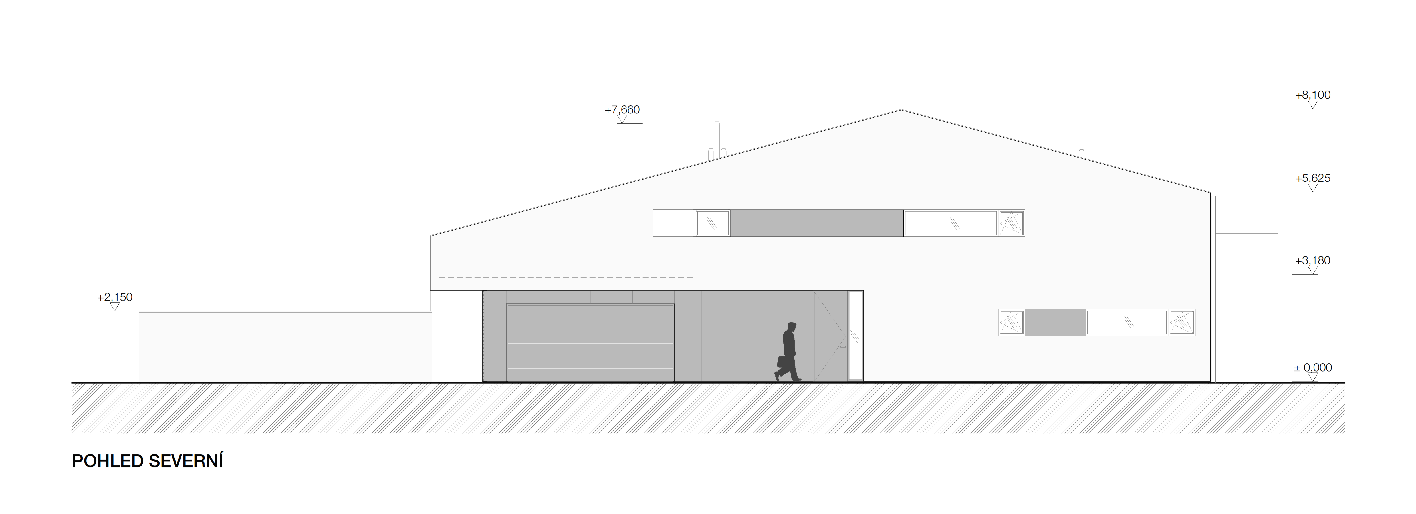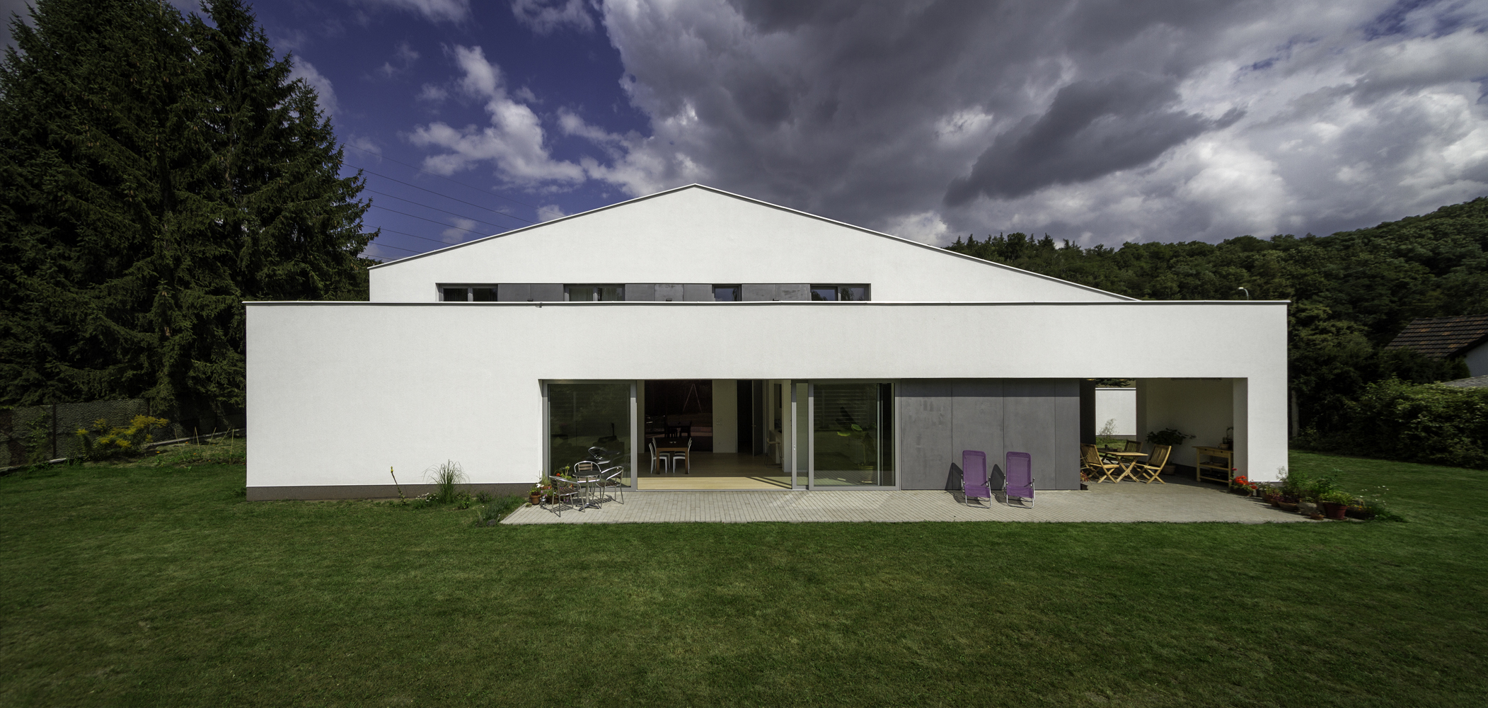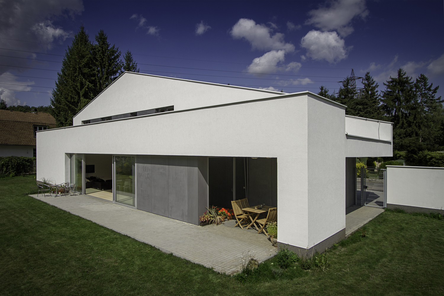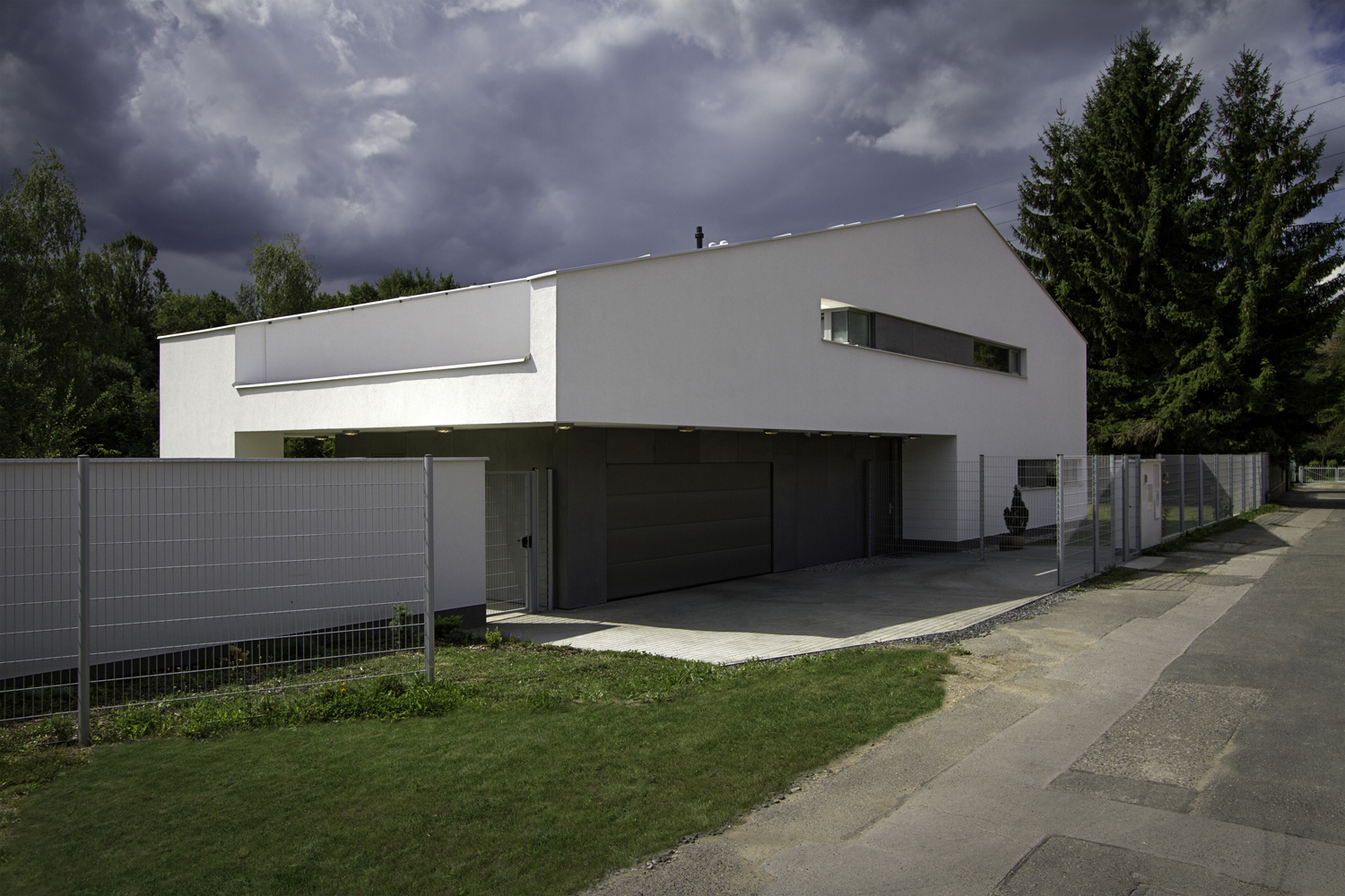 Zapálený pro svou vizi, ale nejistý v tom, jak jí dosáhnout, zapojil klient do návrhu svého moderního, minimalistického a otevřeného rodinného domu architekty z ateliéru 4a. Záměr, se kterým byl dům projektován, od nás vyžadoval použití minimálního množství detailů. Vyjádřili jsme se pouze s pomocí několika málo přírodních materiálů, v monochromatickém barevném ladění. Úspěšně jsme zvýšili koeficient zastavění, museli jsme ale čelit mnoha omezením z hlediska zásad celkového urbanistického a architektonického řešení v dané lokalitě Jenerálka. Podařilo se nám interpretovat klasickou a v místní zástavbě převládající sedlovou střechu novým způsobem, který odpovídal požadavkům klienta na současný moderní dům. V našem pojetí se tradiční tvar přetavil v pozvolně stoupající a klesající zeď, která se jako stuha vine kolem celého domu. Linie pozvolně stoupající asymetrické střechy je tvořena právě touto zdí rozpínající se přes parcelu. Části zdi jsou vynechány za účelem zdůraznění a krytí vstupu, jinde slouží průřezy pro otevření fasády domu jejímu okolí. Chtěli jsme dům vizuálně pevně spojit se zemí tak, aby působil trvalým dojmem, hmota domu vyhlížela solidně a pevně, a zároveň poskytnout klidný, lenivý pocit domu sebevědomě usazeného na pozemku. Vše je navrženo v bílé barvě s tmavými přírodně šedivými detaily v průřezech fasádou a šedým soklem tvořícím základnu domu.