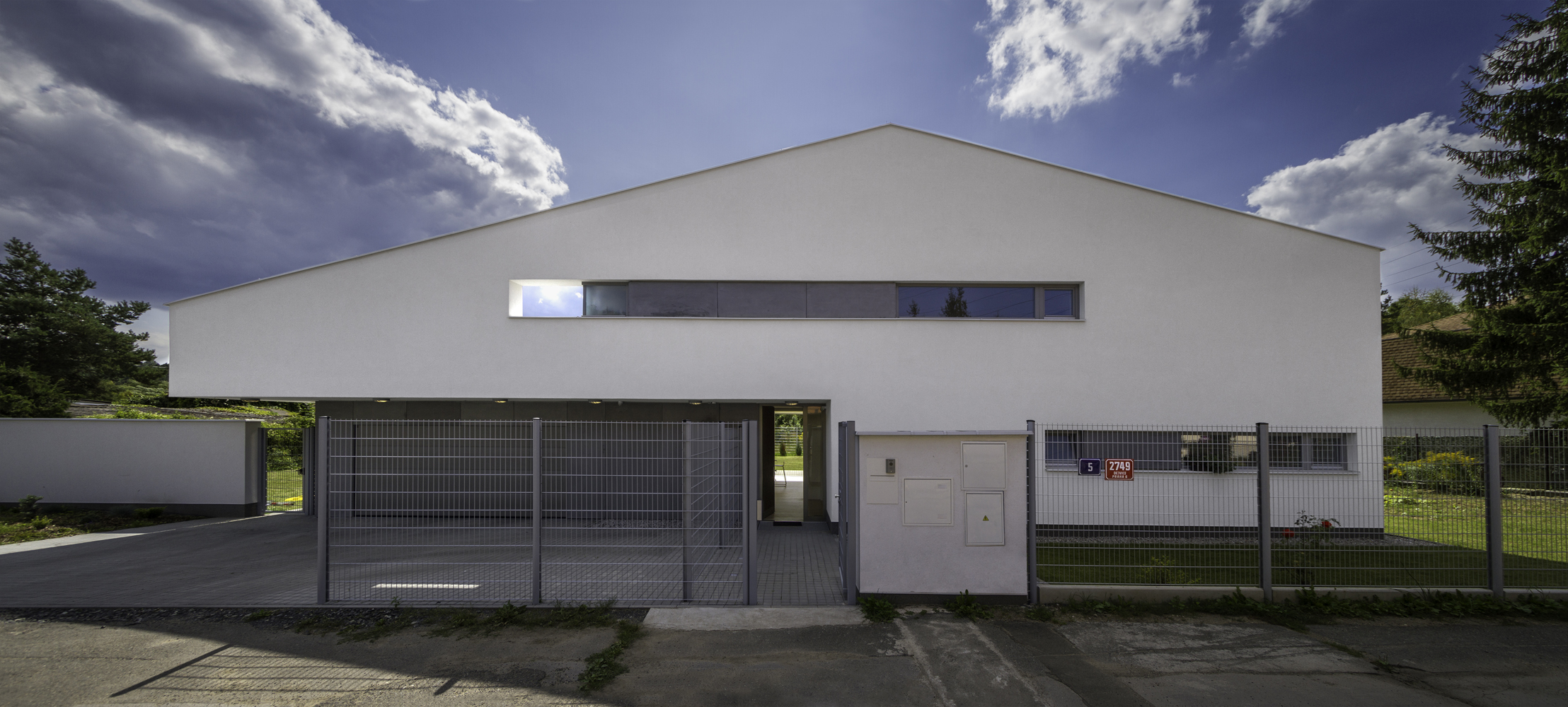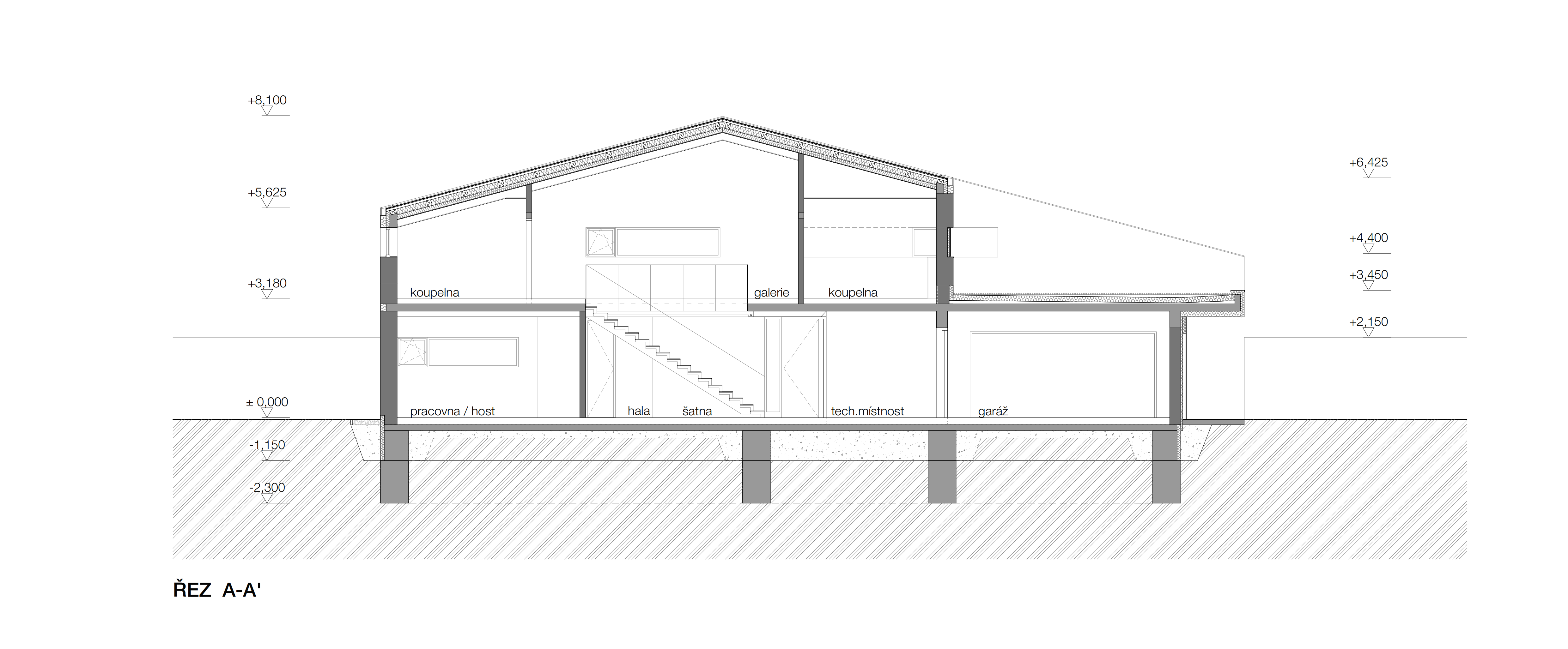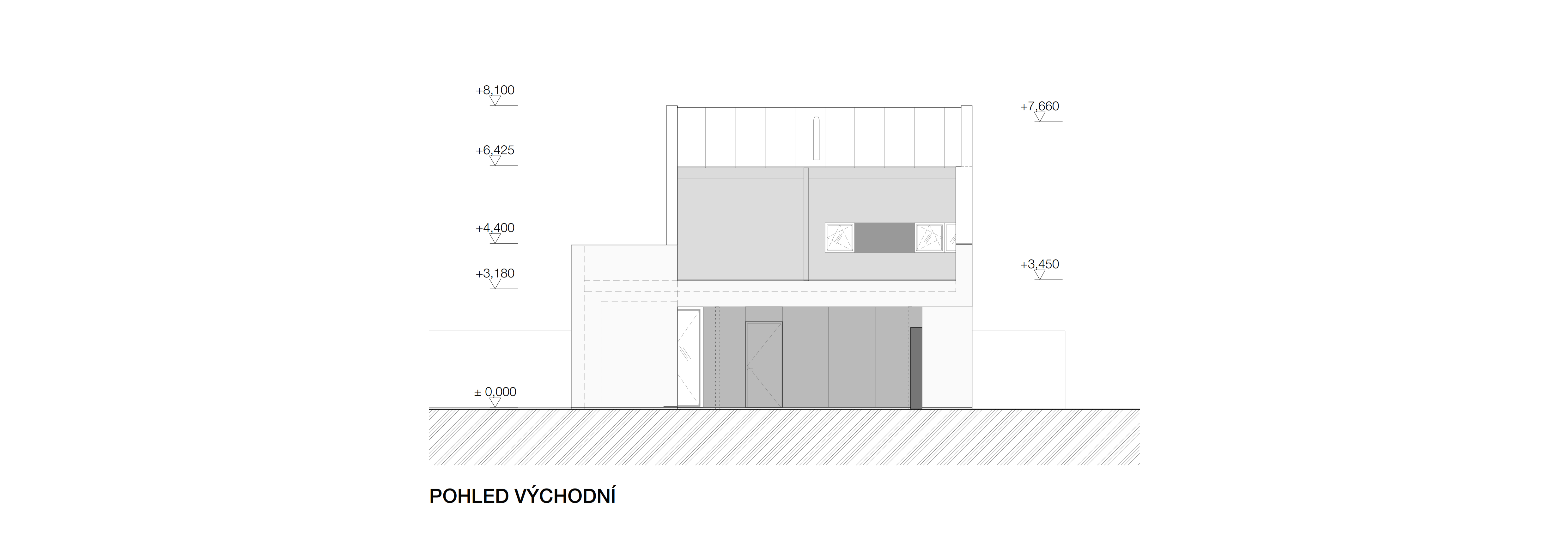 Zapálený pro svou vizi, ale nejistý v tom, jak jí dosáhnout, zapojil klient do návrhu svého moderního, minimalistického a otevřeného rodinného domu architekty z ateliéru 4a. Záměr, se kterým byl dům projektován, od nás vyžadoval použití minimálního množství detailů. Vyjádřili jsme se pouze s pomocí několika málo přírodních materiálů, v monochromatickém barevném ladění. Úspěšně jsme zvýšili koeficient zastavění, museli jsme ale čelit mnoha omezením z hlediska zásad celkového urbanistického a architektonického řešení v dané lokalitě Jenerálka. Podařilo se nám interpretovat klasickou a v místní zástavbě převládající sedlovou střechu novým způsobem, který odpovídal požadavkům klienta na současný moderní dům. V našem pojetí se tradiční tvar přetavil v pozvolně stoupající a klesající zeď, která se jako stuha vine kolem celého domu. Linie pozvolně stoupající asymetrické střechy je tvořena právě touto zdí rozpínající se přes parcelu. Části zdi jsou vynechány za účelem zdůraznění a krytí vstupu, jinde slouží průřezy pro otevření fasády domu jejímu okolí. Chtěli jsme dům vizuálně pevně spojit se zemí tak, aby působil trvalým dojmem, hmota domu vyhlížela solidně a pevně, a zároveň poskytnout klidný, lenivý pocit domu sebevědomě usazeného na pozemku. Vše je navrženo v bílé barvě s tmavými přírodně šedivými detaily v průřezech fasádou a šedým soklem tvořícím základnu domu.
