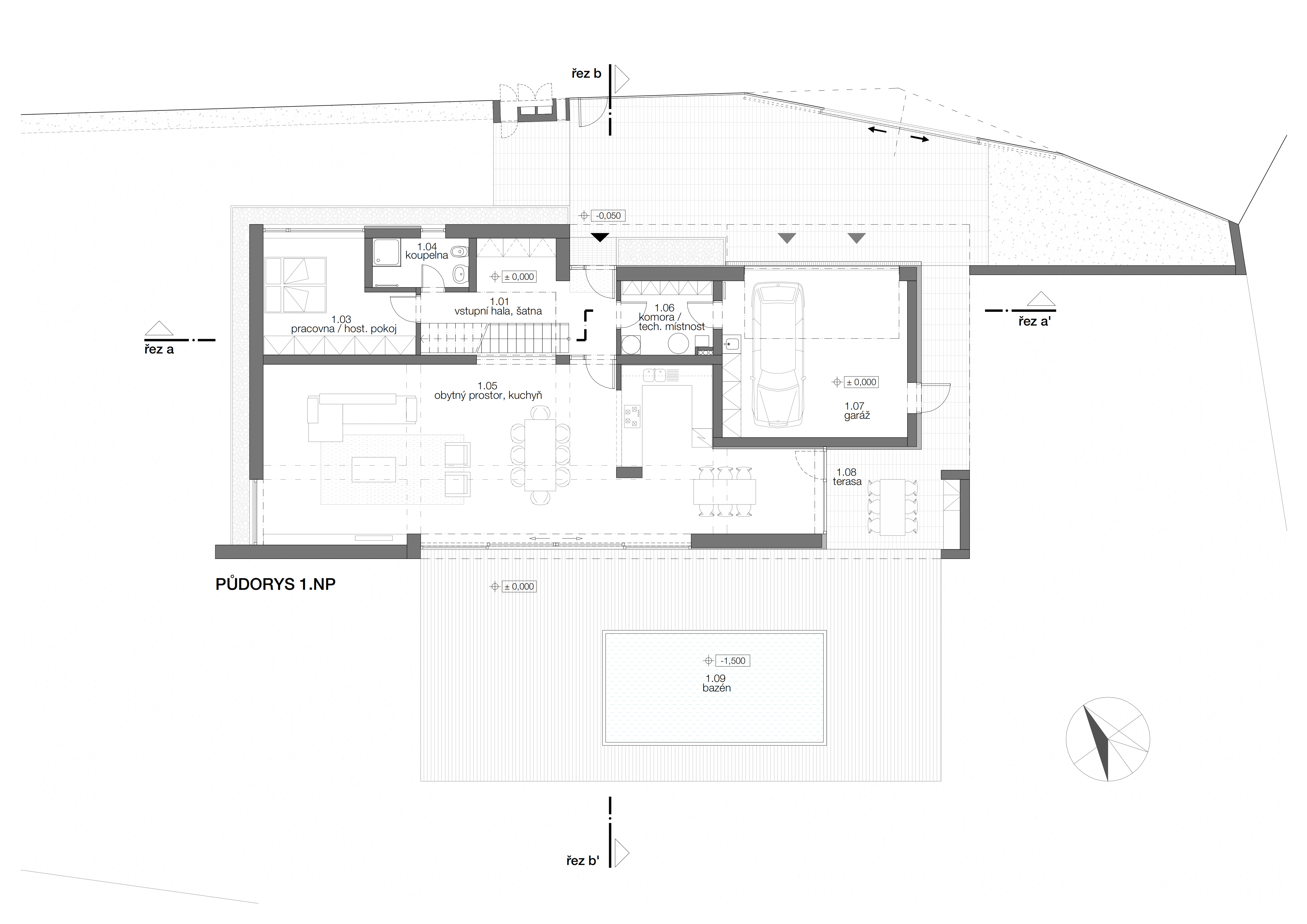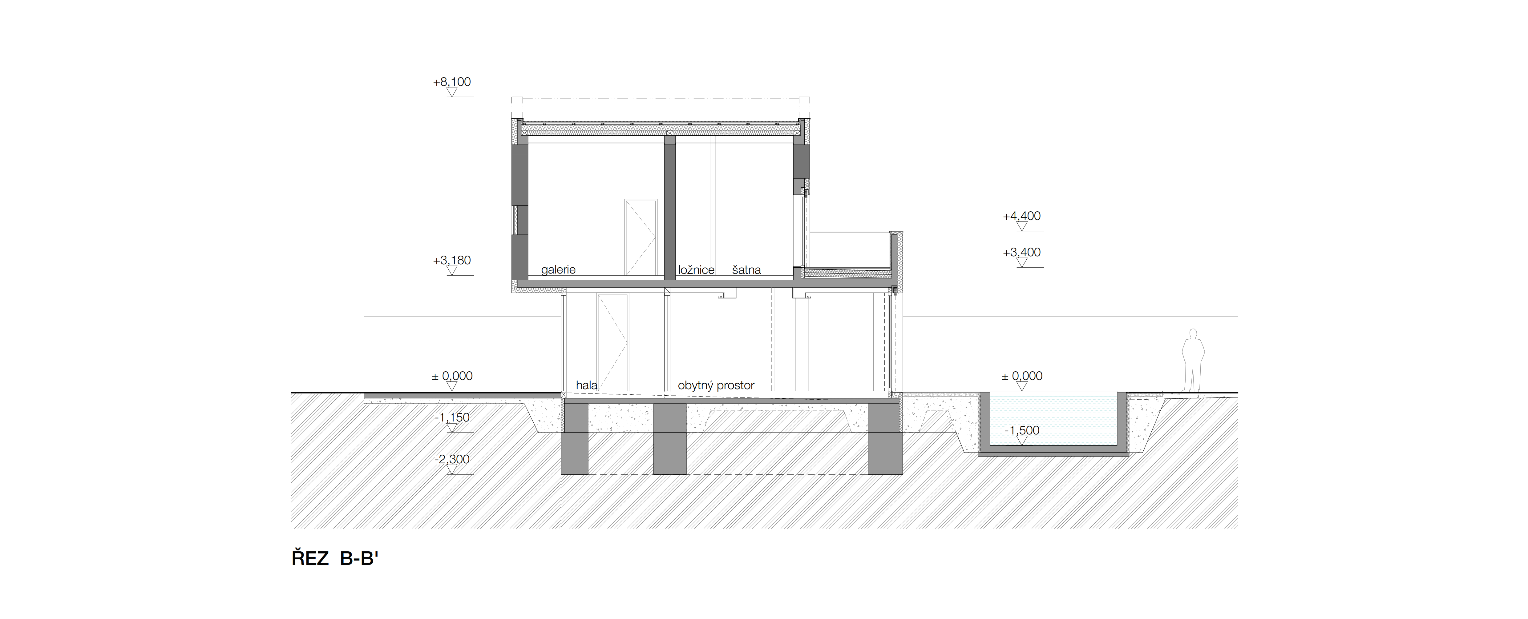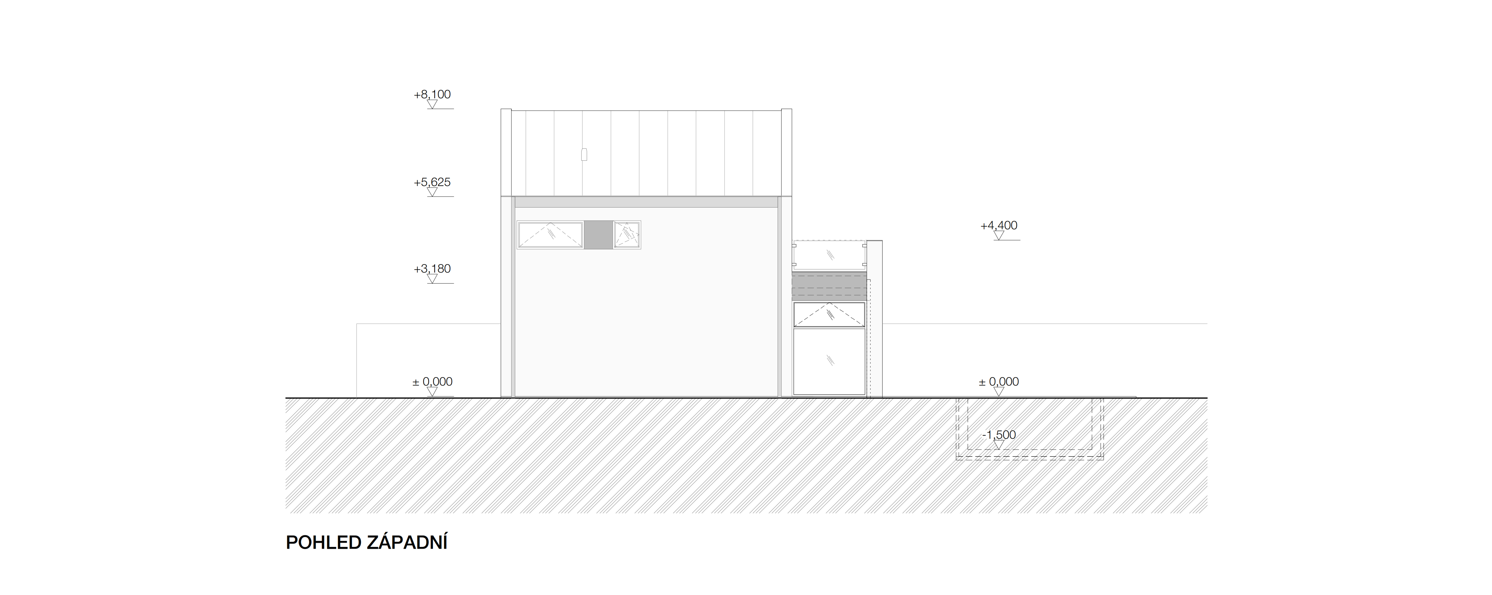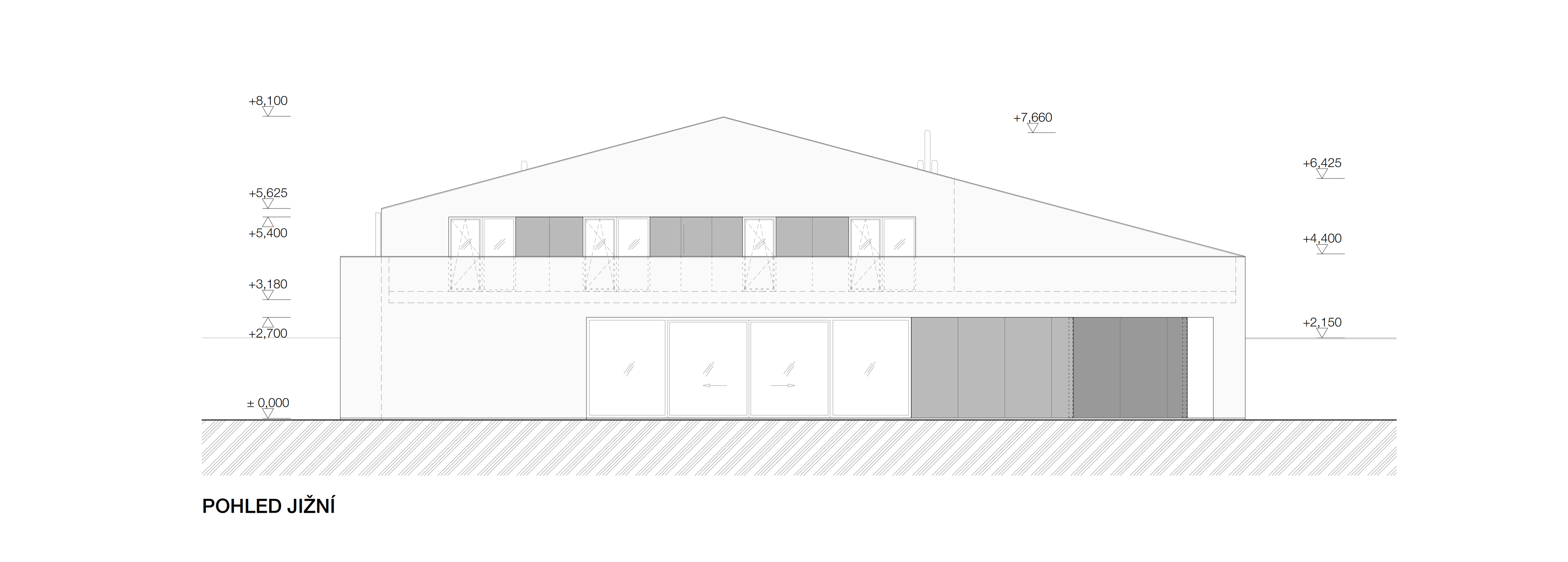 Zapálený pro svou vizi, ale nejistý v tom, jak jí dosáhnout, zapojil klient do návrhu svého moderního, minimalistického a otevřeného rodinného domu architekty z ateliéru 4a. Záměr, se kterým byl dům projektován, od nás vyžadoval použití minimálního množství detailů. Vyjádřili jsme se pouze s pomocí několika málo přírodních materiálů, v monochromatickém barevném ladění. Úspěšně jsme zvýšili koeficient zastavění, museli jsme ale čelit mnoha omezením z hlediska zásad celkového urbanistického a architektonického řešení v dané lokalitě Jenerálka. Podařilo se nám interpretovat klasickou a v místní zástavbě převládající sedlovou střechu novým způsobem, který odpovídal požadavkům klienta na současný moderní dům. V našem pojetí se tradiční tvar přetavil v pozvolně stoupající a klesající zeď, která se jako stuha vine kolem celého domu. Linie pozvolně stoupající asymetrické střechy je tvořena právě touto zdí rozpínající se přes parcelu. Části zdi jsou vynechány za účelem zdůraznění a krytí vstupu, jinde slouží průřezy pro otevření fasády domu jejímu okolí. Chtěli jsme dům vizuálně pevně spojit se zemí tak, aby působil trvalým dojmem, hmota domu vyhlížela solidně a pevně, a zároveň poskytnout klidný, lenivý pocit domu sebevědomě usazeného na pozemku. Vše je navrženo v bílé barvě s tmavými přírodně šedivými detaily v průřezech fasádou a šedým soklem tvořícím základnu domu.