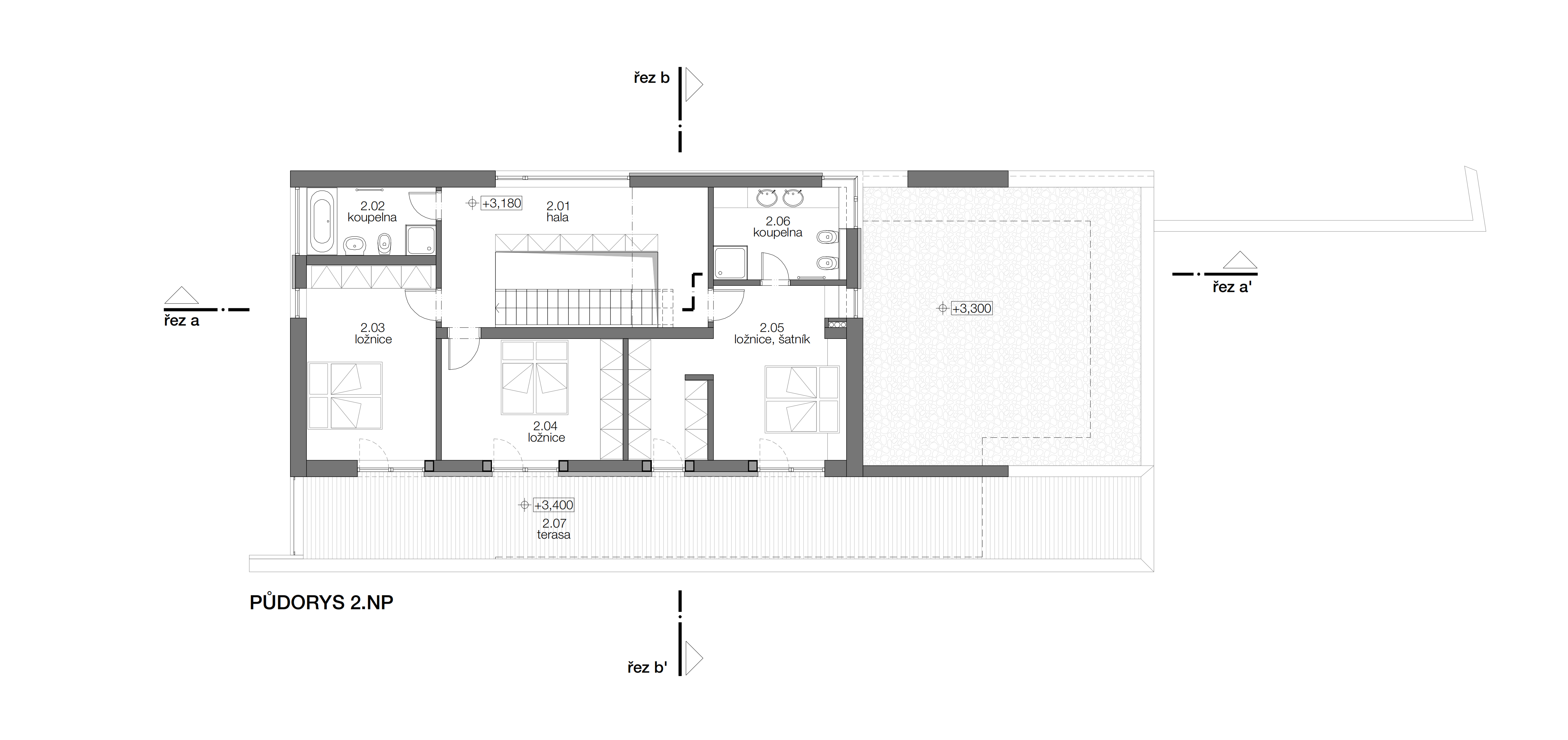 Podesta v prvním patře je koncipována jako průchozí galerie, strop zde sleduje tvar střechy a má tím pádem dvojnásobnou výšku, umožňující v budoucnu vestavbu mezipatra. Tři ložnice s francouzskými okny jsou všechny otevřeny směrem k jižní pobytové terase. Hlavní ložnice s šatnou má soukromou koupelnu vybavenou sprchovým koutem, druhá koupelna s vanou je určená k užívání všem.