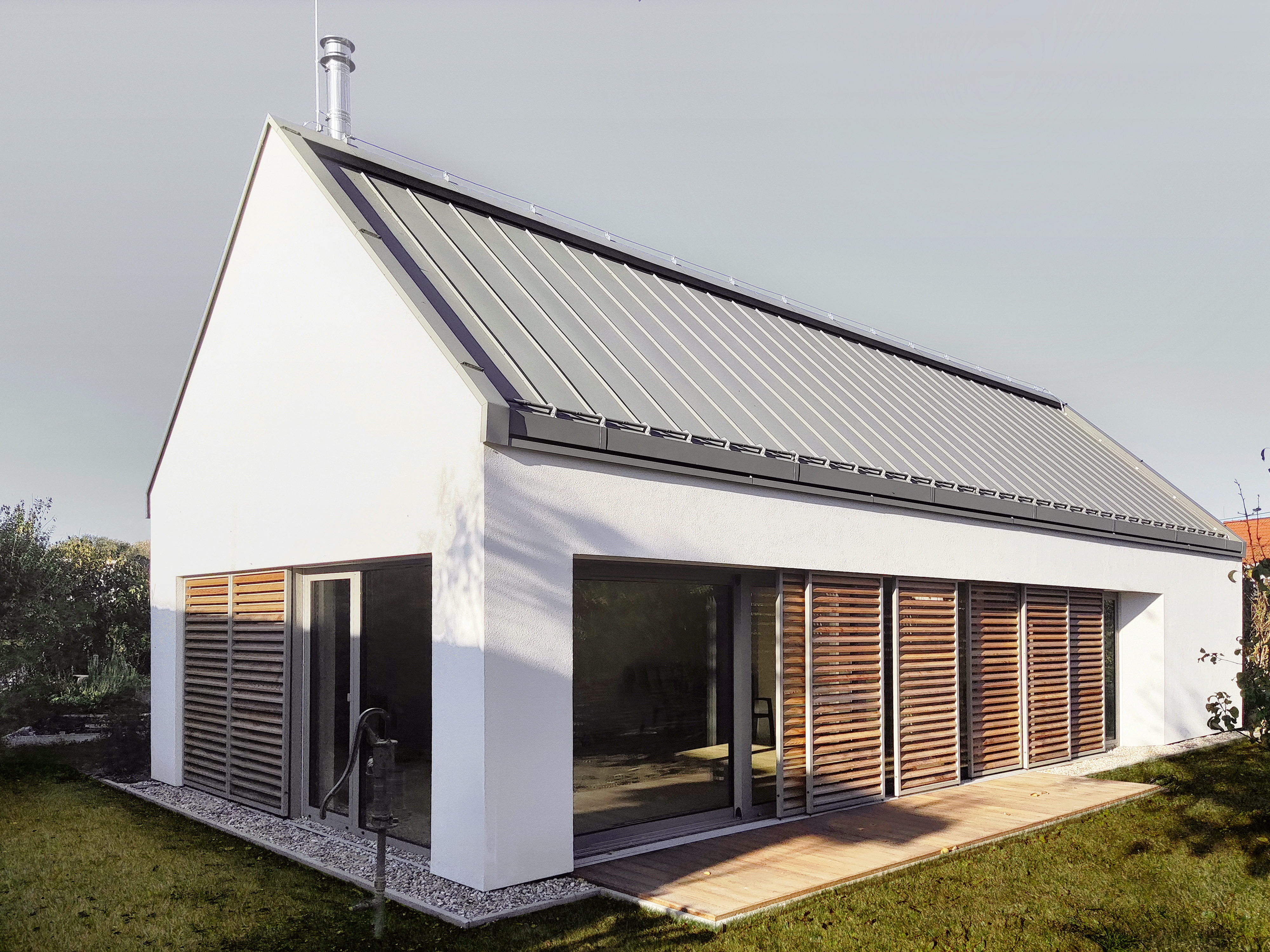 Strešnú krytinu tvorí hliníkový strešný systém PREFALZ. Odvodnenie strechy je riešené nadrímsovým žľabom a zvodmi ukrytými vo fasáde, čo dodáva menšej stavbe eleganciu.