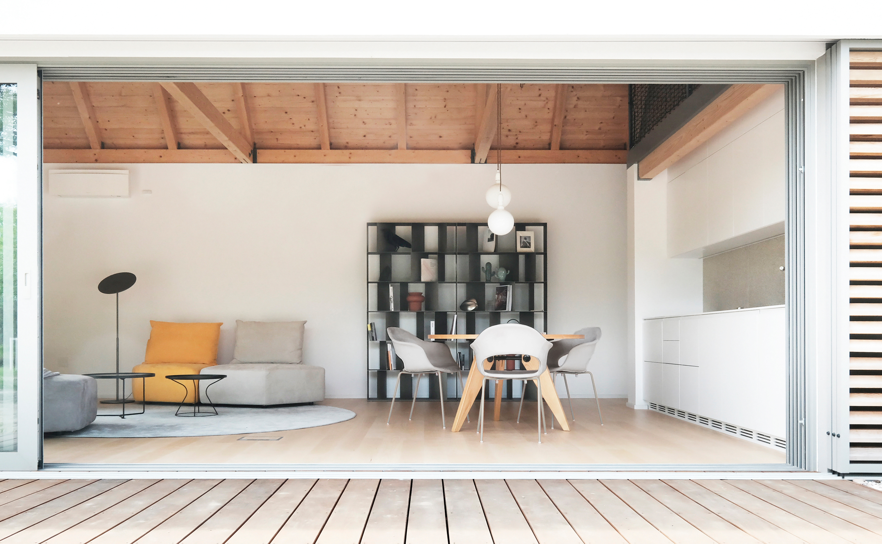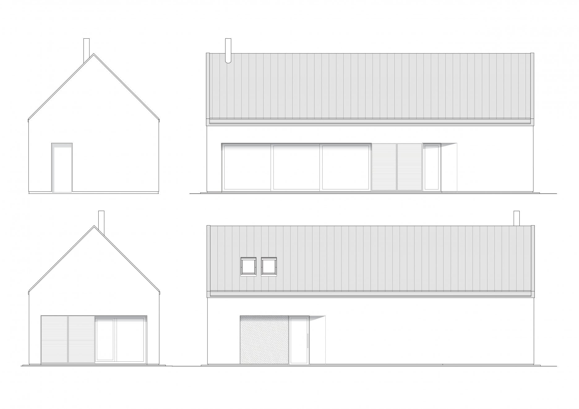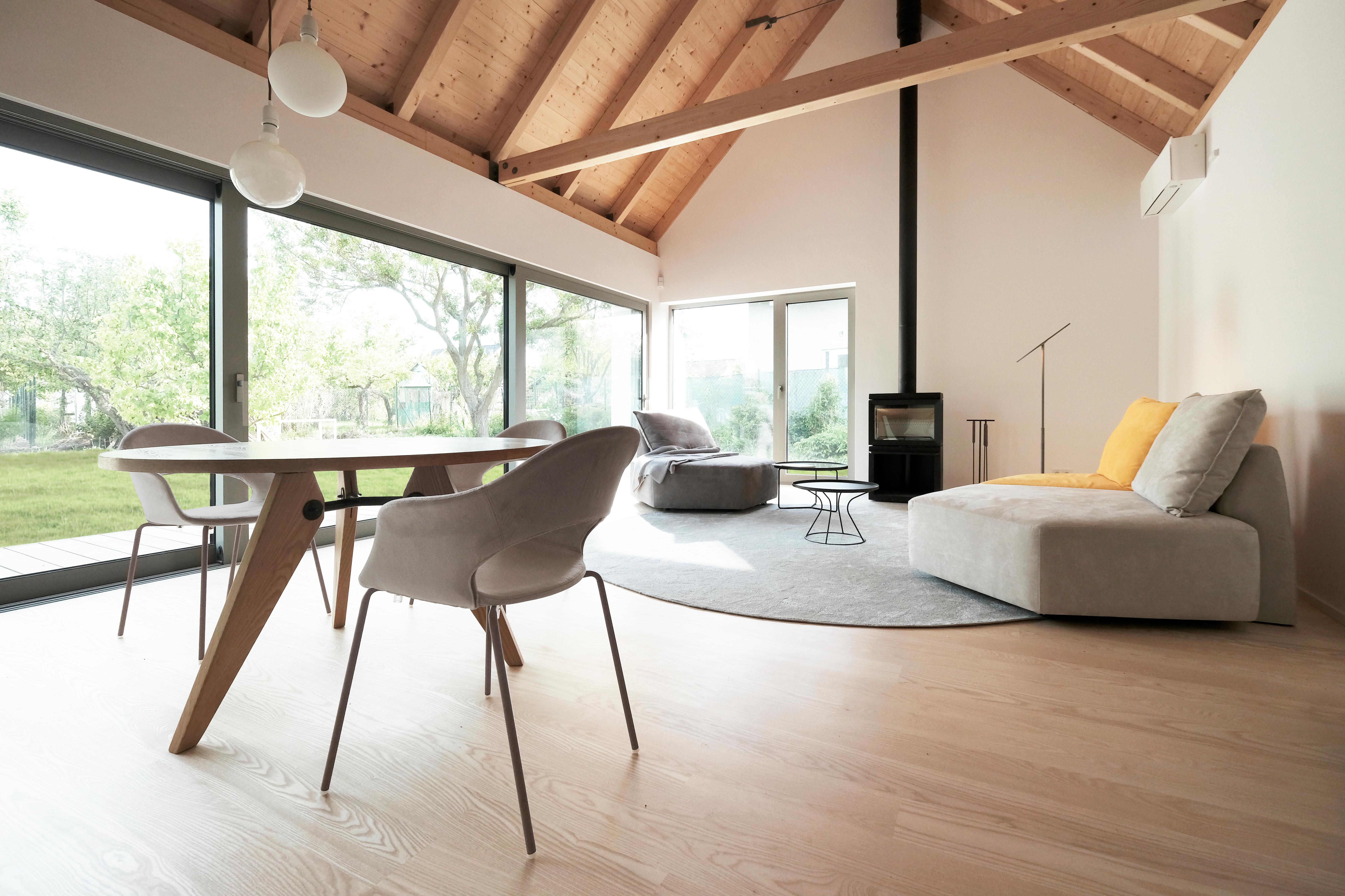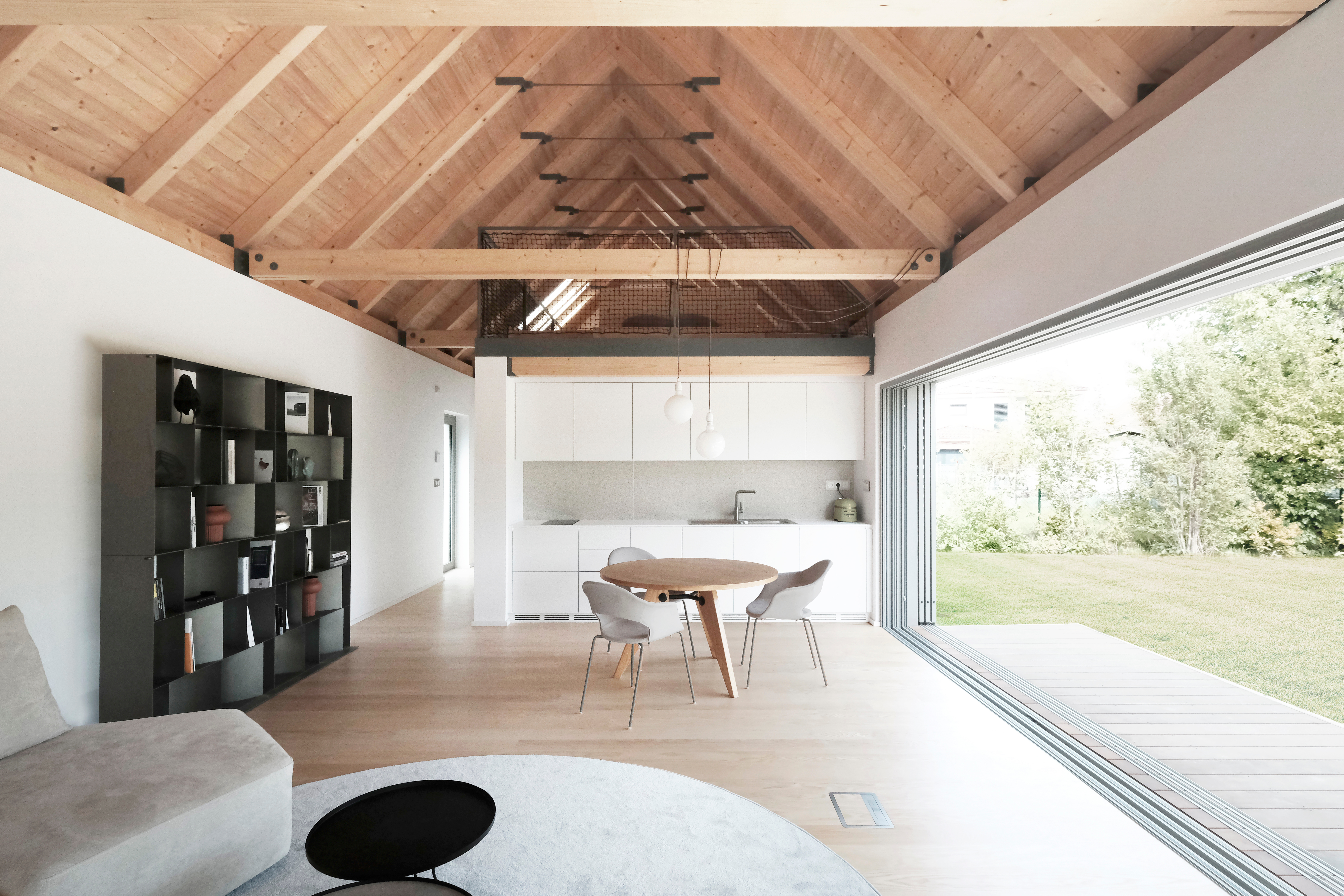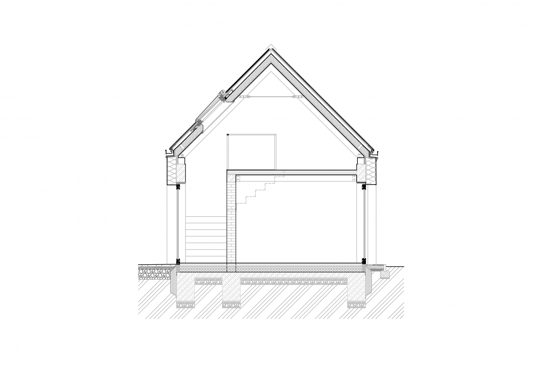 Realizácia z dielne ateliéru KCA studio pracuje s typickou figúrou domu so sedlovou strechou. Vynechanie stropu medzi obytnou zónou a krovom vytvorilo voľný rámec pre hru s usporiadaním priestorových celkov. Dôležitou súčasťou je prepojenie interiéru so záhradou prostredníctvom rozsiahlej plochy posuvného presklenia. Výrazným motívom stvárnenia priestoru je konštrukcia odhaleného krovu a jeho technické detaily.