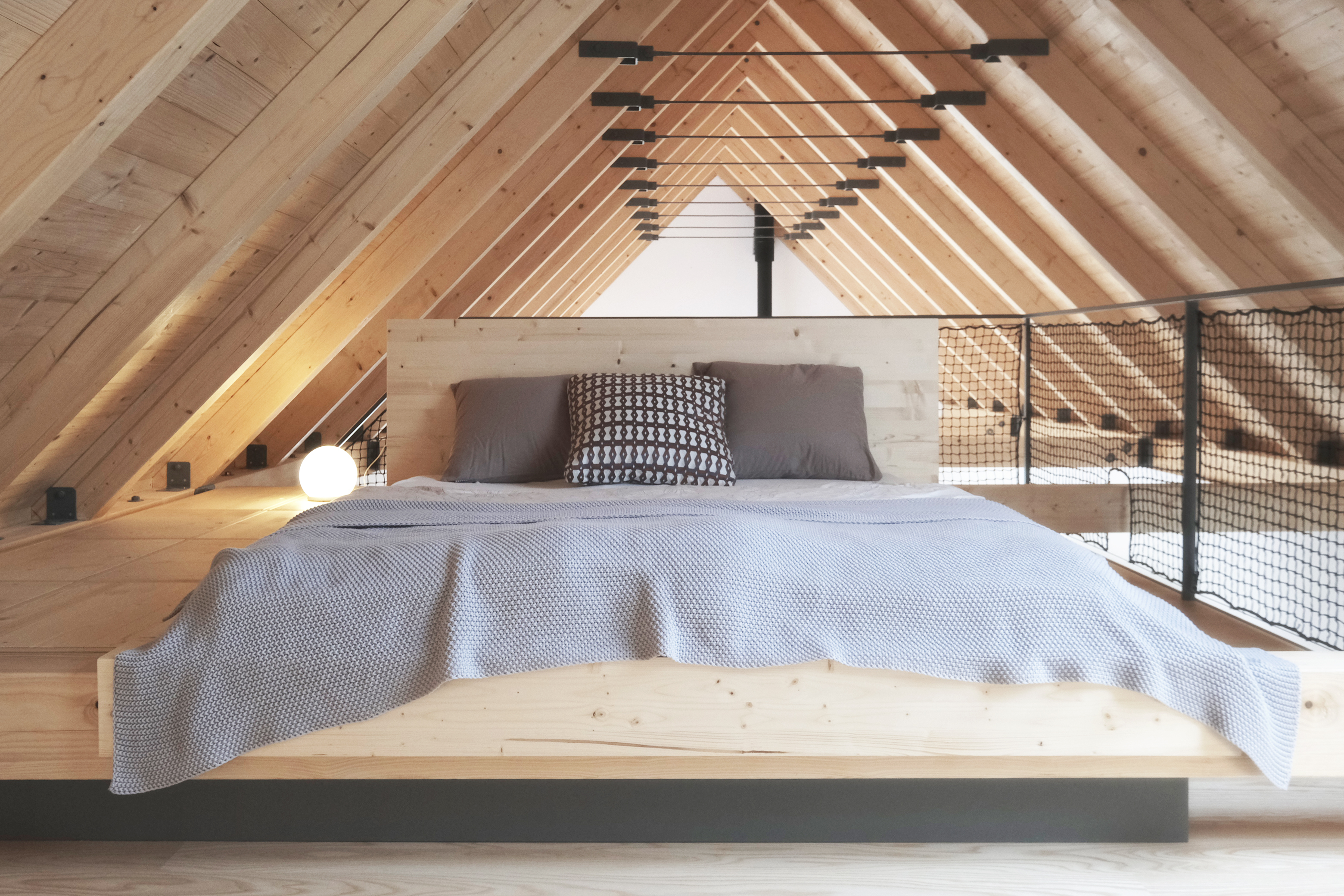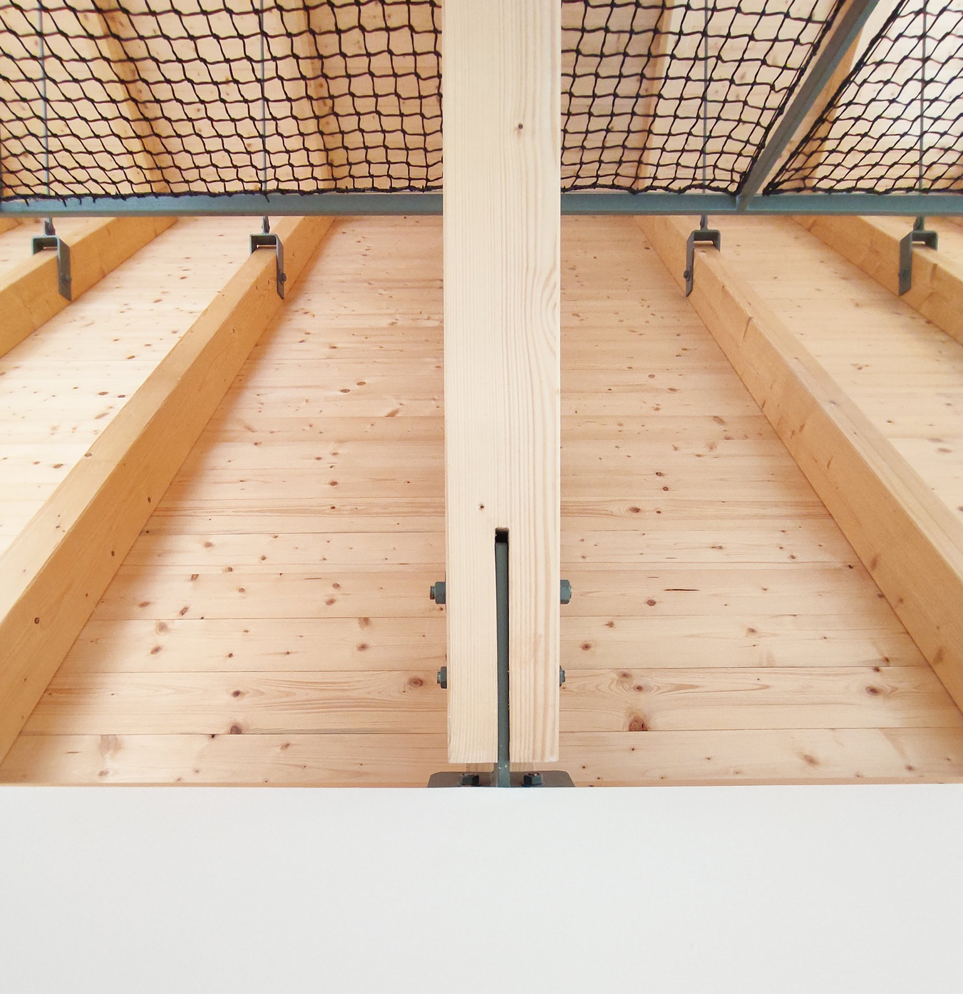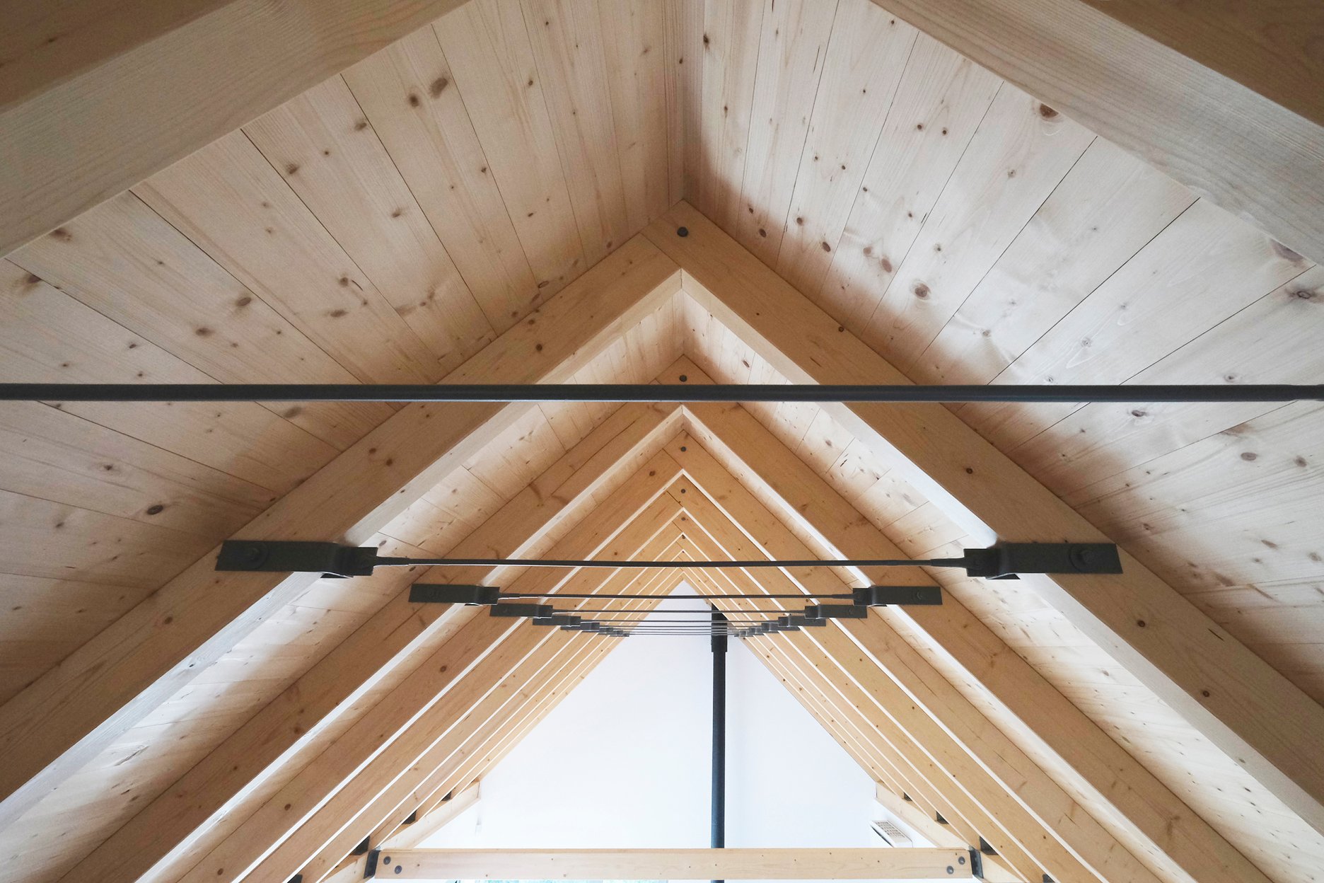 Konštrukcia krovu je priznaná vďaka použitiu nadkrokvovej izolácie a výrazne ovplyvňuje charakter interiéru. Základ tvoria krokvy v pravidelnom rytme, spriahnuté ťahadlami, a štyri väzné trámy. Trámy staticky plnia funkciu ťahadla, no v priestore povaly preberajú aj funkciu konštrukcie postele. Pole medzi dvoma trámami prechádzajúcimi povalou je zaklopené doskami, ktoré tvoria pódium pre matrace. Priestor pod doskami a vedľa matracov je využitý ako odkladací. Nad obývačkou a jedálňou sú na trámoch zavesené svietidlá.