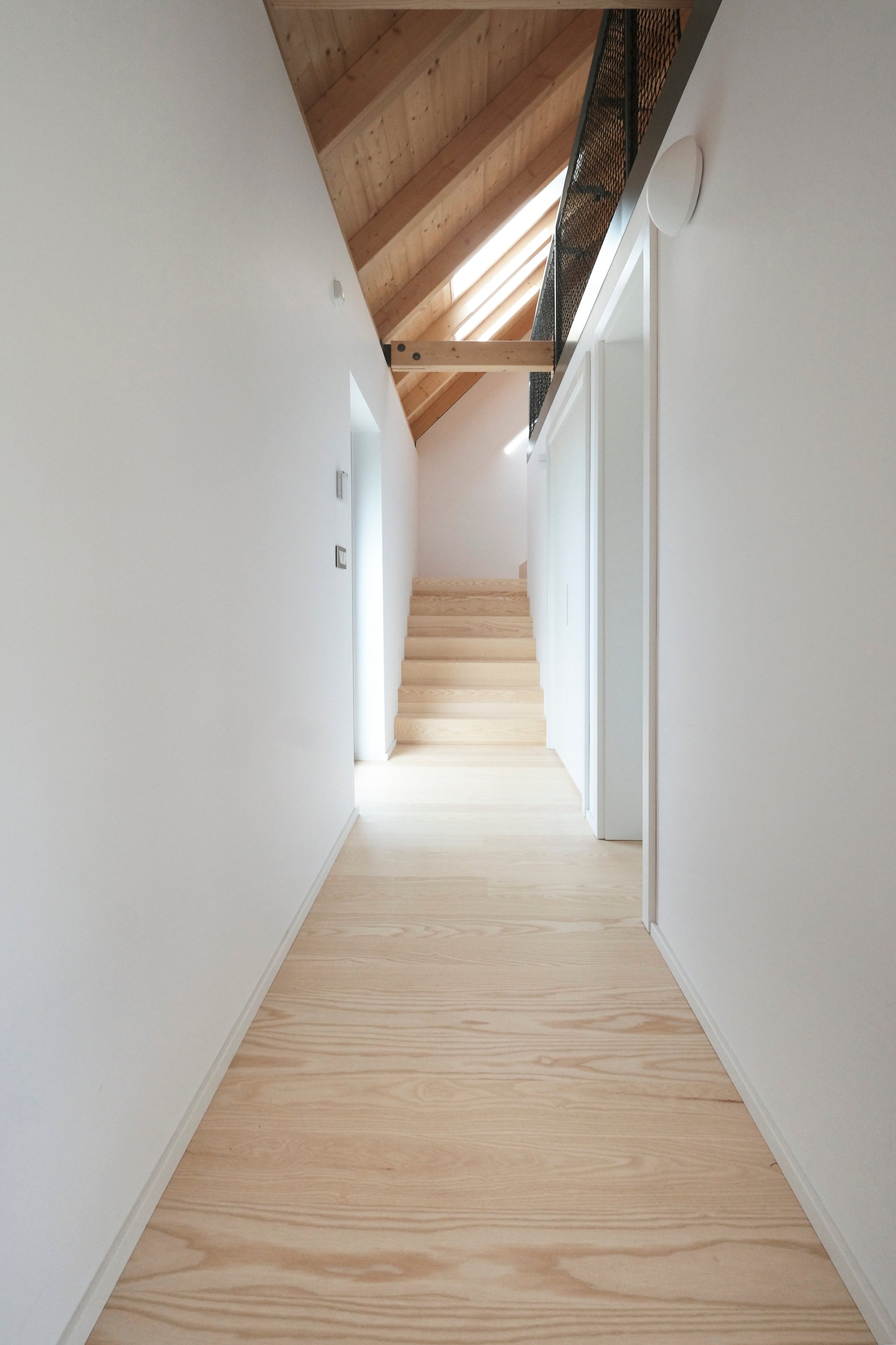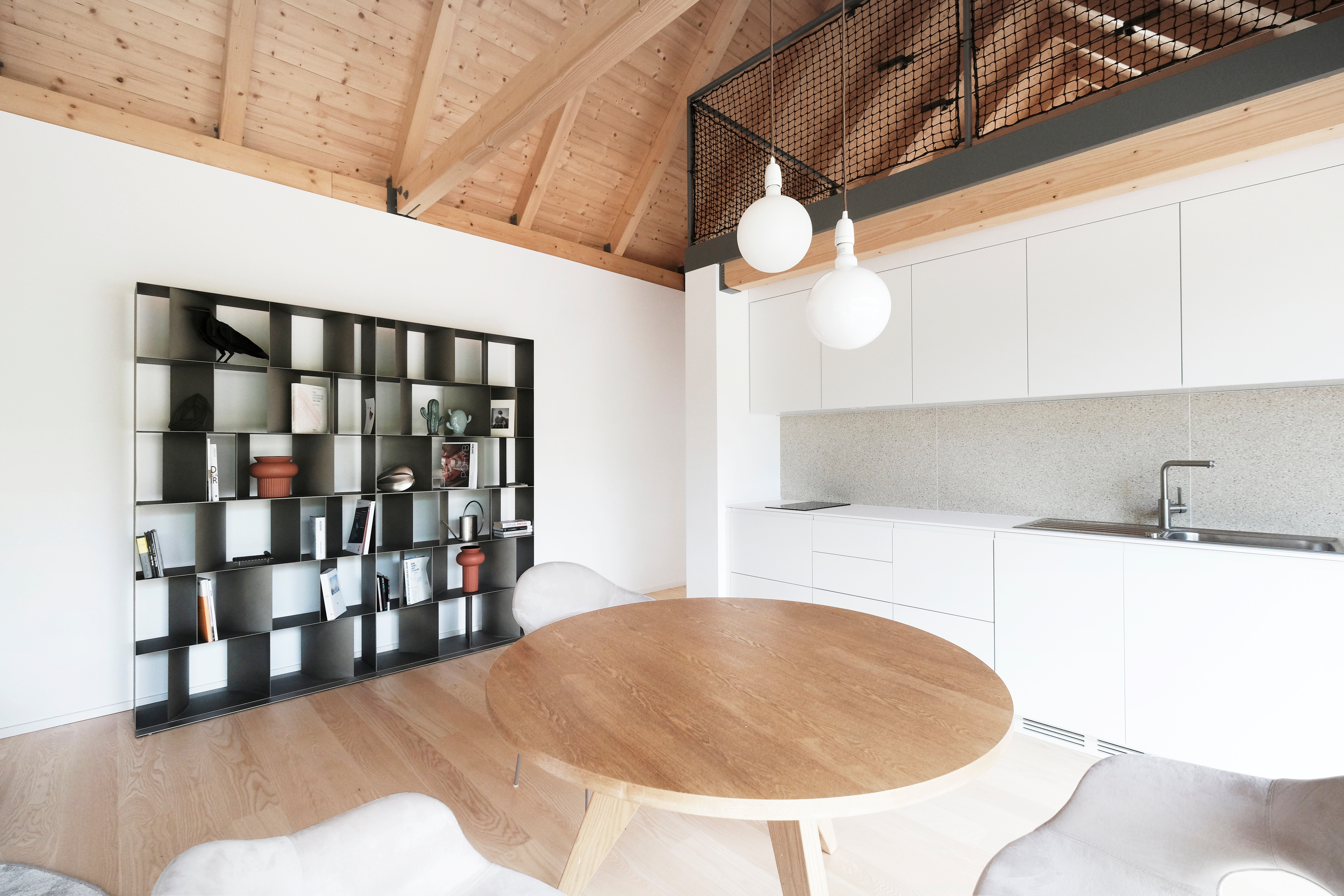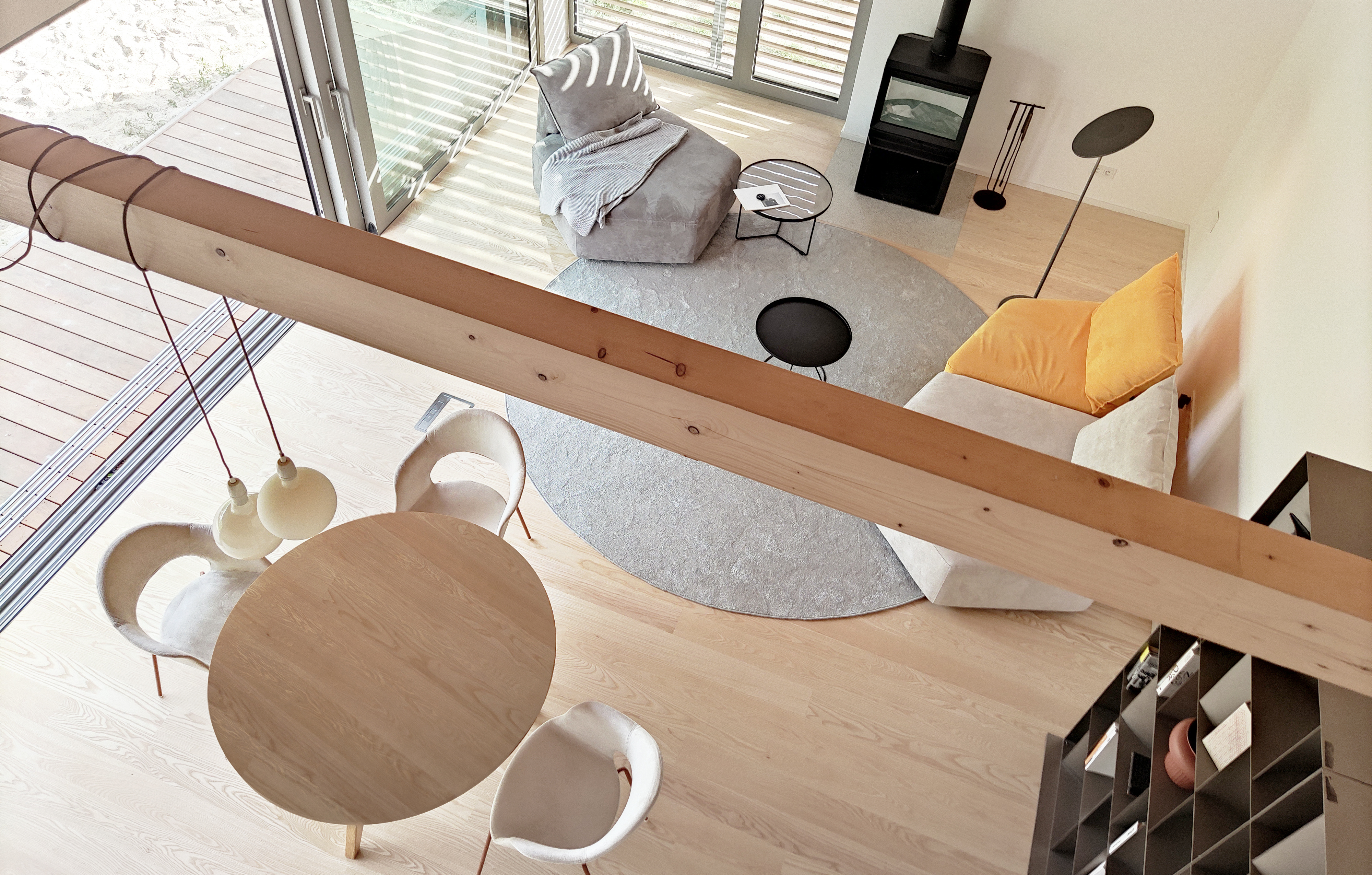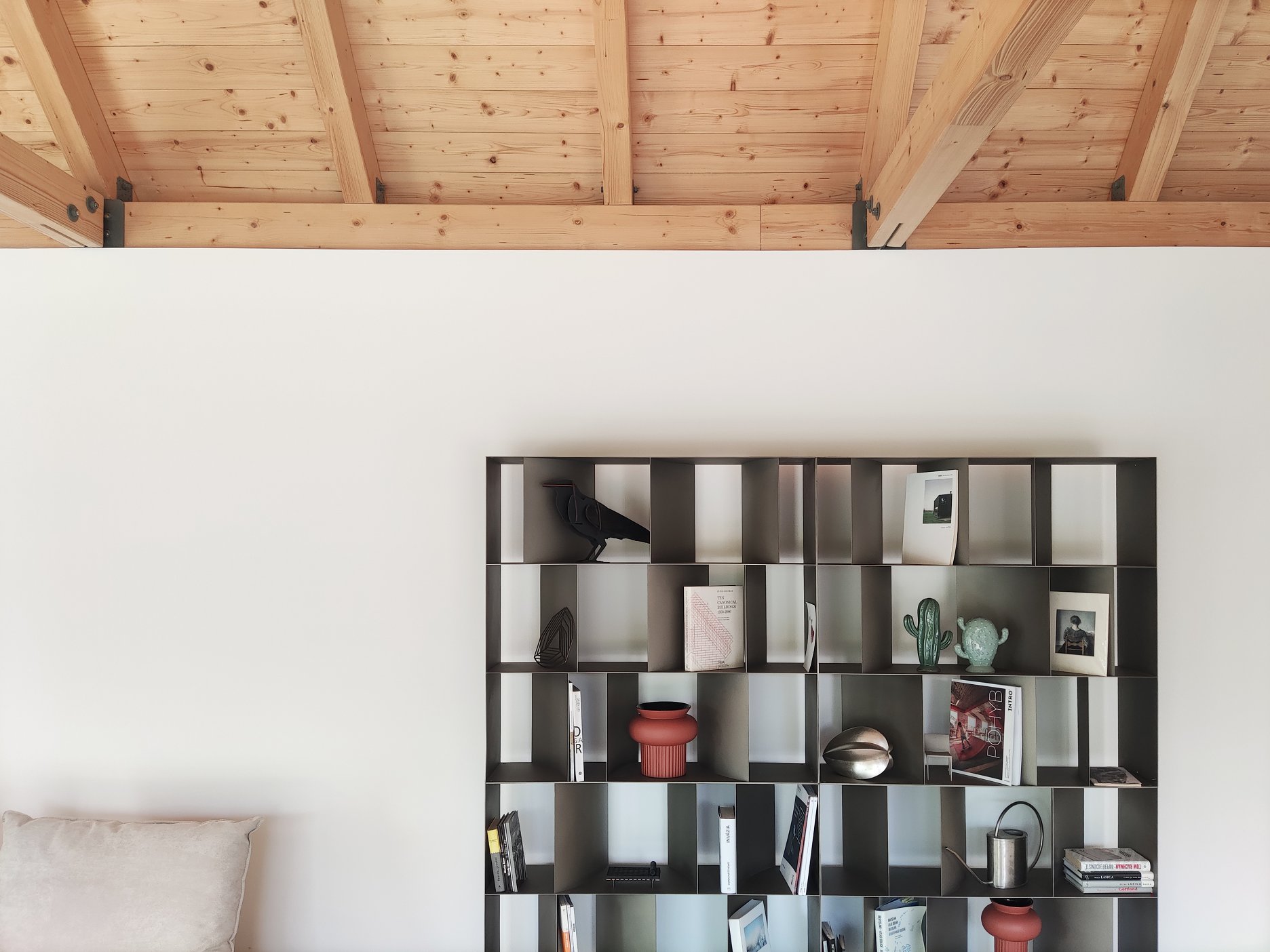 Konštrukcia krovu je priznaná vďaka použitiu nadkrokvovej izolácie a výrazne ovplyvňuje charakter interiéru. Základ tvoria krokvy v pravidelnom rytme, spriahnuté ťahadlami, a štyri väzné trámy. Trámy staticky plnia funkciu ťahadla, no v priestore povaly preberajú aj funkciu konštrukcie postele. Pole medzi dvoma trámami prechádzajúcimi povalou je zaklopené doskami, ktoré tvoria pódium pre matrace. Priestor pod doskami a vedľa matracov je využitý ako odkladací. Nad obývačkou a jedálňou sú na trámoch zavesené svietidlá.