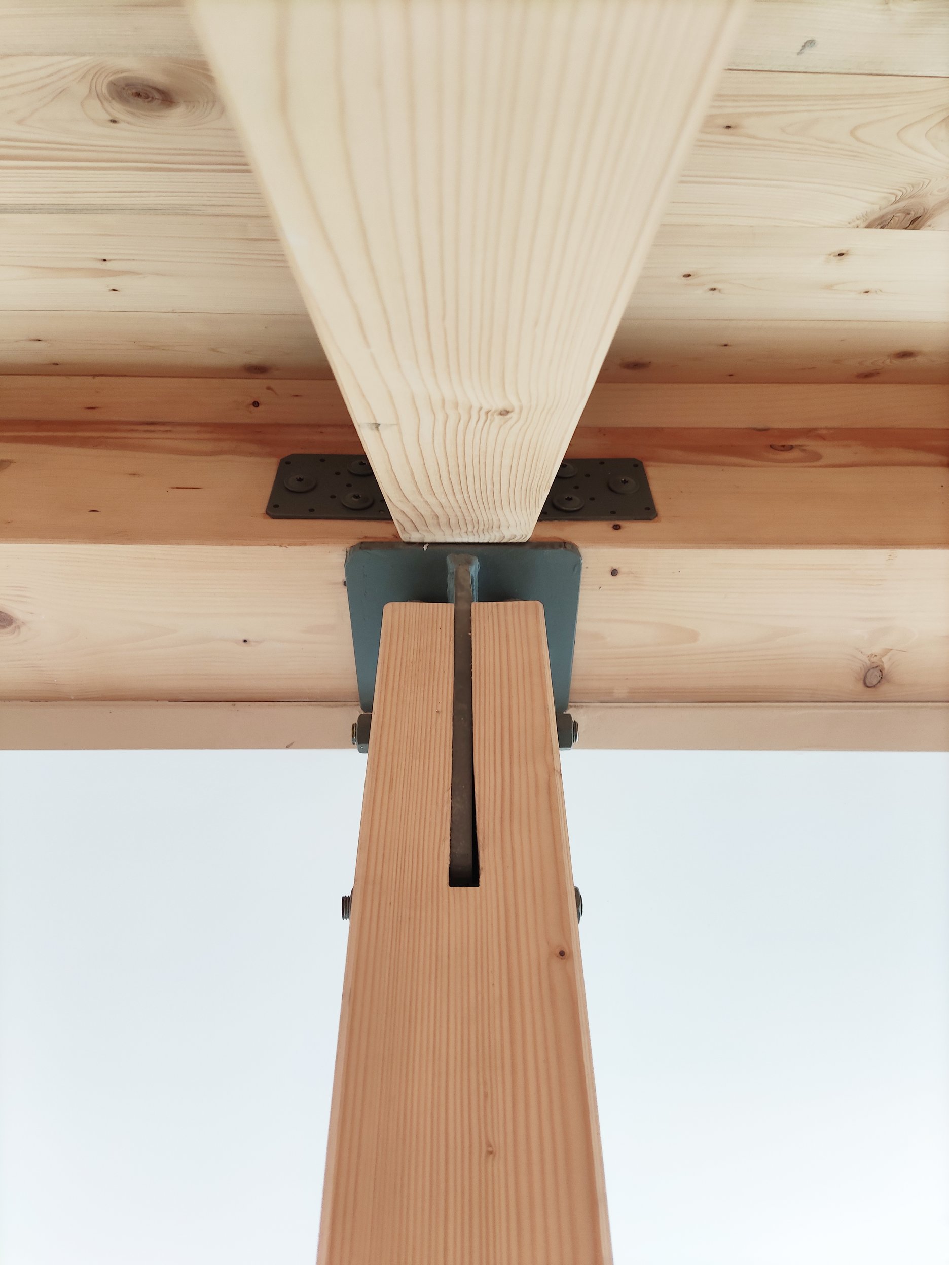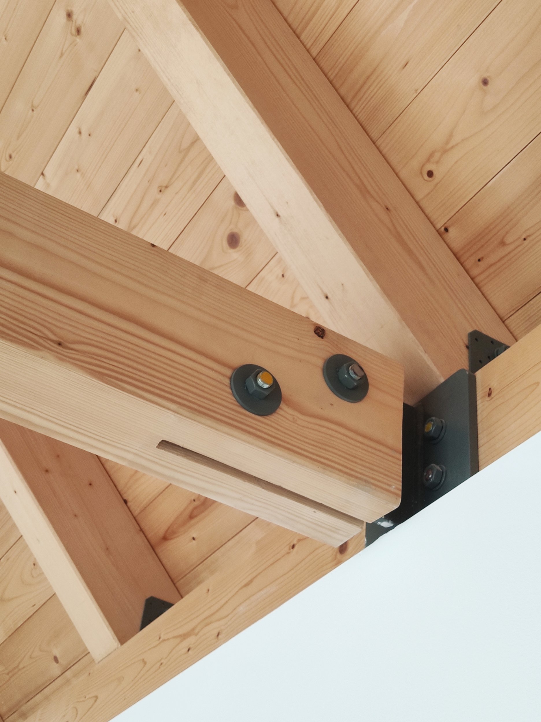 Spoje drevených prvkov navzájom, ale aj spoje dreva s betónom, sú tvorené typovými tesárskymi kovaniami, ktoré pri štandardnom použití nebývajú priznané. V projekte chaty v Rusovciach sú povrchovo upravené sivou farbou a tvoria súčasť interiéru. Drevené klieštiny sú nahradené typovými ťahadlami používanými predovšetkým v oceľových konštrukciách. Jediné atypické tesárske kovanie v projekte je použité pri napojení trámov na pomúrnicu.