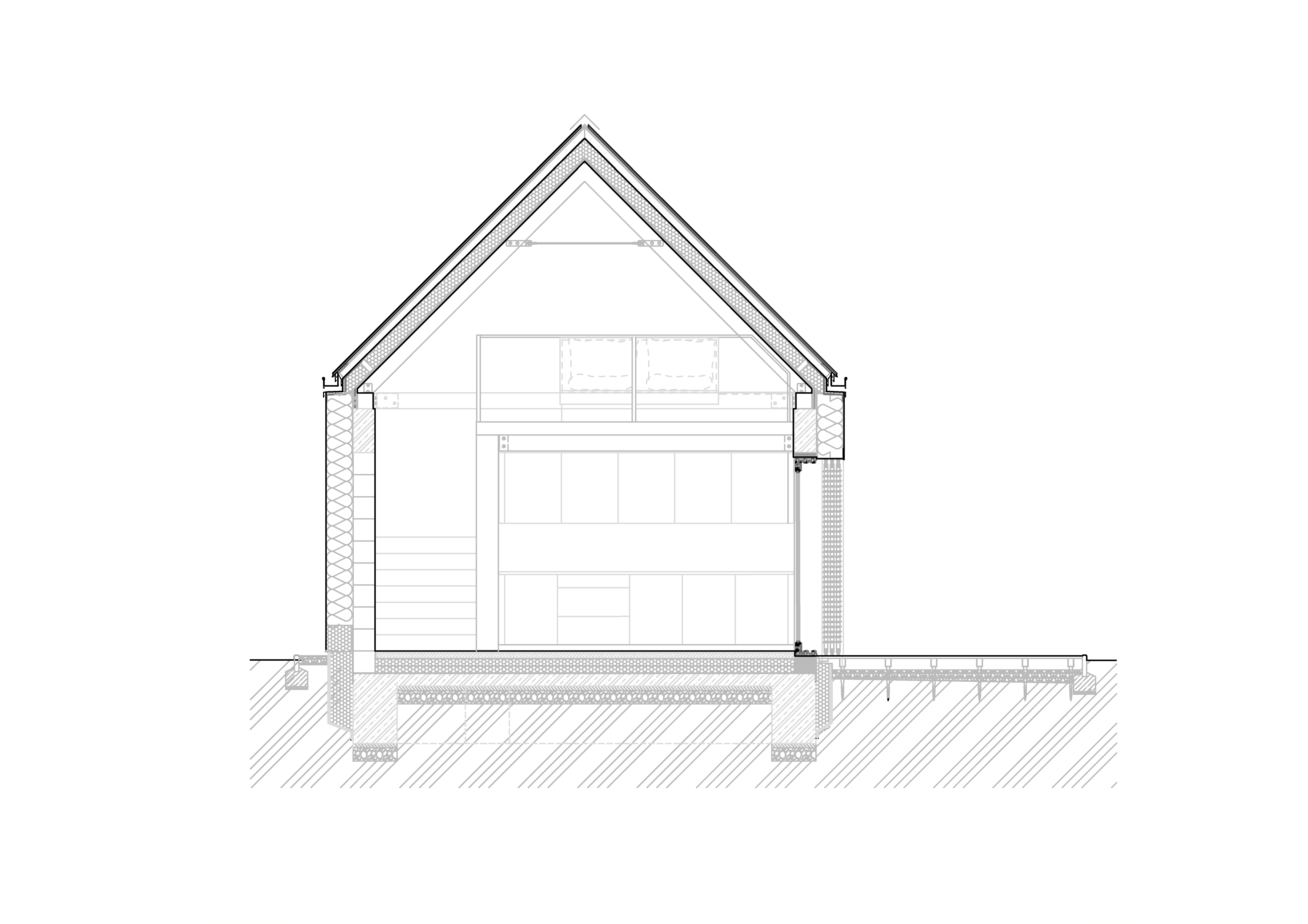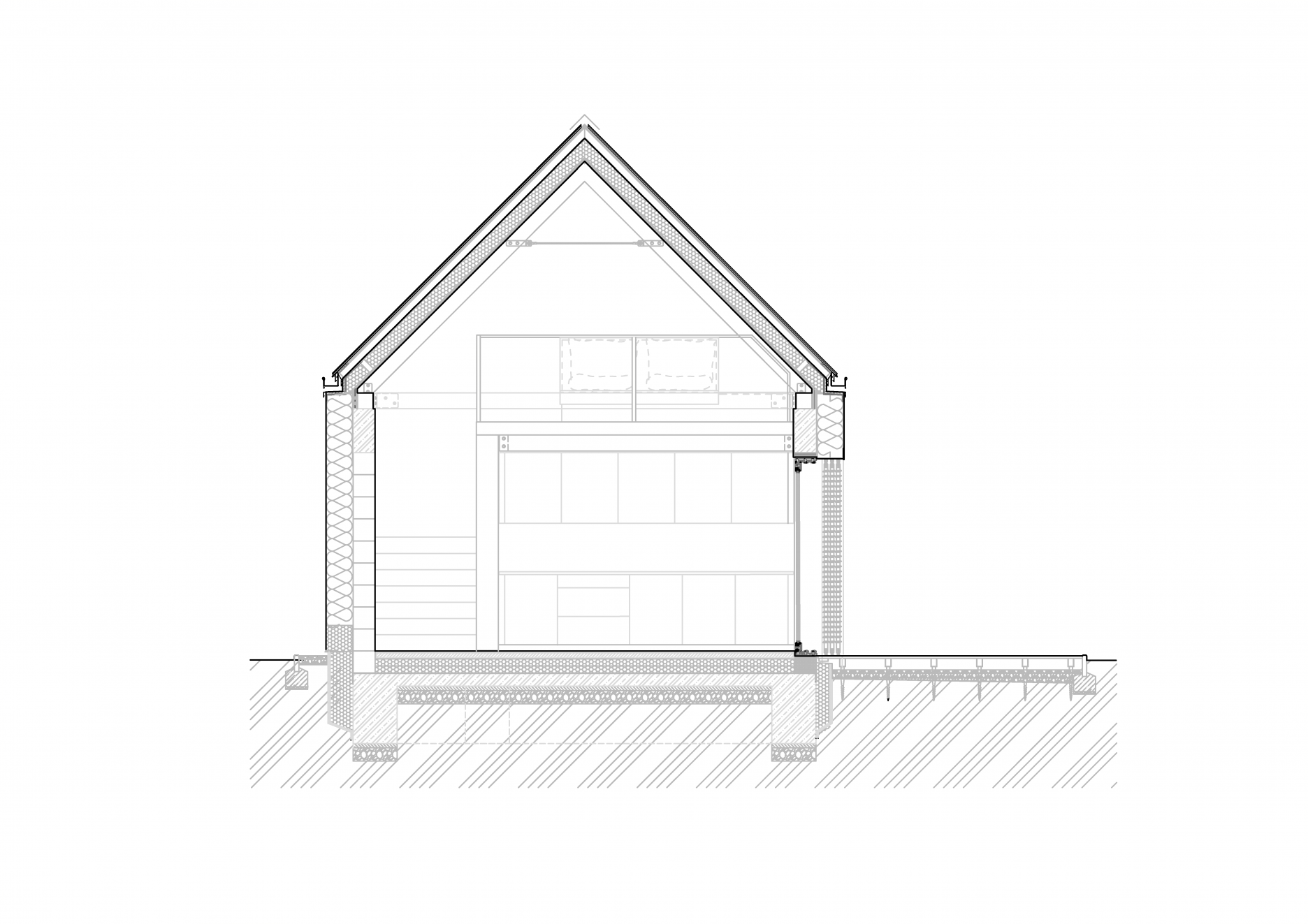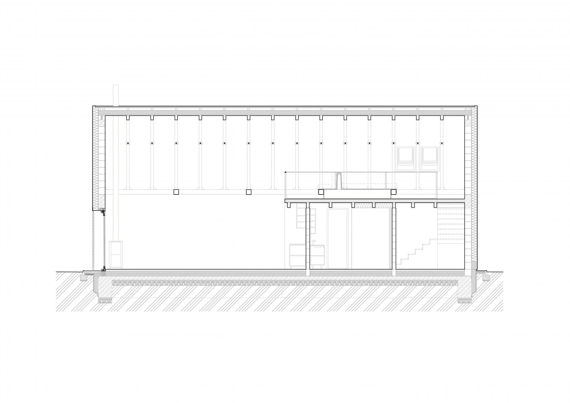 Na vrstve tvorenej murovanými stenami je uložený ŽB veniec, ktorý plní zároveň funkciu prekladov nad otvormi. Jeho dimenzia je daná minimálnym možným prierezom nad najväčším otvorom s rozponom 6,5 m. Dimenzie a výšky stavebných prvkov, a najmä strešnej konštrukcie, boli jednou z dôležitých tém projektu, kde sme sa snažili o zachovanie pekných proporcií malého jednopodlažného archetypálneho tvaru z exteriéru pri optimálnom využití výšky vo vnútri objektu. Dôležitou rovinou návrhu je tiež zachovanie jednoduchosti a jasnosti statického riešenia, ktoré je odprezentované práve v interiéri, nakoľko zvonku je to pri požiadavkách na teplotechniku komplikované.