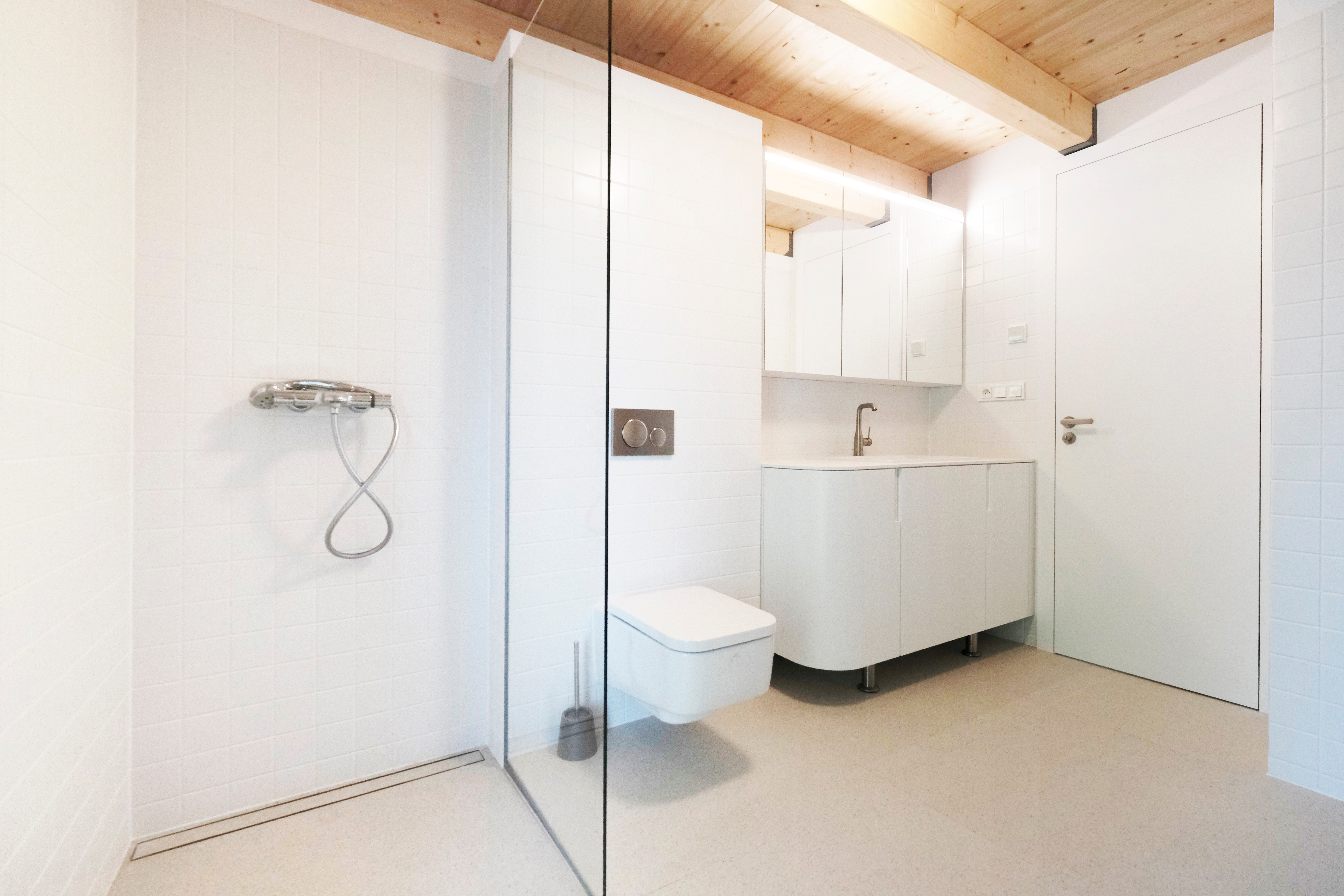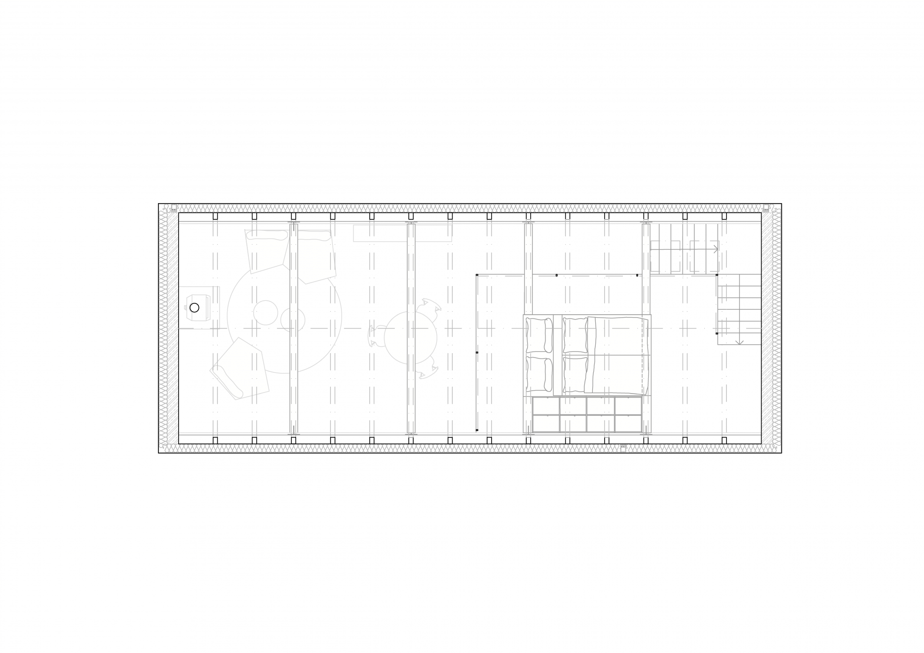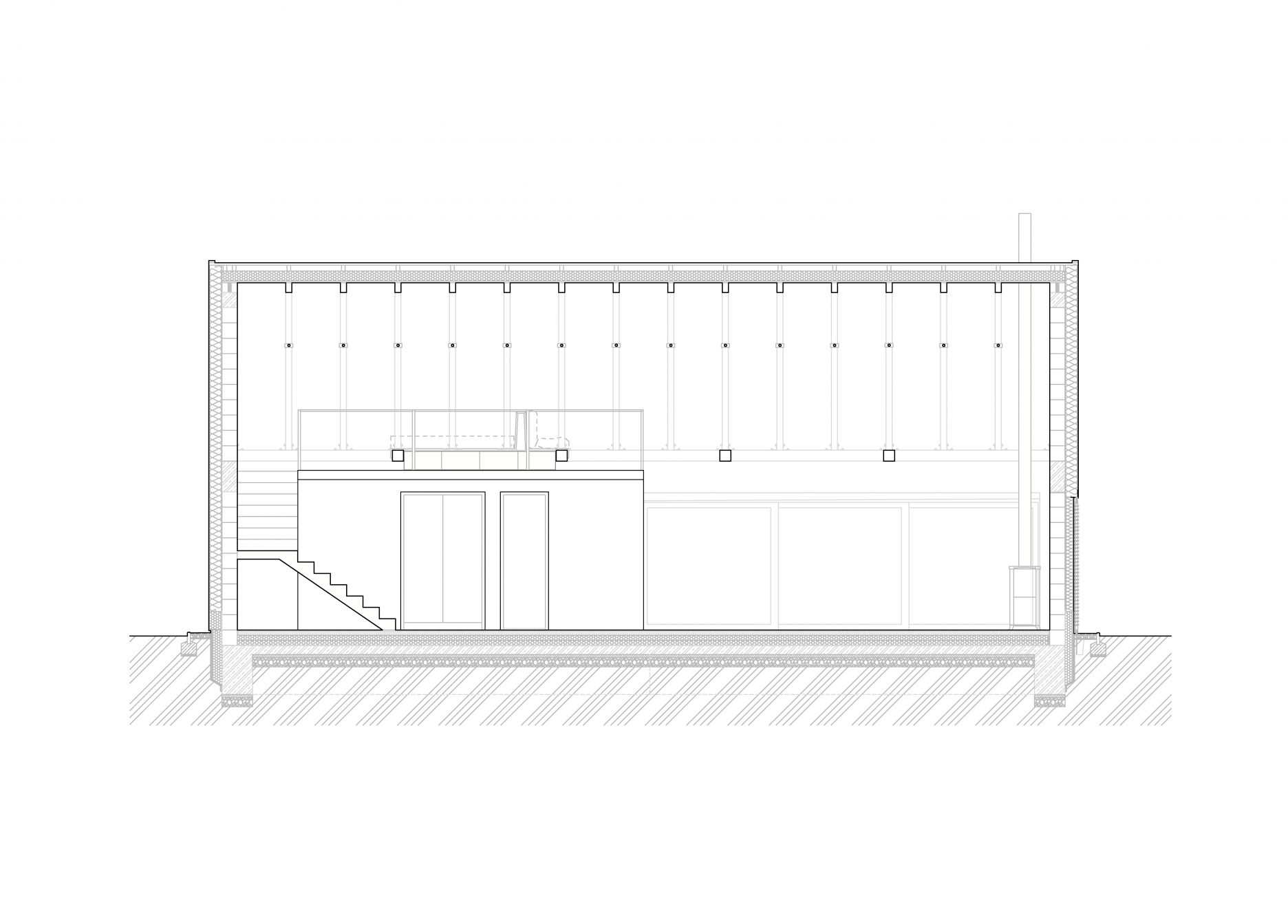 Na vrstve tvorenej murovanými stenami je uložený ŽB veniec, ktorý plní zároveň funkciu prekladov nad otvormi. Jeho dimenzia je daná minimálnym možným prierezom nad najväčším otvorom s rozponom 6,5 m. Dimenzie a výšky stavebných prvkov, a najmä strešnej konštrukcie, boli jednou z dôležitých tém projektu, kde sme sa snažili o zachovanie pekných proporcií malého jednopodlažného archetypálneho tvaru z exteriéru pri optimálnom využití výšky vo vnútri objektu. Dôležitou rovinou návrhu je tiež zachovanie jednoduchosti a jasnosti statického riešenia, ktoré je odprezentované práve v interiéri, nakoľko zvonku je to pri požiadavkách na teplotechniku komplikované.