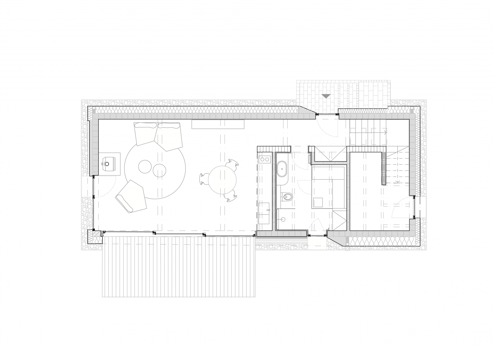Prízemie tvorí murovaná stavba, vychádzajúca z výrobných rozmerov tehly. Hlavný obytný priestor je so záhradou prepojený dvoma veľkými otvormi. Najväčší otvor je vyplnený trojicou posuvno-zdvižných okien (štvorcov), ktoré sa dajú za seba zasunúť a umožňujú tak veľkou plochou otvoriť dom do záhrady. Pri plnom otvorení vzniká dojem podobný sedeniu v záhradnom altánku, čo bolo taktiež jedným zo želaní investorov. Menší otvor v štítovom múre je rozdelený na fixnú časť a klasické balkónové dvere, ktoré umožňujú pohodlnú prevádzku počas zimy či klimatizácie.