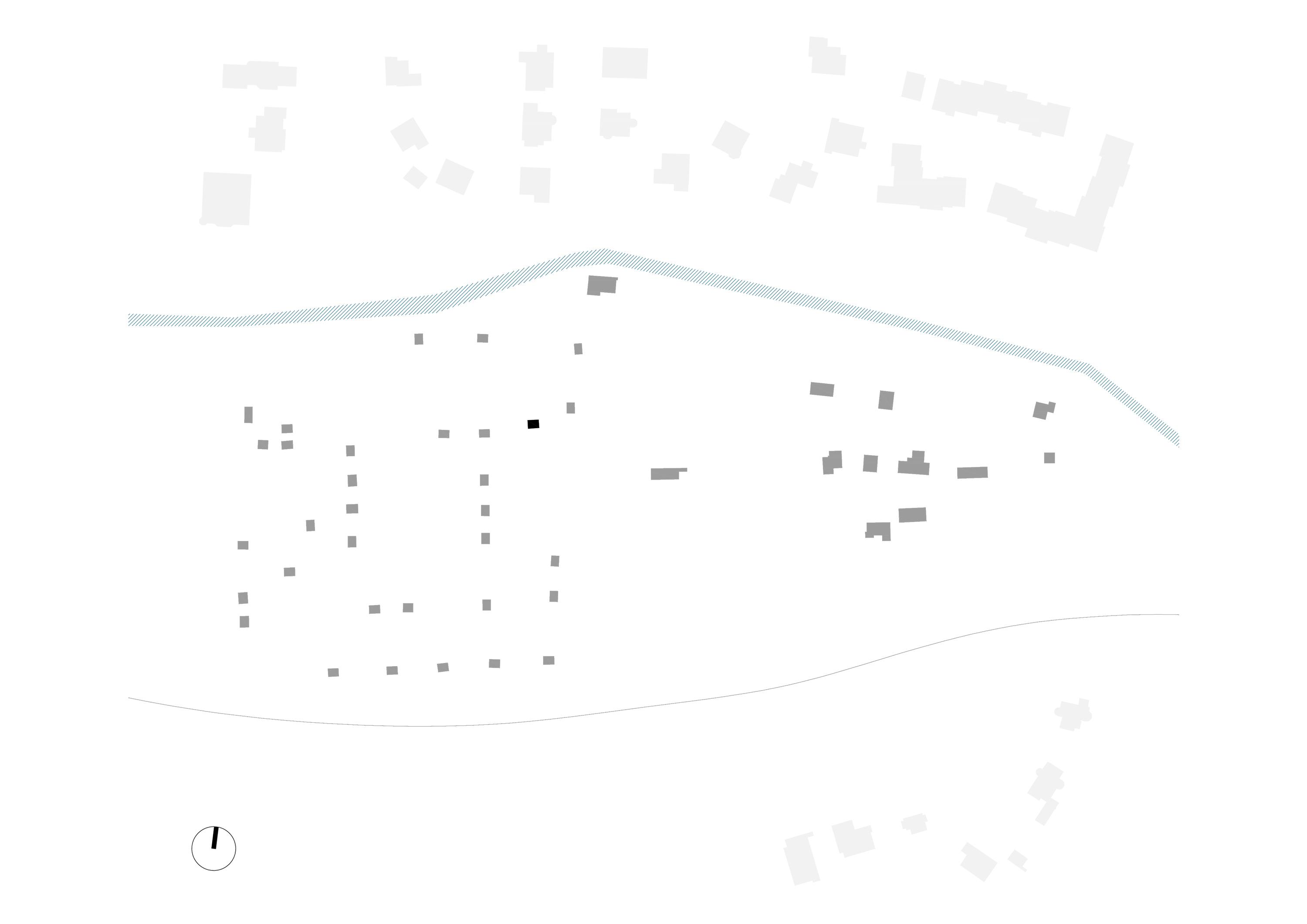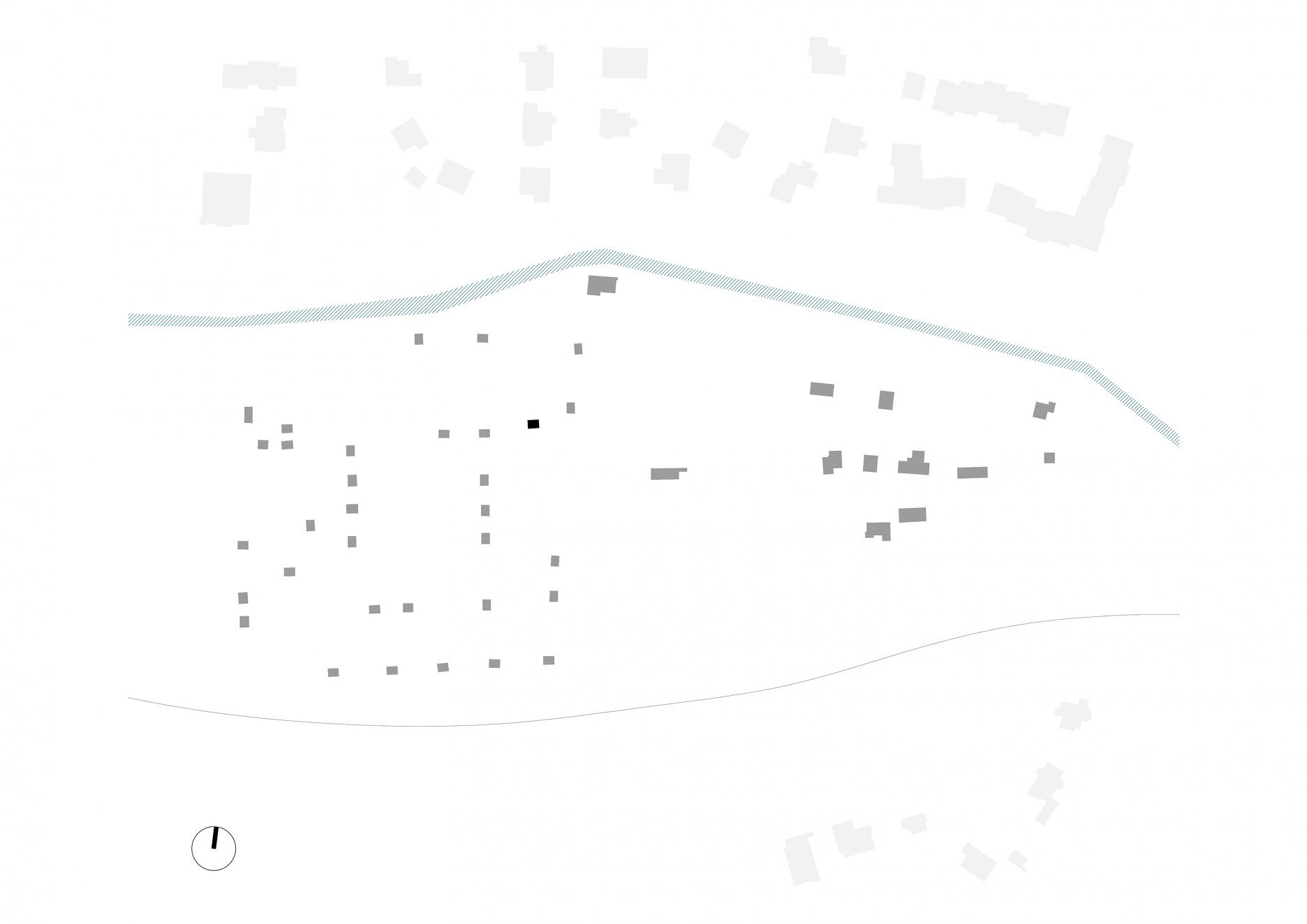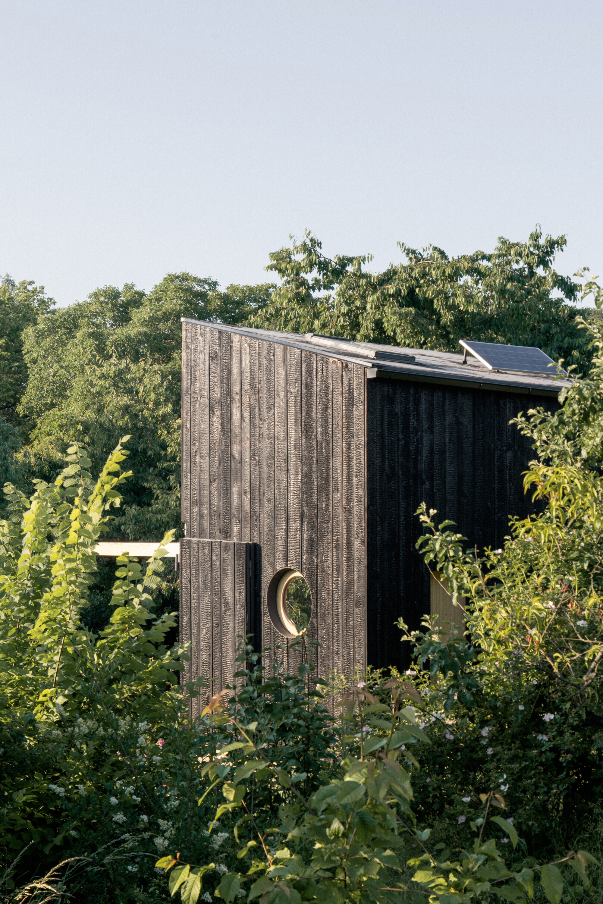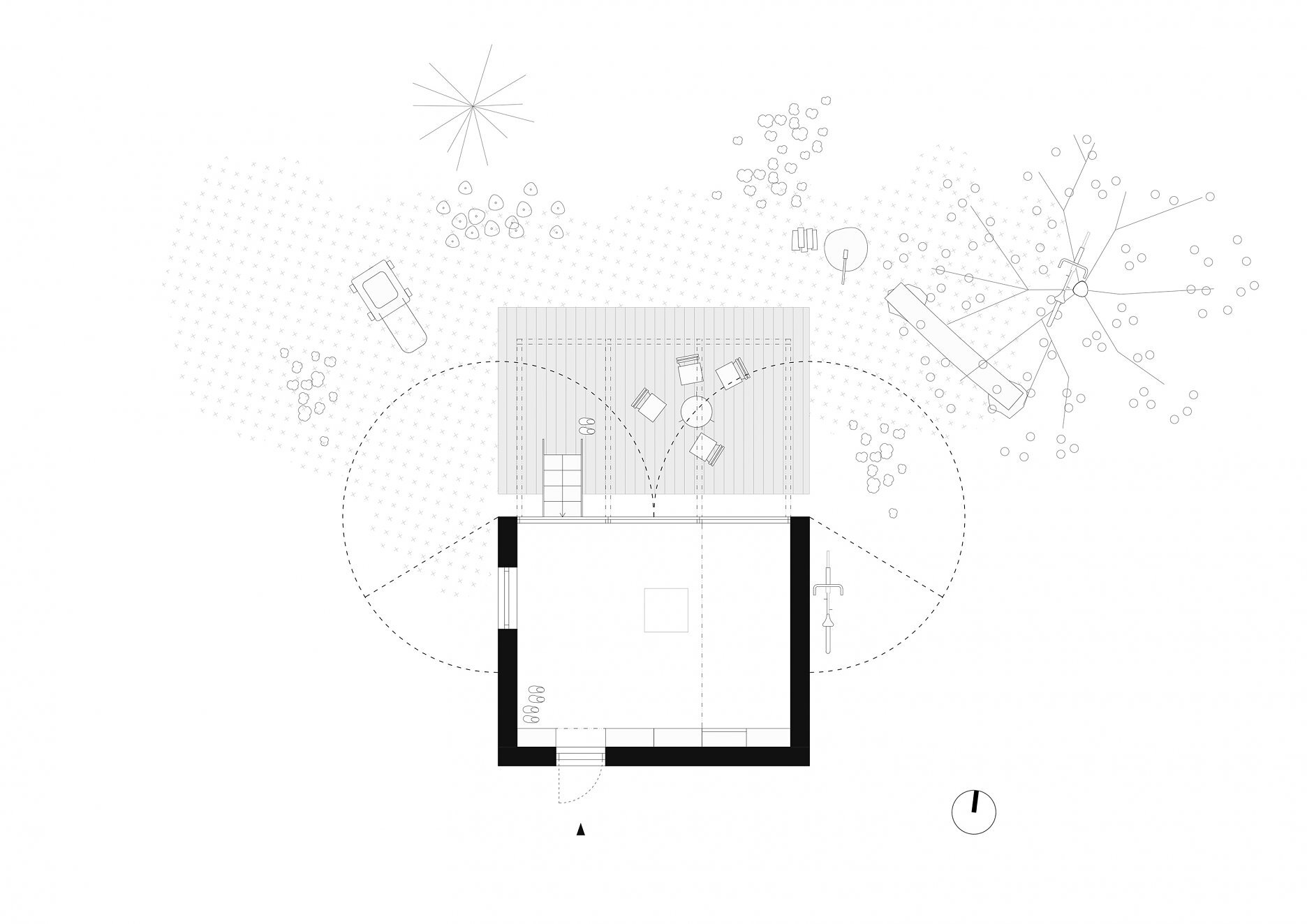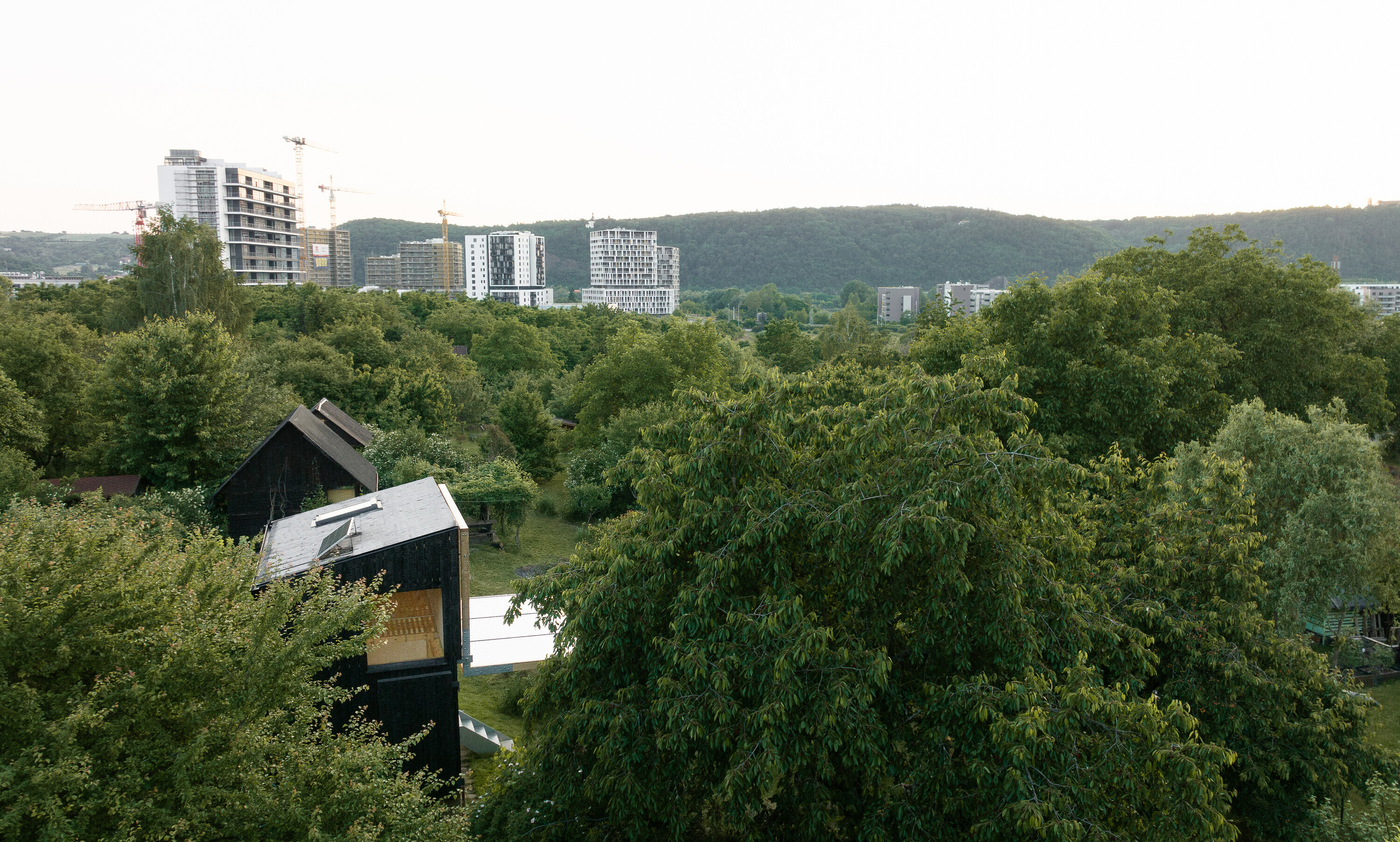 Záhradný pavilón stojí na základoch pôvodnej drevenej chatky v záhradkárskej kolónii neďaleko Vltavy. Prostredie charakterizuje okrem bohatej zelene, skleníkov a altánkov aj niekoľko ďalších drobných chatiek, ktoré slúžia poväčšine ako sklady a zázemie pre jednotlivé záhrady. "Chatky jsou si navzájem podobné, jsou povětšinou tmavé, téměř nemají okna a je jim vlastní až romanticky vyznívající nedokonalost a nepravidelnost. Charakter okolí jsme se snažili propsat i do nové stavby, která je z tmavého, opalovaného dřeva s přirozeně nepravidelnou strukturou a ve stavu se zavřenými okenicemi koresponduje s tichými objekty v okolí," približujú autori.