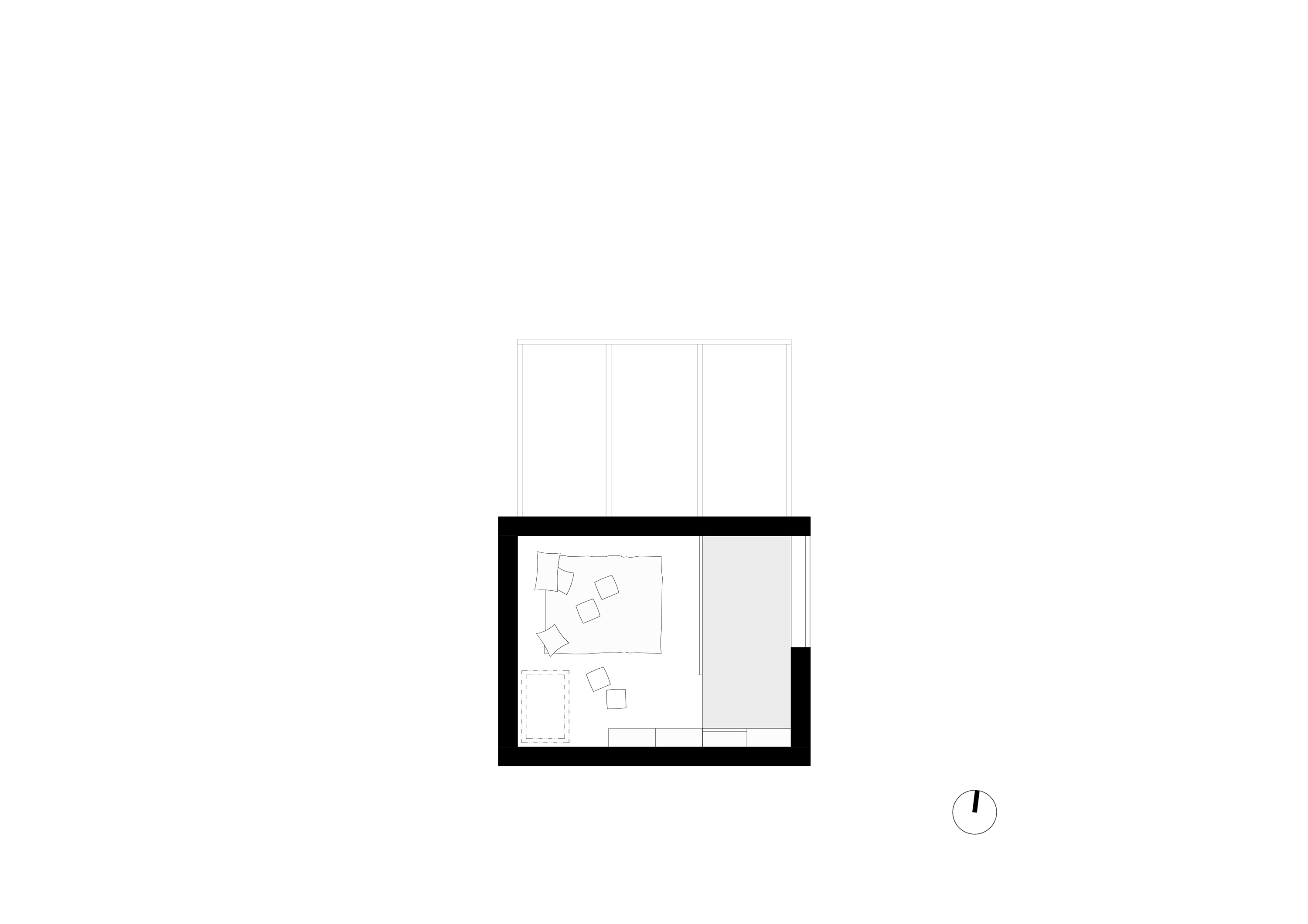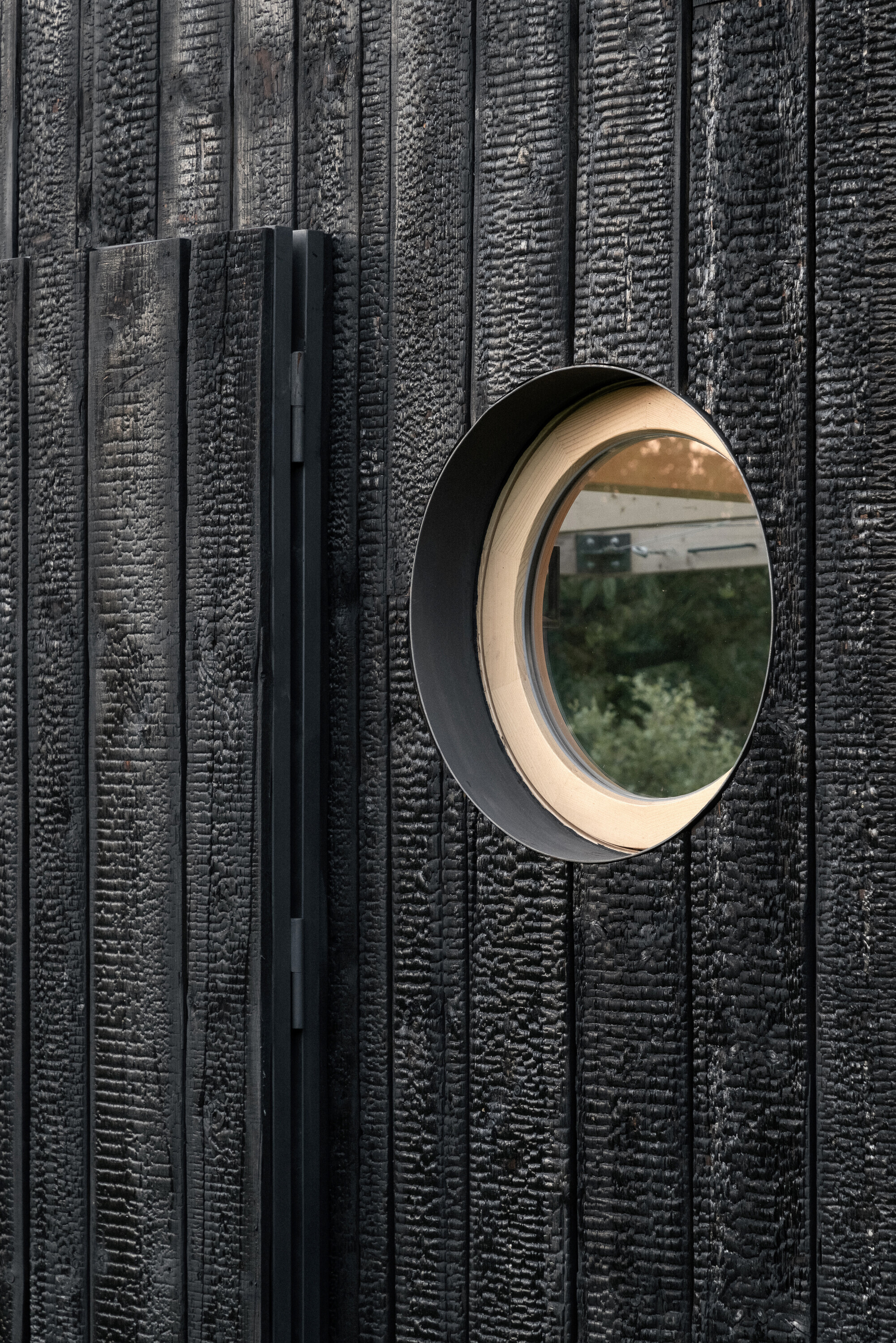 Objekt je navrhnutý ako drevostavba s konštrukčným systémom two-by-four. Výnimku z omietnutých vnútorných povrchov tvorí zadná stena s integrovanou knižnicou a rebríkom vedúcim na poschodie. Vložené konštrukcie knižnice a poschodia pôsobia subtílne a prepúšťajú denné svetlo. "Díky oknům orientovaným na tři světové strany v kombinaci s polykarbonátovým panelem se světelná nálada uvnitř stavby během dne proměňuje a i v zavřeném stavu nepůsobí vnitřní prostor stísněně," dopĺňajú architekti. Pôdorysné rozmery sú pritom minimálne - 3 x 5 m, výška objektu je necelých 5 m. Stavba nie je napojená na žiadne inžinierske siete, disponuje iba vlastným fotovoltickým panelom, ktorý pokrýva základnú spotrebu elektriny v objekte.