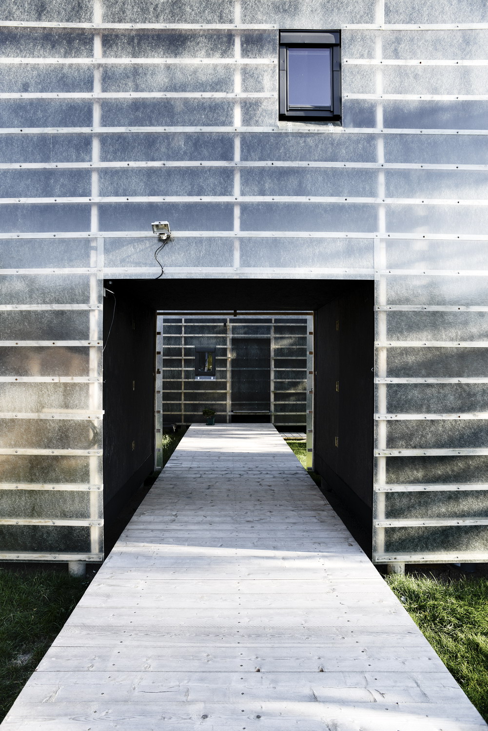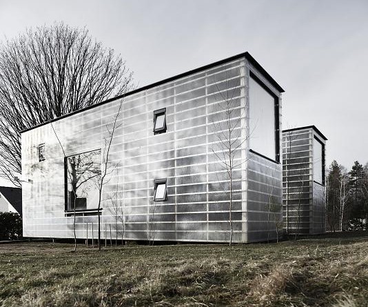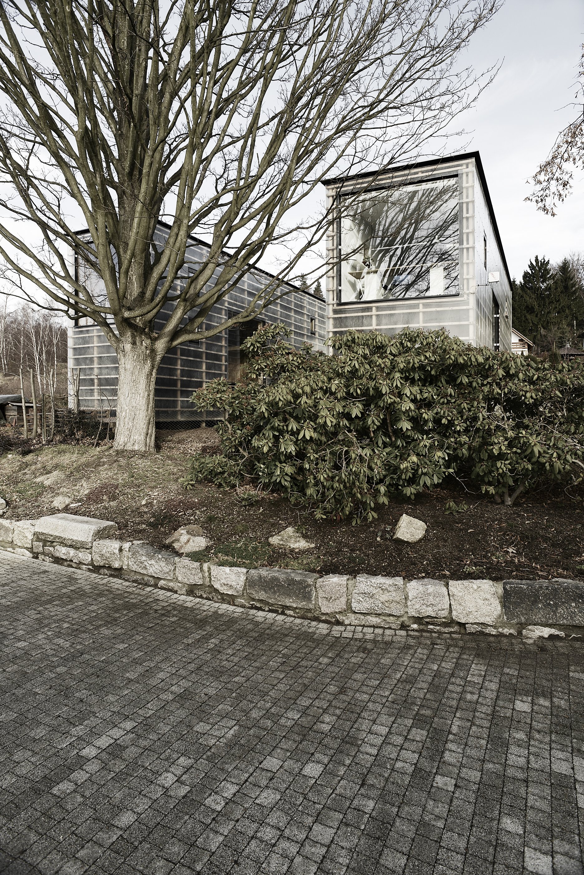 Dalším velkým experimentem byl obvodový plášť z laminátu, což je stavební materiál, který zároveň udává finální vzhled domu. Kromě snahy o snížení ceny domu materiál nabízí zastřenou transparentnost s výsledným dojmem rýžového papíru. Navíc vytváří na Liberecku tolik potřebnou větrovku ochraňující dům před rozmary počasí. Druhá kůže domu odsazená dvanáct centimetrů před vlastní dům má svůj vlastní život. V létě zabraňuje přehřívání a naopak v zimě vytváří nárazníkovou zónu před studeným větrem. Po ránu fasáda odráží sluneční paprsky nebo se naopak umí sama rozzářit.