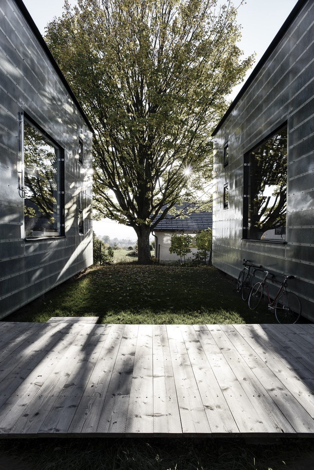 Filozofia domov je založená na úplnom zjednodušení definície bývania i výstavby. Objekty svojim obvodom určujú vnútorný priestor a sú zbavené všetkých atribútov klasického domu. V exteriéri obe hmoty vytvárajú tri vonkajšie pobytové priestory - verejný, poloverejný a súkromný. Vďaka umiestneniu na pozemku a veľkým preskleniam smerom k strategickým výhľadom je okolitá krajina neustále v zornom poli obyvateľov. Interiér nepôsobí stiesnene. Napriek vonkajšej šírke domu 3m sa vnútorný priestor plynule rozvíja smerom k výhľadom. Dobre zvládnuté proporcie domu umožňujú jedinečný priestorový zážitok. Obyvatelia majú vzájomný vizuálny kontakt aj medzi obidvomi objektmi. Vnútorné átrium sa stáva pre nich ďalšou izbou. Fasáda má pôsobiť ako jemná priesvitná vrstva, cez ktorú môžeme vnímať materialitu domu.