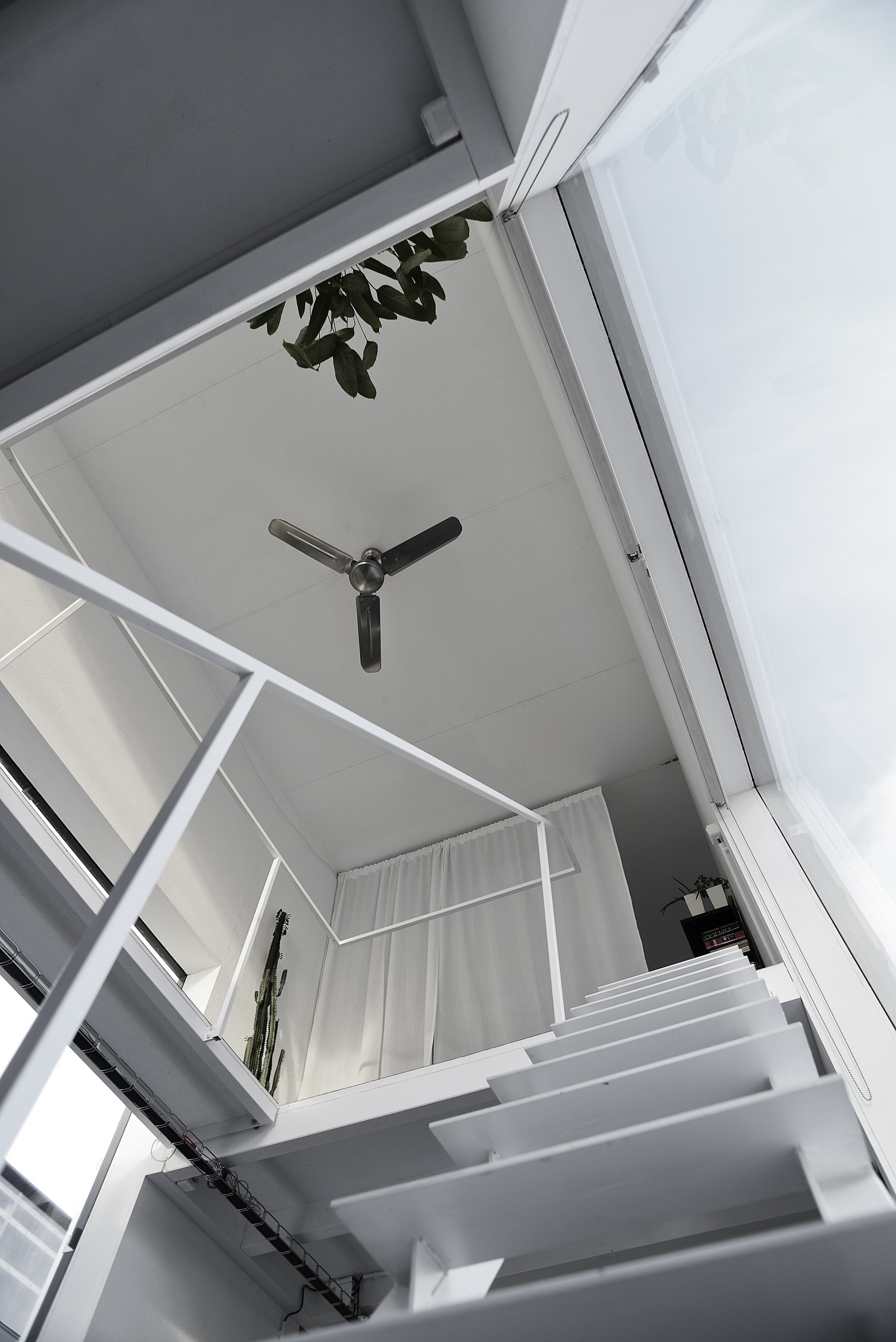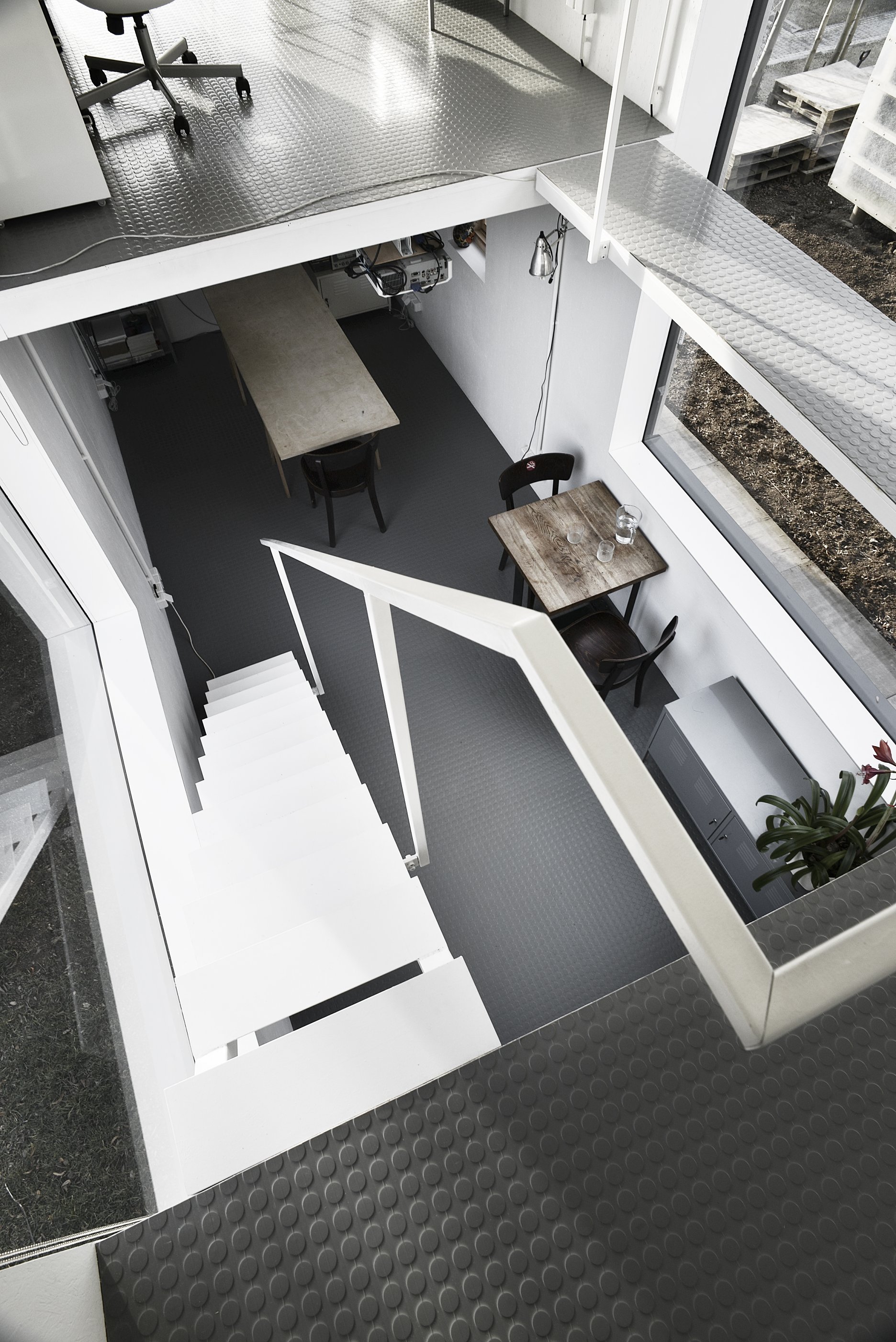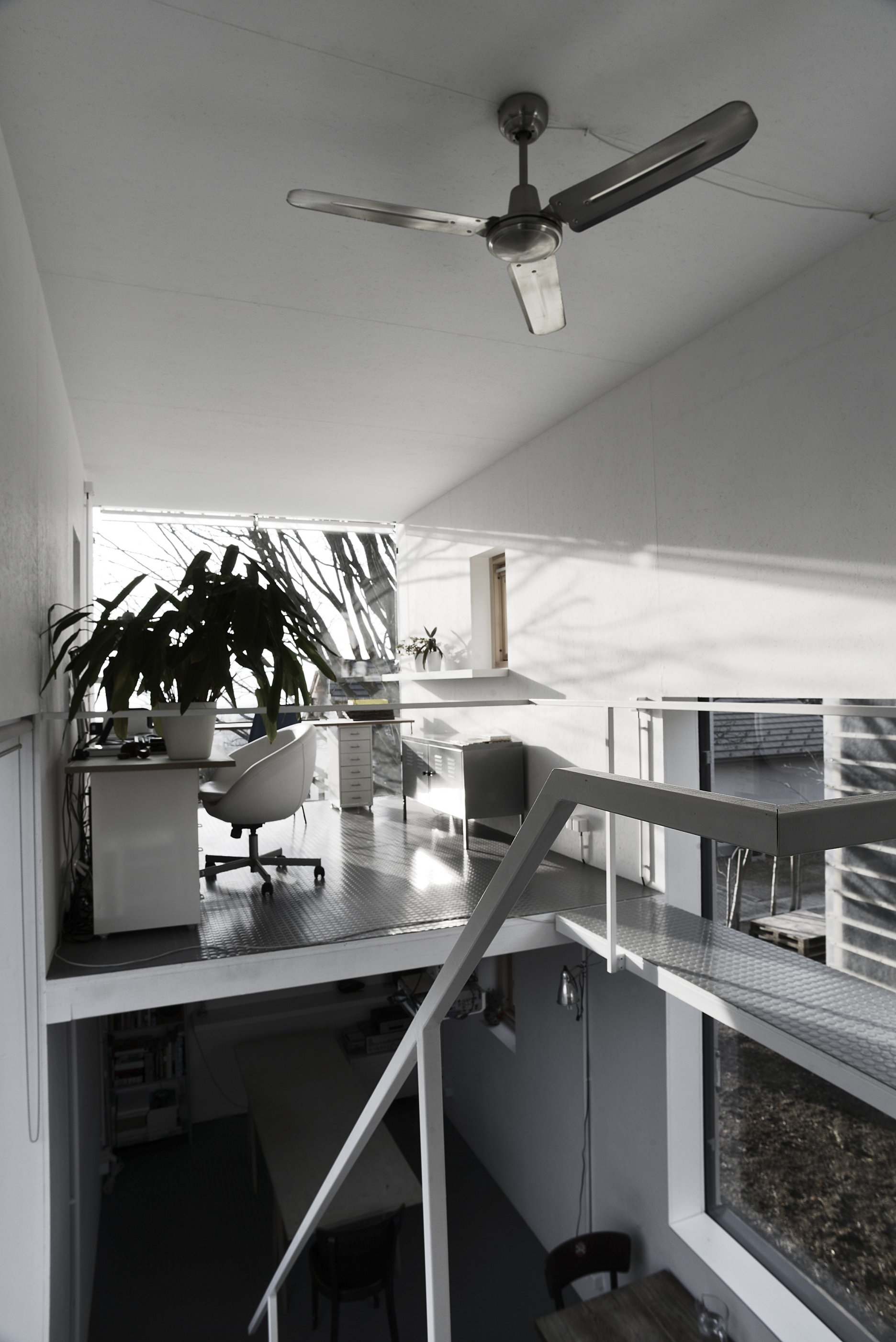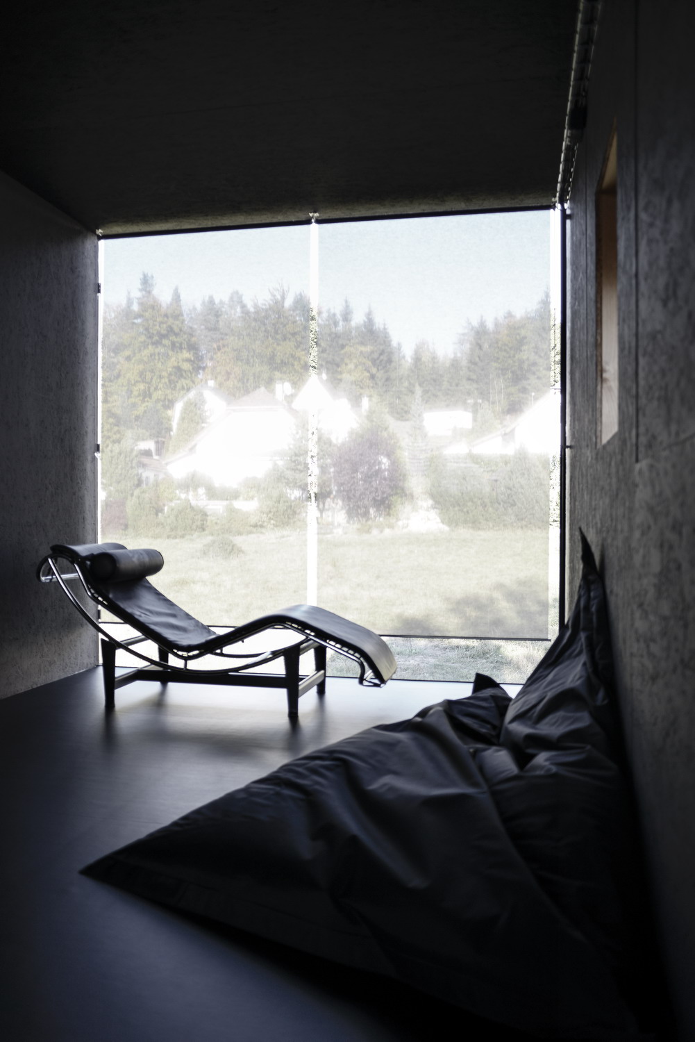 Po konstrukční a materiálové revoluci muselo přijít na řadu také nové pojetí vnitřní dispozice. Nezvyklé proporce domu postaveného na výšku ani nic jiného nepřipouštěly. Původním záměrem bylo striktně oddělit život a práci, což však, když děláte věci naplno, nikdy dobře nejde. Každý z domů nabízí necelých šedesát čtverečních metrů podlažní plochy, což je velikost bytu 2+kk. Zatímco zvenku působí oba kvádry téměř identicky, uvnitř se diametrálně liší. Bíle natřený interiér poskytuje neutrální pozadí na práci. Černě vymalovaný prostor druhého domu slouží k bydlení. Za stejných podmínek je vám v černé kostce pocitově tepleji. Matná čerň navíc stírá hranice mezi podlahou, stropem a ostěním. Za zvuků praskajícího dřeva z kamen vám dokonalá temnota rámuje přírodní scenérií na dosah ruky.