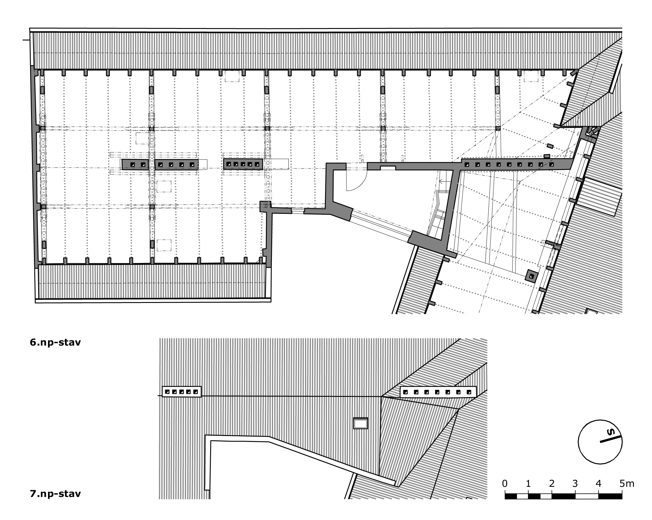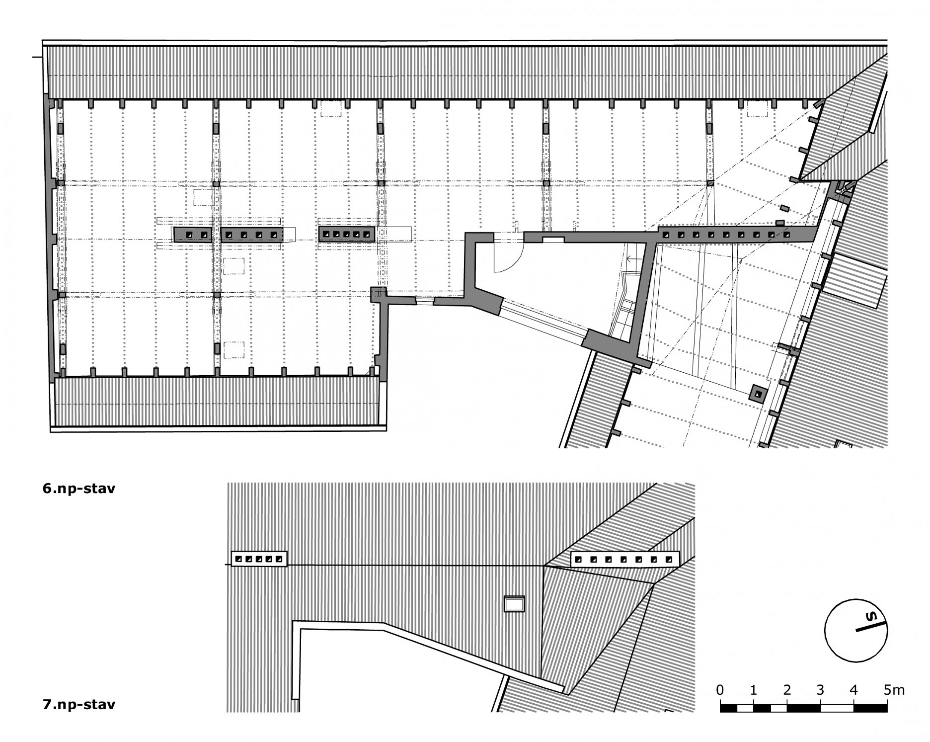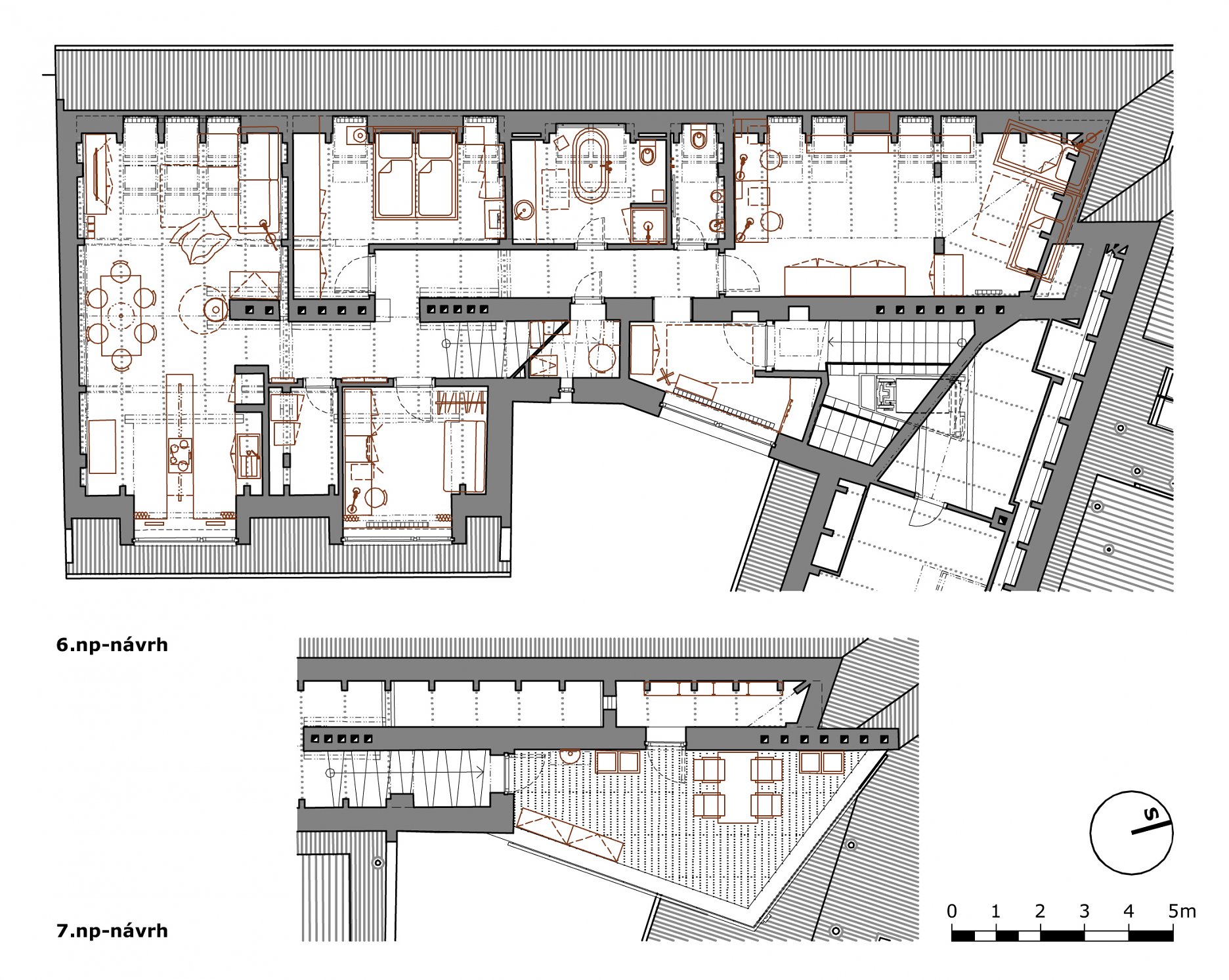 Predmetom riešenia bola povala na šiestom nadzemnom podlaží. Vzhľadom na spôsob vykurovania prináležal každému bytu v objekte vlastný komínový prieduch. Z tohto dôvodu museli všetky komínové prieduchy ostať plne funkčné. Do schodiskového zrkadla bolo potrebné vložiť nový osobný výťah. Aby sa minimalizoval zásah do uličnej fasády, bolo prípustné osadenie vikierov len zo strany dvora. Z priestoru centrálneho schodiska bolo nutné vytvoriť servisný prístup k nadstrešným častiam komínov.